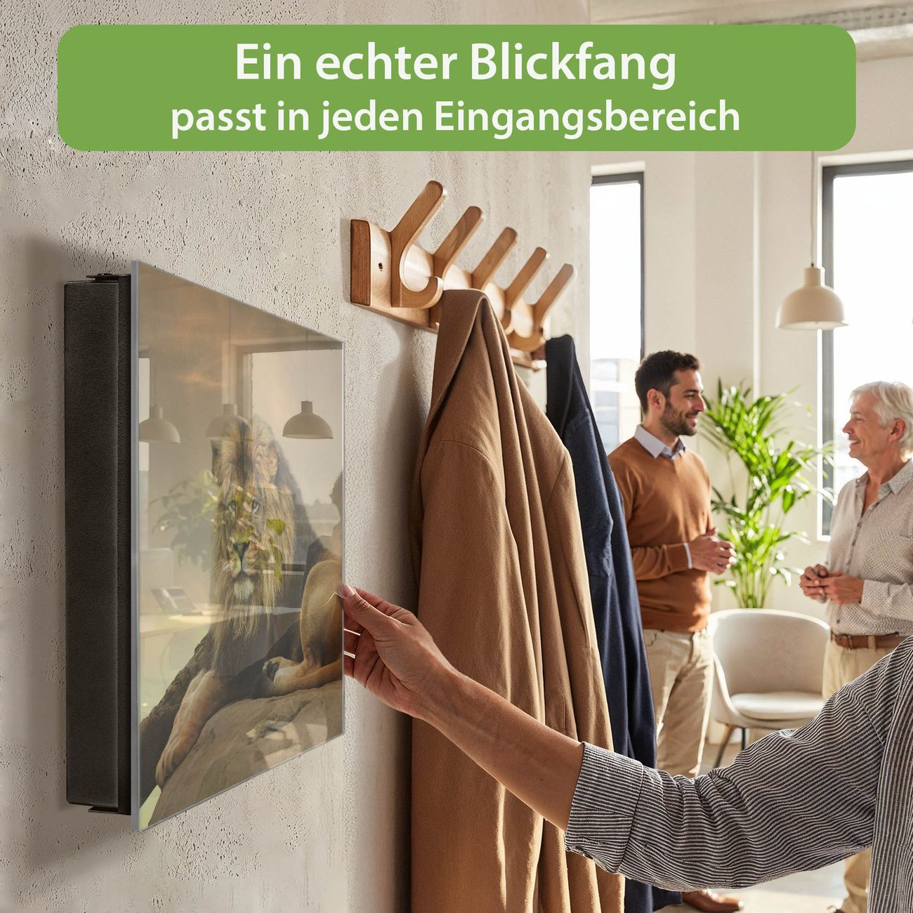 Bringe Ordnung und Eleganz in deinen Eingangsbereich mit dem banjado Schlüsselkasten Motiv Motiv Adrian. Die moderne Schlüsselbox kombiniert funktionales Design mit hochwertiger Verarbeitung und wird so zu einem echten Hingucker in Flur, Büro oder Ferienwohnung. ✅ Stilvolle Schlüsselaufbewahrung mit Glasfront im Motiv Motiv Adrian Der Design-Schlüsselkasten Motiv Motiv Adrian bietet Platz für bis zu 50 Schlüssel, die auf 5 stabilen Reihen mit je 10 Haken übersichtlich verstaut werden. Mit seinen kompakten Maßen von 30 x 30 x 5 cm passt die Schlüsselbox perfekt auch in kleinere Räume. Der schwarz lackierte Stahlkorpus mit rechts angeschlagenem Türscharnier harmoniert mit der Glasfront und fügt sich nahtlos in jedes Wohnambiente ein. Ob als Schlüsselorganizer für Zuhause oder als praktische Lösung für Büros, Praxen und Gewerbe, der banjado Schlüsselkasten sorgt für Ordnung und Übersicht. Dank der magnetischen, mit Kreidestiften beschreibbaren Glasfront kannst du Notizen anheften oder Termine direkt auf der Oberfläche festhalten. Die Schlüsselbox Motiv Motiv Adrian zur Wandmontage wird inklusive Befestigungsmaterial geliefert und ist schnell angebracht. So hast du deine Schlüssel jederzeit griffbereit und zugleich stilvoll verstaut. Mit diesem banjado Schlüsselkasten Motiv Motiv Adrian kombinierst du praktische Aufbewahrung mit stilvollem Wohndesign. Ob privat oder geschäftlich, die Schlüsselbox sorgt für mehr Ordnung, Übersicht und ein wohnliches Ambiente.Vorteile im Überblick