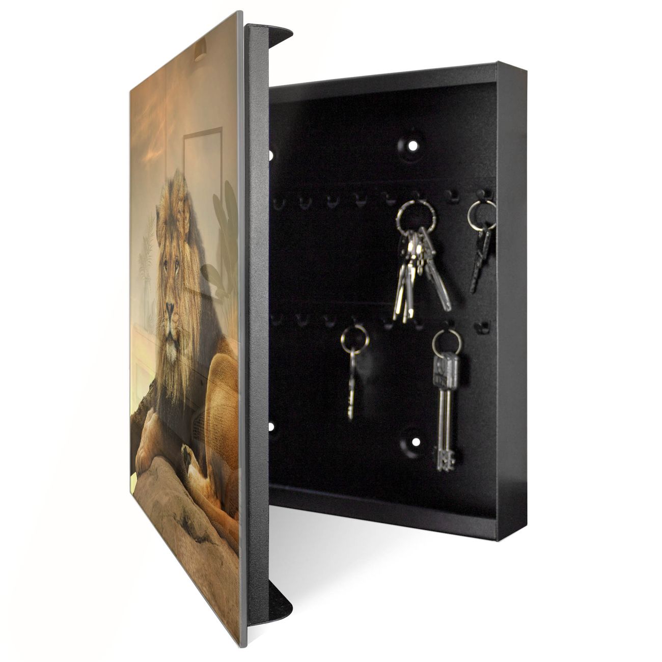 Bringe Ordnung und Eleganz in deinen Eingangsbereich mit dem banjado Schlüsselkasten Motiv Motiv Adrian. Die moderne Schlüsselbox kombiniert funktionales Design mit hochwertiger Verarbeitung und wird so zu einem echten Hingucker in Flur, Büro oder Ferienwohnung. ✅ Stilvolle Schlüsselaufbewahrung mit Glasfront im Motiv Motiv Adrian Der Design-Schlüsselkasten Motiv Motiv Adrian bietet Platz für bis zu 50 Schlüssel, die auf 5 stabilen Reihen mit je 10 Haken übersichtlich verstaut werden. Mit seinen kompakten Maßen von 30 x 30 x 5 cm passt die Schlüsselbox perfekt auch in kleinere Räume. Der schwarz lackierte Stahlkorpus mit rechts angeschlagenem Türscharnier harmoniert mit der Glasfront und fügt sich nahtlos in jedes Wohnambiente ein. Ob als Schlüsselorganizer für Zuhause oder als praktische Lösung für Büros, Praxen und Gewerbe, der banjado Schlüsselkasten sorgt für Ordnung und Übersicht. Dank der magnetischen, mit Kreidestiften beschreibbaren Glasfront kannst du Notizen anheften oder Termine direkt auf der Oberfläche festhalten. Die Schlüsselbox Motiv Motiv Adrian zur Wandmontage wird inklusive Befestigungsmaterial geliefert und ist schnell angebracht. So hast du deine Schlüssel jederzeit griffbereit und zugleich stilvoll verstaut. Mit diesem banjado Schlüsselkasten Motiv Motiv Adrian kombinierst du praktische Aufbewahrung mit stilvollem Wohndesign. Ob privat oder geschäftlich, die Schlüsselbox sorgt für mehr Ordnung, Übersicht und ein wohnliches Ambiente.Vorteile im Überblick
