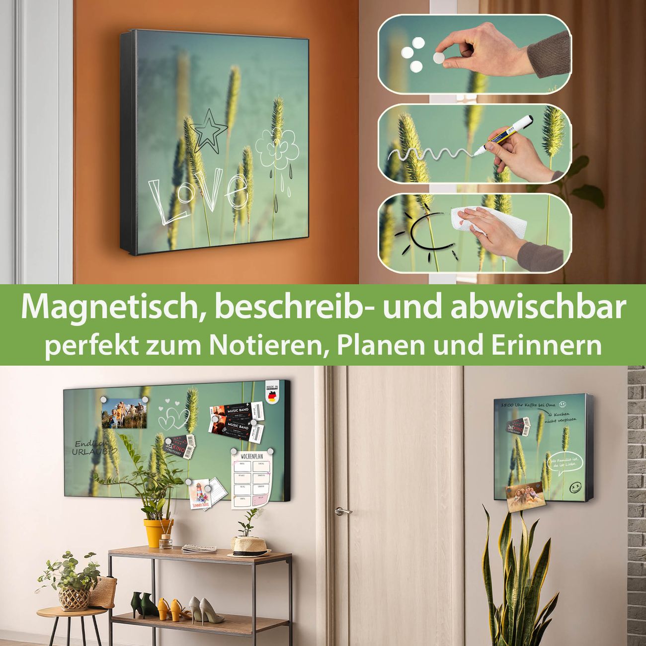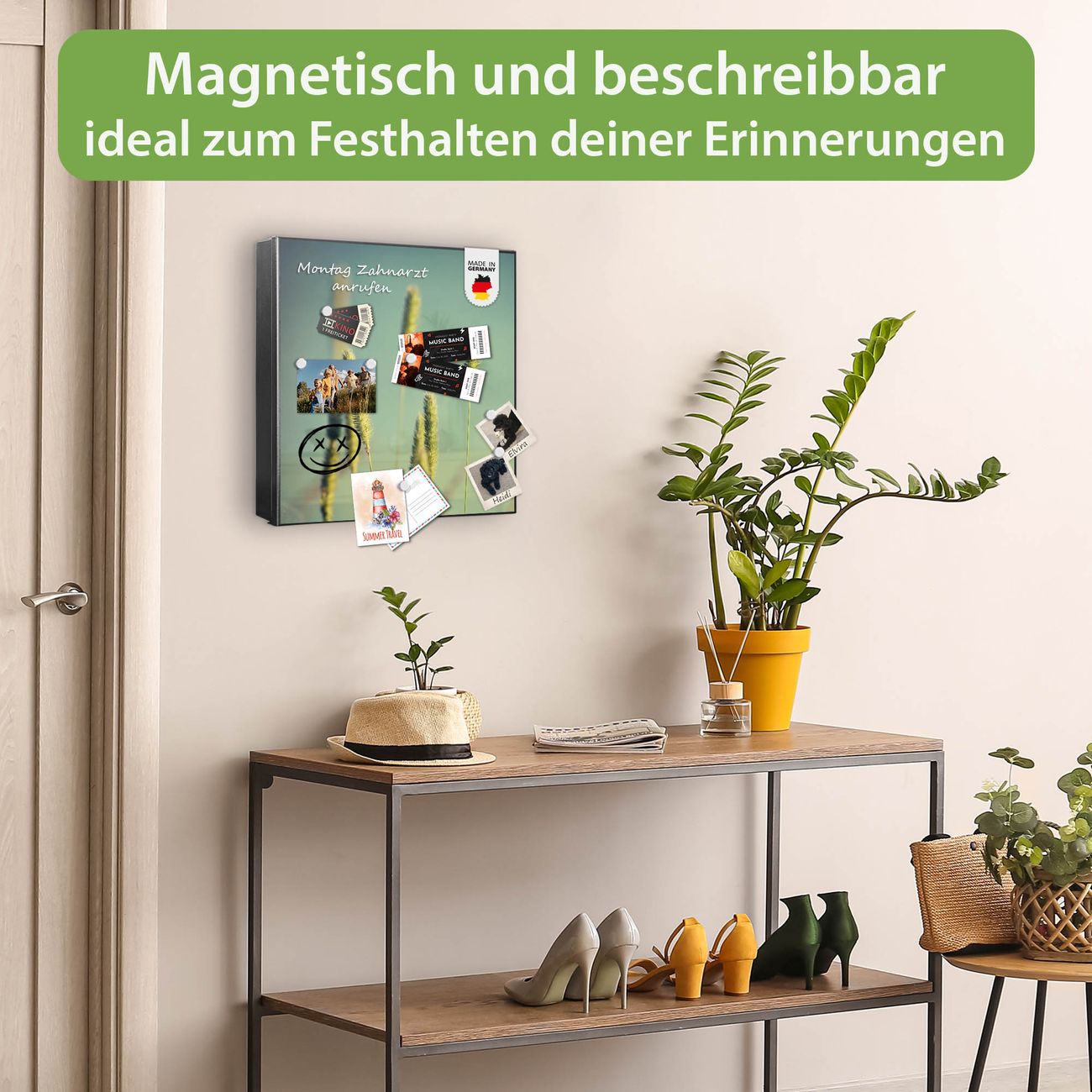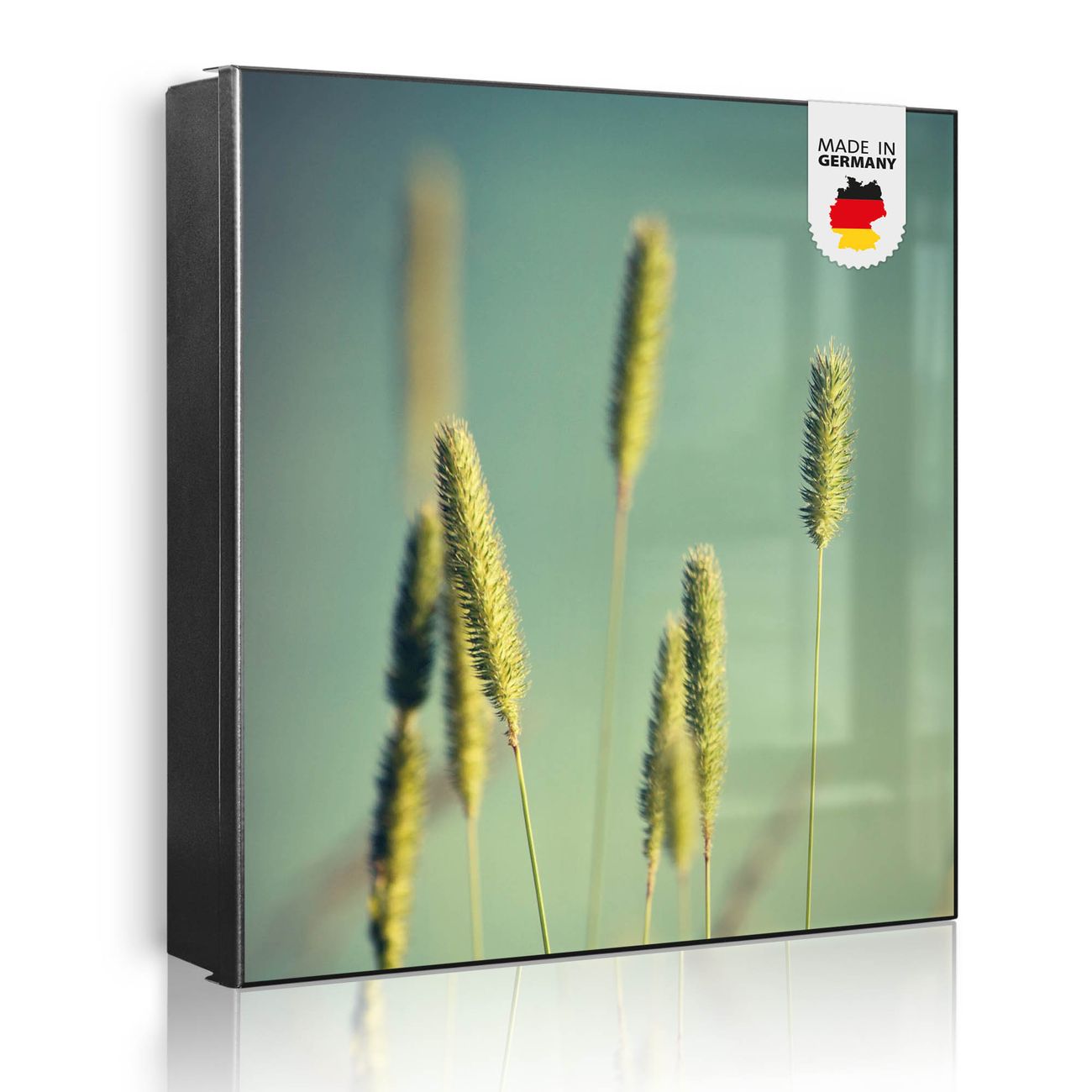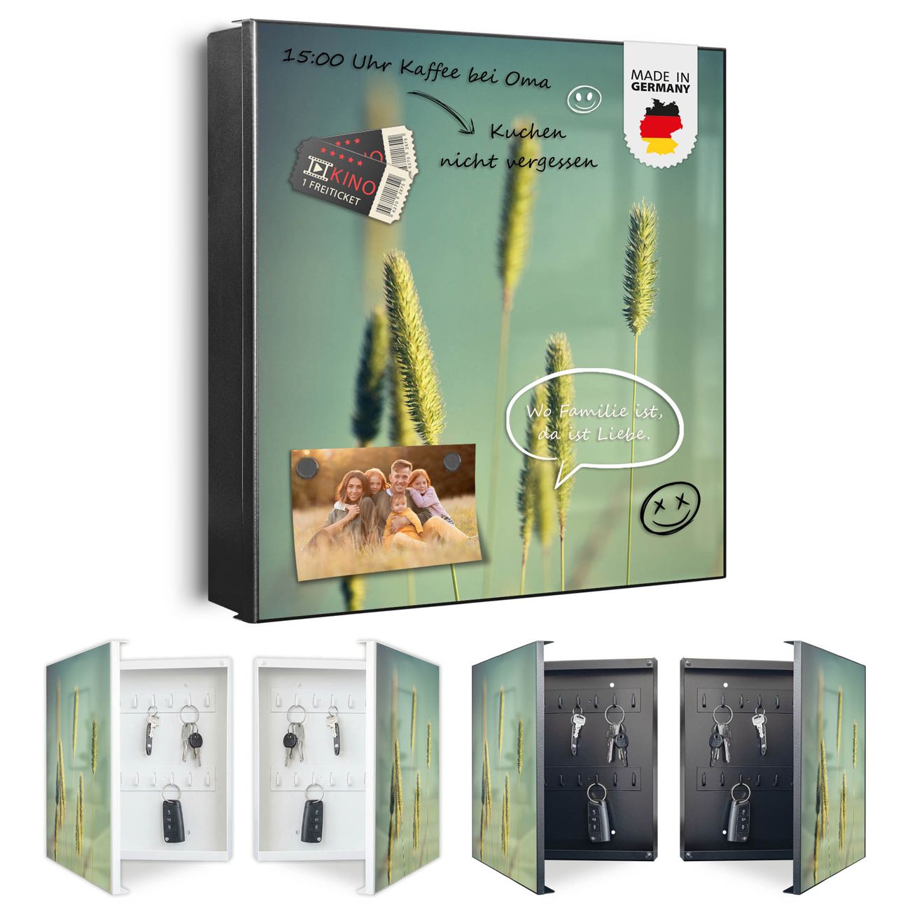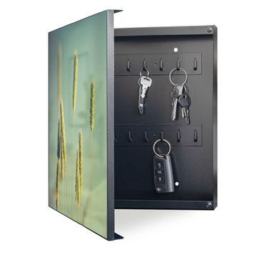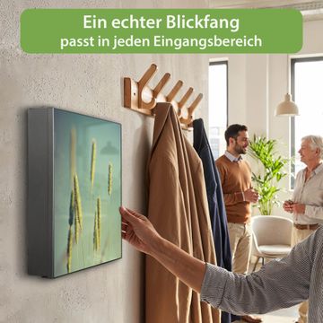Bringe Ordnung und Eleganz in deinen Eingangsbereich mit dem banjado Schlüsselkasten Motiv Motiv Ähren. Die moderne Schlüsselbox kombiniert funktionales Design mit hochwertiger Verarbeitung und wird so zu einem echten Hingucker in Flur, Büro oder Ferienwohnung. ✅ Stilvolle Schlüsselaufbewahrung mit Motiv Motiv Ähren Der Design-Schlüsselkasten Motiv Motiv Ähren bietet Platz für bis zu 32 Schlüssel, die auf 4 stabilen Reihen mit je 8 Haken übersichtlich verstaut werden. Mit seinen kompakten Maßen von 30 x 30 x 5 cm passt die Schlüsselbox perfekt auch in kleinere Räume. Der schwarz lackierte Stahlkorpus mit links angeschlagenem Türscharnier harmoniert mit gedruckten Folie auf der Front und fügt sich nahtlos in jedes Wohnambiente ein. Ob als Schlüsselorganizer für Zuhause oder als praktische Lösung für Büros, Praxen und Gewerbe, der banjado Schlüsselkasten sorgt für Ordnung und Übersicht. Dank der magnetischen, mit Kreidestiften beschreibbaren Folie auf der Front kannst du Notizen anheften oder Termine direkt auf der Oberfläche festhalten. Die Schlüsselbox Motiv Motiv Ähren zur Wandmontage wird inklusive Befestigungsmaterial geliefert und ist schnell angebracht. So hast du deine Schlüssel jederzeit griffbereit und zugleich stilvoll verstaut. Mit diesem banjado Schlüsselkasten Motiv Motiv Ähren kombinierst du praktische Aufbewahrung mit stilvollem Wohndesign. Ob privat oder geschäftlich, die Schlüsselbox sorgt für mehr Ordnung, Übersicht und ein wohnliches Ambiente.Vorteile im Überblick