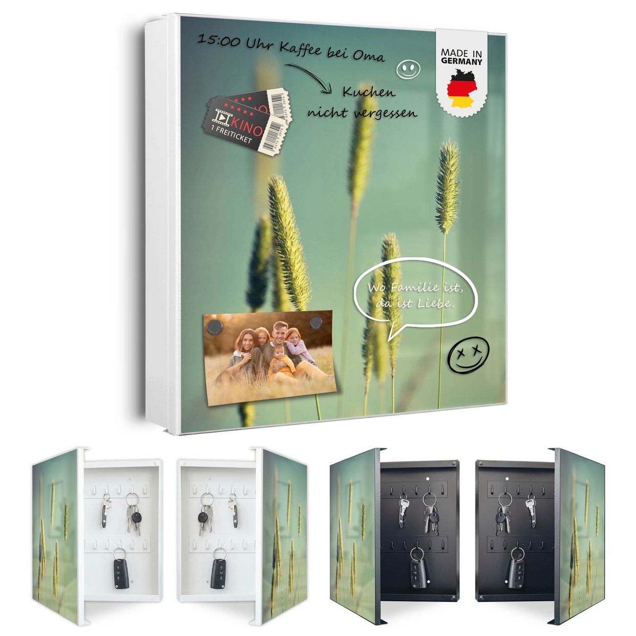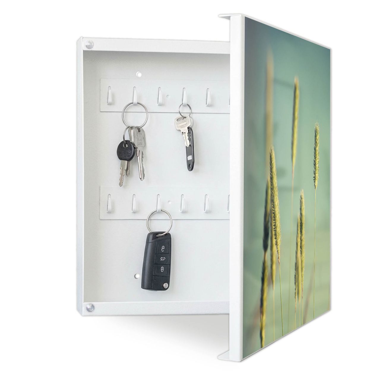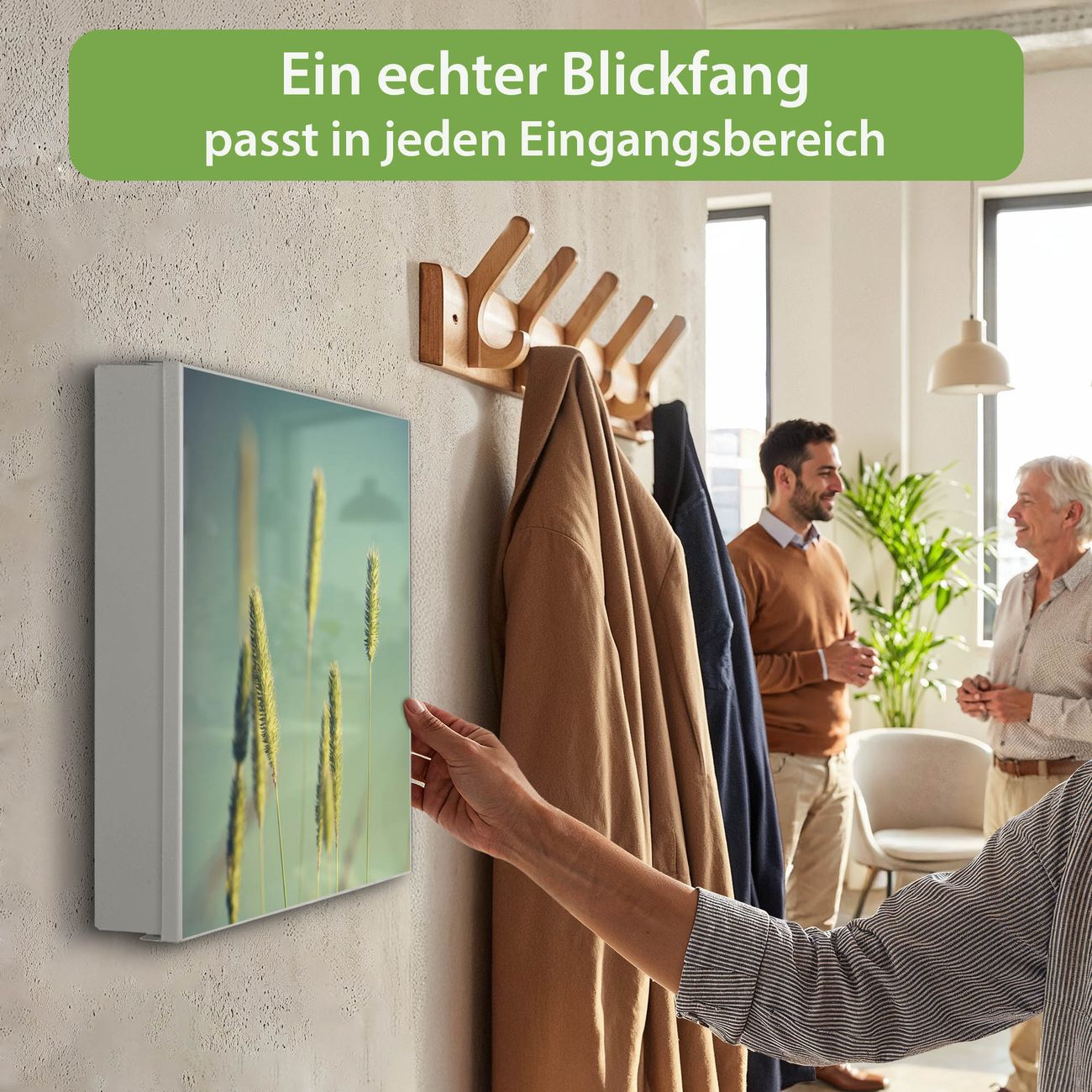 Bringe Ordnung und Eleganz in deinen Eingangsbereich mit dem banjado Schlüsselkasten Motiv Motiv Ähren. Die moderne Schlüsselbox kombiniert funktionales Design mit hochwertiger Verarbeitung und wird so zu einem echten Hingucker in Flur, Büro oder Ferienwohnung. ✅ Stilvolle Schlüsselaufbewahrung mit Motiv Motiv Ähren Der Design-Schlüsselkasten Motiv Motiv Ähren bietet Platz für bis zu 32 Schlüssel, die auf 4 stabilen Reihen mit je 8 Haken übersichtlich verstaut werden. Mit seinen kompakten Maßen von 30 x 30 x 5 cm passt die Schlüsselbox perfekt auch in kleinere Räume. Der weiß lackierte Stahlkorpus mit rechts angeschlagenem Türscharnier harmoniert mit gedruckten Folie auf der Front und fügt sich nahtlos in jedes Wohnambiente ein. Ob als Schlüsselorganizer für Zuhause oder als praktische Lösung für Büros, Praxen und Gewerbe, der banjado Schlüsselkasten sorgt für Ordnung und Übersicht. Dank der magnetischen, mit Kreidestiften beschreibbaren Folie auf der Front kannst du Notizen anheften oder Termine direkt auf der Oberfläche festhalten. Die Schlüsselbox Motiv Motiv Ähren zur Wandmontage wird inklusive Befestigungsmaterial geliefert und ist schnell angebracht. So hast du deine Schlüssel jederzeit griffbereit und zugleich stilvoll verstaut. Mit diesem banjado Schlüsselkasten Motiv Motiv Ähren kombinierst du praktische Aufbewahrung mit stilvollem Wohndesign. Ob privat oder geschäftlich, die Schlüsselbox sorgt für mehr Ordnung, Übersicht und ein wohnliches Ambiente.Vorteile im Überblick