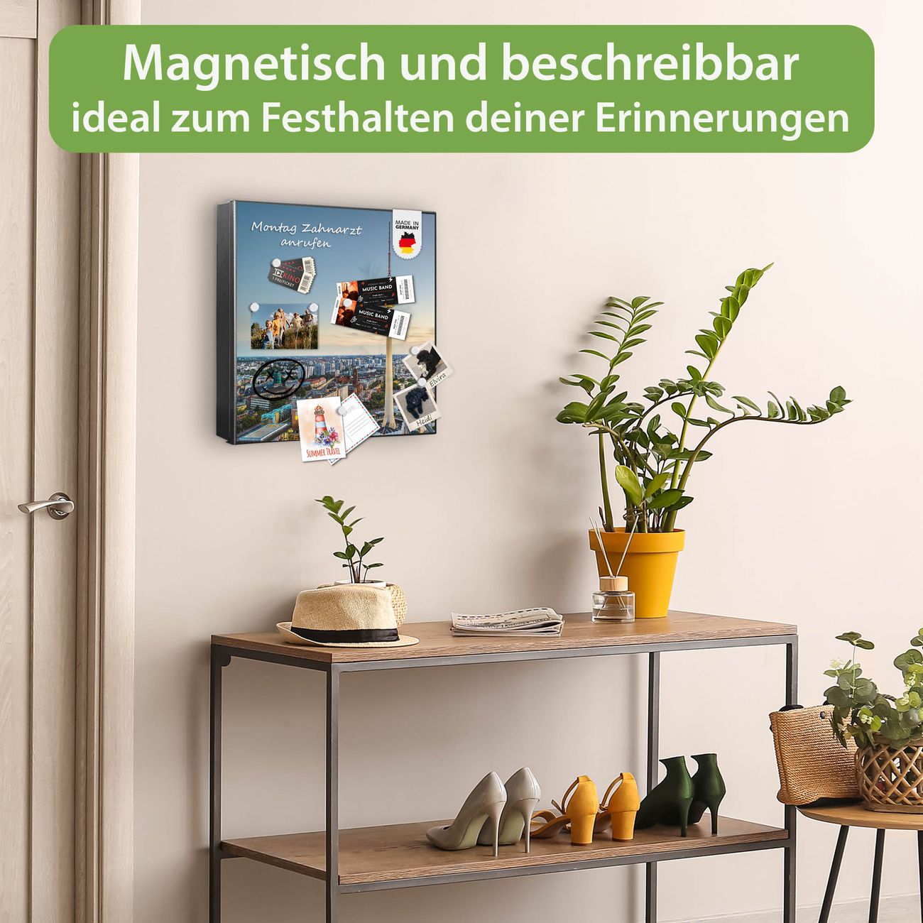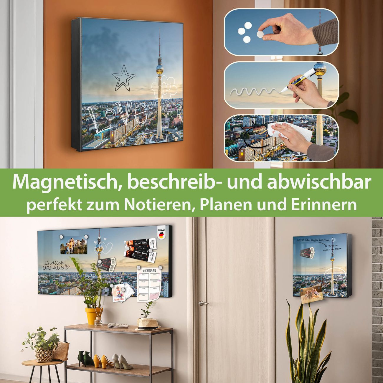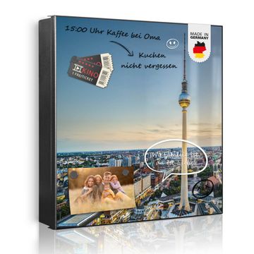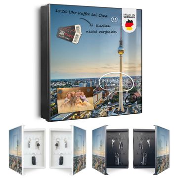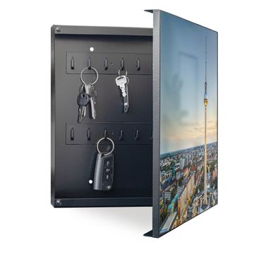 Bringe Ordnung und Eleganz in deinen Eingangsbereich mit dem banjado Schlüsselkasten Motiv Motiv Alexanderplatz. Die moderne Schlüsselbox kombiniert funktionales Design mit hochwertiger Verarbeitung und wird so zu einem echten Hingucker in Flur, Büro oder Ferienwohnung. ✅ Stilvolle Schlüsselaufbewahrung mit Motiv Motiv Alexanderplatz Der Design-Schlüsselkasten Motiv Motiv Alexanderplatz bietet Platz für bis zu 32 Schlüssel, die auf 4 stabilen Reihen mit je 8 Haken übersichtlich verstaut werden. Mit seinen kompakten Maßen von 30 x 30 x 5 cm passt die Schlüsselbox perfekt auch in kleinere Räume. Der schwarz lackierte Stahlkorpus mit rechts angeschlagenem Türscharnier harmoniert mit gedruckten Folie auf der Front und fügt sich nahtlos in jedes Wohnambiente ein. Ob als Schlüsselorganizer für Zuhause oder als praktische Lösung für Büros, Praxen und Gewerbe, der banjado Schlüsselkasten sorgt für Ordnung und Übersicht. Dank der magnetischen, mit Kreidestiften beschreibbaren Folie auf der Front kannst du Notizen anheften oder Termine direkt auf der Oberfläche festhalten. Die Schlüsselbox Motiv Motiv Alexanderplatz zur Wandmontage wird inklusive Befestigungsmaterial geliefert und ist schnell angebracht. So hast du deine Schlüssel jederzeit griffbereit und zugleich stilvoll verstaut. Mit diesem banjado Schlüsselkasten Motiv Motiv Alexanderplatz kombinierst du praktische Aufbewahrung mit stilvollem Wohndesign. Ob privat oder geschäftlich, die Schlüsselbox sorgt für mehr Ordnung, Übersicht und ein wohnliches Ambiente.Vorteile im Überblick