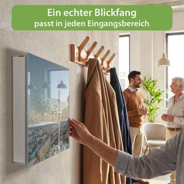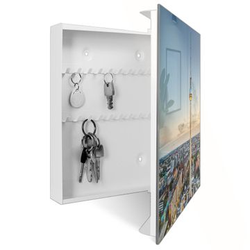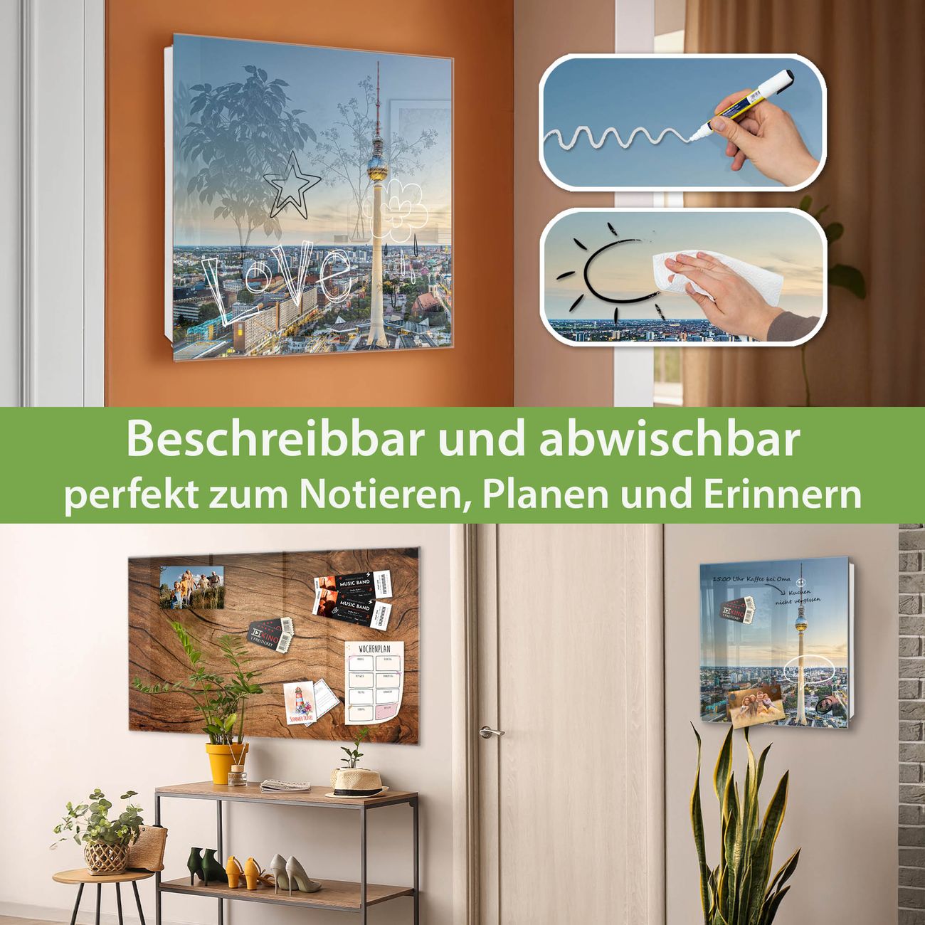 Bringe Ordnung und Eleganz in deinen Eingangsbereich mit dem banjado Schlüsselkasten Motiv Motiv Alexanderplatz. Die moderne Schlüsselbox kombiniert funktionales Design mit hochwertiger Verarbeitung und wird so zu einem echten Hingucker in Flur, Büro oder Ferienwohnung. ✅ Stilvolle Schlüsselaufbewahrung mit Glasfront im Motiv Motiv Alexanderplatz Der Design-Schlüsselkasten Motiv Motiv Alexanderplatz bietet Platz für bis zu 50 Schlüssel, die auf 5 stabilen Reihen mit je 10 Haken übersichtlich verstaut werden. Mit seinen kompakten Maßen von 30 x 30 x 5 cm passt die Schlüsselbox perfekt auch in kleinere Räume. Der weiß lackierte Stahlkorpus mit rechts angeschlagenem Türscharnier harmoniert mit der Glasfront und fügt sich nahtlos in jedes Wohnambiente ein. Ob als Schlüsselorganizer für Zuhause oder als praktische Lösung für Büros, Praxen und Gewerbe, der banjado Schlüsselkasten sorgt für Ordnung und Übersicht. Dank der magnetischen, mit Kreidestiften beschreibbaren Glasfront kannst du Notizen anheften oder Termine direkt auf der Oberfläche festhalten. Die Schlüsselbox Motiv Motiv Alexanderplatz zur Wandmontage wird inklusive Befestigungsmaterial geliefert und ist schnell angebracht. So hast du deine Schlüssel jederzeit griffbereit und zugleich stilvoll verstaut. Mit diesem banjado Schlüsselkasten Motiv Motiv Alexanderplatz kombinierst du praktische Aufbewahrung mit stilvollem Wohndesign. Ob privat oder geschäftlich, die Schlüsselbox sorgt für mehr Ordnung, Übersicht und ein wohnliches Ambiente.Vorteile im Überblick