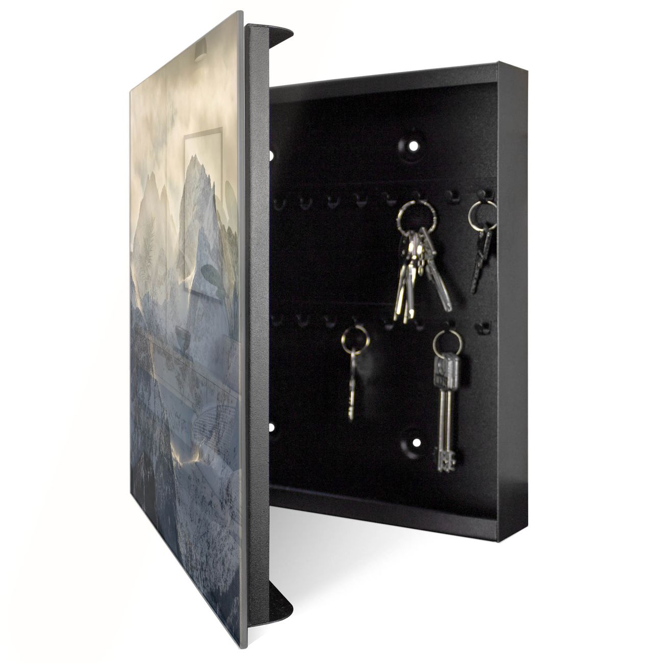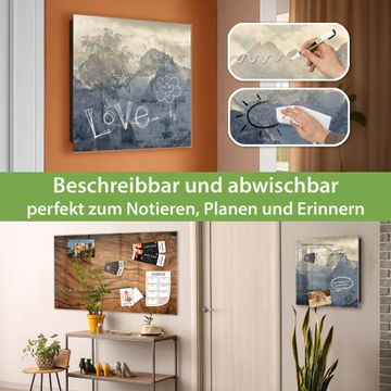 Bringe Ordnung und Eleganz in deinen Eingangsbereich mit dem banjado Schlüsselkasten Motiv Motiv Alpen im Sonnenschein. Die moderne Schlüsselbox kombiniert funktionales Design mit hochwertiger Verarbeitung und wird so zu einem echten Hingucker in Flur, Büro oder Ferienwohnung. ✅ Stilvolle Schlüsselaufbewahrung mit Glasfront im Motiv Motiv Alpen im Sonnenschein Der Design-Schlüsselkasten Motiv Motiv Alpen im Sonnenschein bietet Platz für bis zu 50 Schlüssel, die auf 5 stabilen Reihen mit je 10 Haken übersichtlich verstaut werden. Mit seinen kompakten Maßen von 30 x 30 x 5 cm passt die Schlüsselbox perfekt auch in kleinere Räume. Der schwarz lackierte Stahlkorpus mit rechts angeschlagenem Türscharnier harmoniert mit der Glasfront und fügt sich nahtlos in jedes Wohnambiente ein. Ob als Schlüsselorganizer für Zuhause oder als praktische Lösung für Büros, Praxen und Gewerbe, der banjado Schlüsselkasten sorgt für Ordnung und Übersicht. Dank der magnetischen, mit Kreidestiften beschreibbaren Glasfront kannst du Notizen anheften oder Termine direkt auf der Oberfläche festhalten. Die Schlüsselbox Motiv Motiv Alpen im Sonnenschein zur Wandmontage wird inklusive Befestigungsmaterial geliefert und ist schnell angebracht. So hast du deine Schlüssel jederzeit griffbereit und zugleich stilvoll verstaut. Mit diesem banjado Schlüsselkasten Motiv Motiv Alpen im Sonnenschein kombinierst du praktische Aufbewahrung mit stilvollem Wohndesign. Ob privat oder geschäftlich, die Schlüsselbox sorgt für mehr Ordnung, Übersicht und ein wohnliches Ambiente.Vorteile im Überblick
