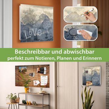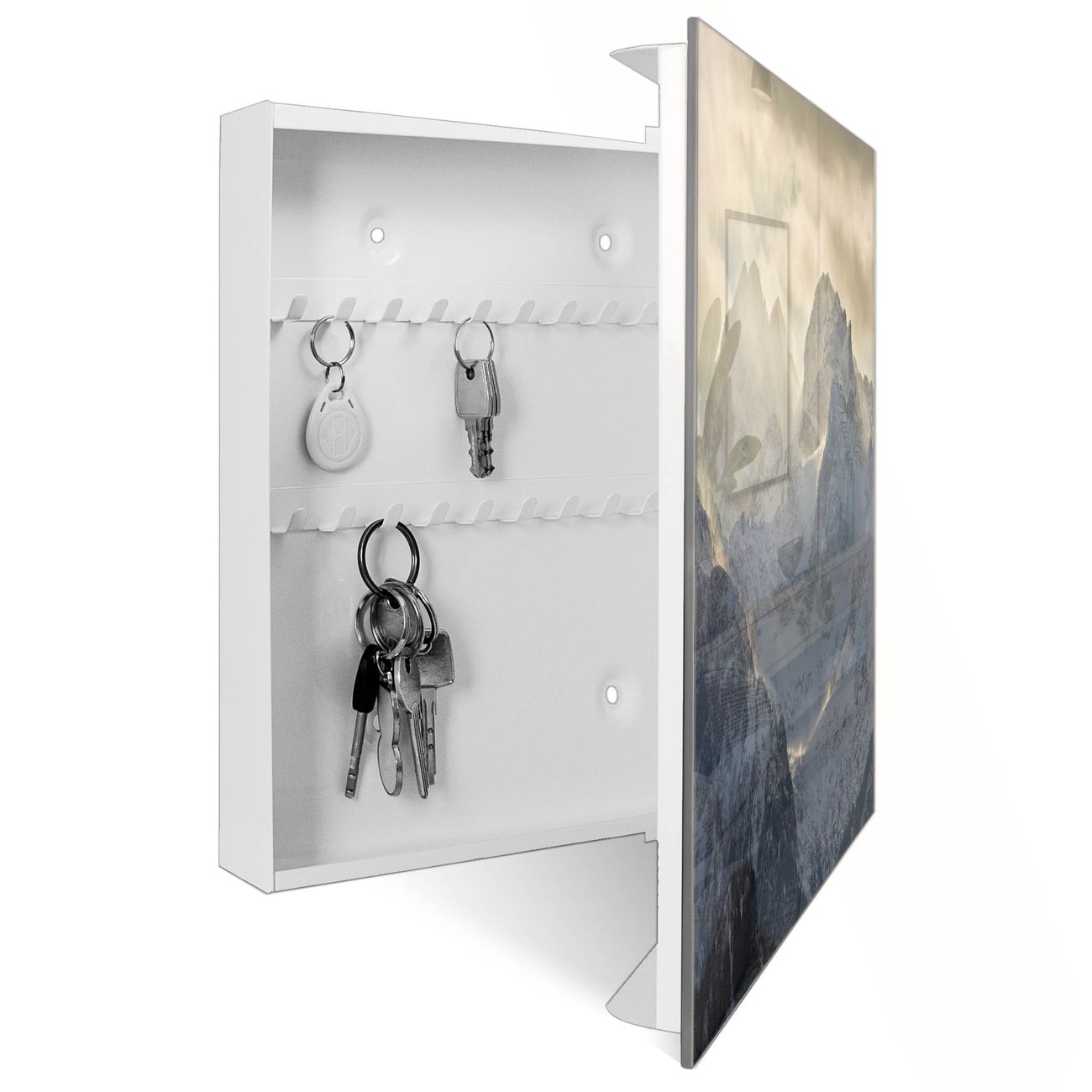 Bringe Ordnung und Eleganz in deinen Eingangsbereich mit dem banjado Schlüsselkasten Motiv Motiv Alpen im Sonnenschein. Die moderne Schlüsselbox kombiniert funktionales Design mit hochwertiger Verarbeitung und wird so zu einem echten Hingucker in Flur, Büro oder Ferienwohnung. ✅ Stilvolle Schlüsselaufbewahrung mit Glasfront im Motiv Motiv Alpen im Sonnenschein Der Design-Schlüsselkasten Motiv Motiv Alpen im Sonnenschein bietet Platz für bis zu 50 Schlüssel, die auf 5 stabilen Reihen mit je 10 Haken übersichtlich verstaut werden. Mit seinen kompakten Maßen von 30 x 30 x 5 cm passt die Schlüsselbox perfekt auch in kleinere Räume. Der weiß lackierte Stahlkorpus mit rechts angeschlagenem Türscharnier harmoniert mit der Glasfront und fügt sich nahtlos in jedes Wohnambiente ein. Ob als Schlüsselorganizer für Zuhause oder als praktische Lösung für Büros, Praxen und Gewerbe, der banjado Schlüsselkasten sorgt für Ordnung und Übersicht. Dank der magnetischen, mit Kreidestiften beschreibbaren Glasfront kannst du Notizen anheften oder Termine direkt auf der Oberfläche festhalten. Die Schlüsselbox Motiv Motiv Alpen im Sonnenschein zur Wandmontage wird inklusive Befestigungsmaterial geliefert und ist schnell angebracht. So hast du deine Schlüssel jederzeit griffbereit und zugleich stilvoll verstaut. Mit diesem banjado Schlüsselkasten Motiv Motiv Alpen im Sonnenschein kombinierst du praktische Aufbewahrung mit stilvollem Wohndesign. Ob privat oder geschäftlich, die Schlüsselbox sorgt für mehr Ordnung, Übersicht und ein wohnliches Ambiente.Vorteile im Überblick