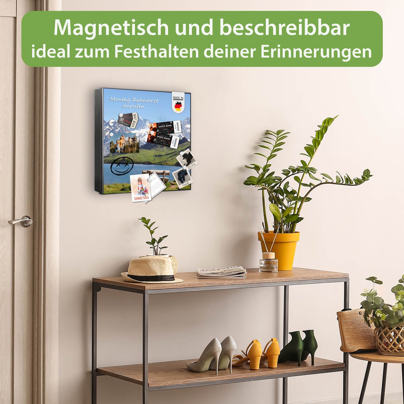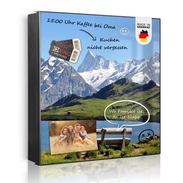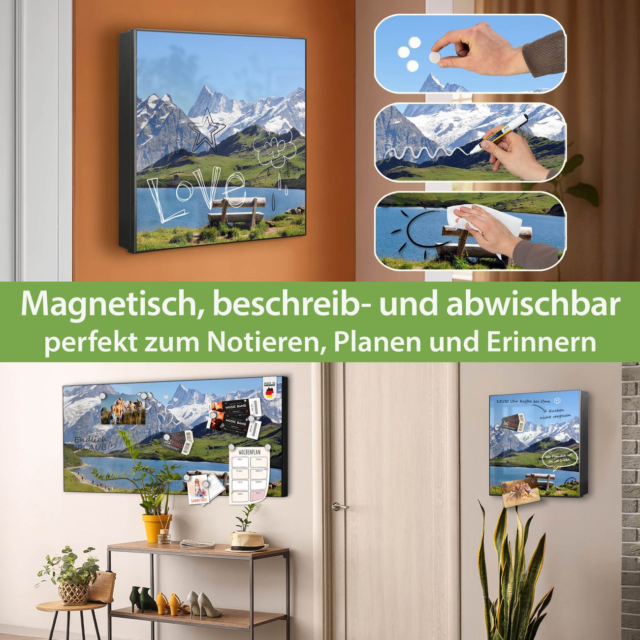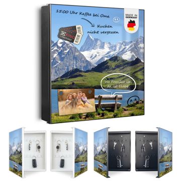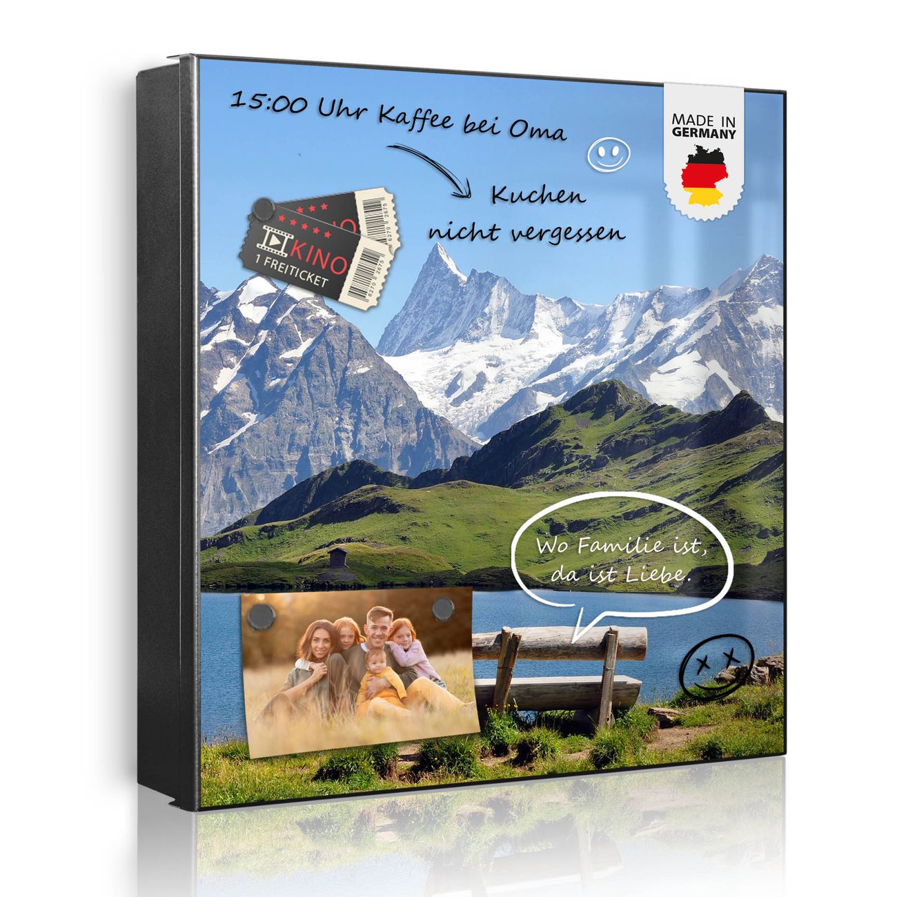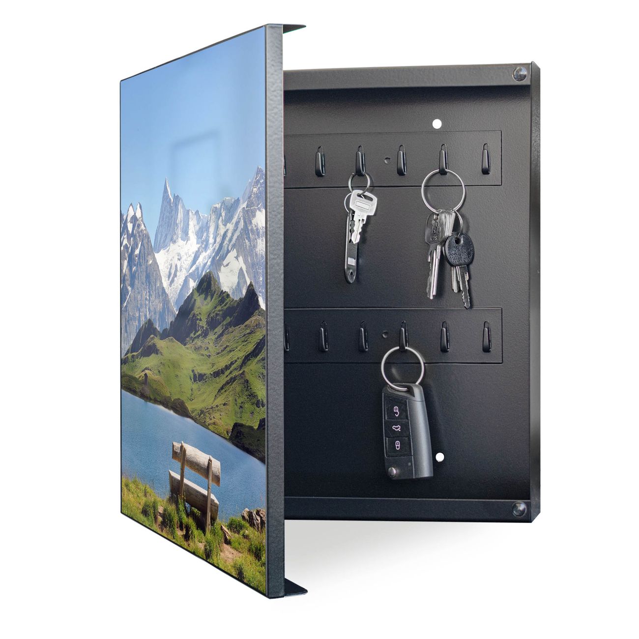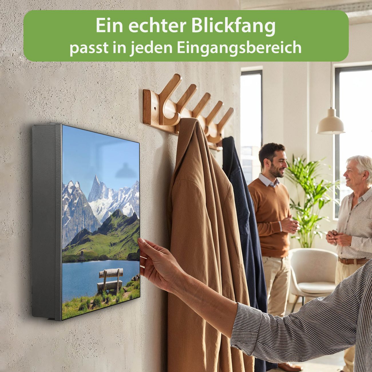 Bringe Ordnung und Eleganz in deinen Eingangsbereich mit dem banjado Schlüsselkasten Motiv Motiv Alpen. Die moderne Schlüsselbox kombiniert funktionales Design mit hochwertiger Verarbeitung und wird so zu einem echten Hingucker in Flur, Büro oder Ferienwohnung. ✅ Stilvolle Schlüsselaufbewahrung mit Motiv Motiv Alpen Der Design-Schlüsselkasten Motiv Motiv Alpen bietet Platz für bis zu 32 Schlüssel, die auf 4 stabilen Reihen mit je 8 Haken übersichtlich verstaut werden. Mit seinen kompakten Maßen von 30 x 30 x 5 cm passt die Schlüsselbox perfekt auch in kleinere Räume. Der schwarz lackierte Stahlkorpus mit links angeschlagenem Türscharnier harmoniert mit gedruckten Folie auf der Front und fügt sich nahtlos in jedes Wohnambiente ein. Ob als Schlüsselorganizer für Zuhause oder als praktische Lösung für Büros, Praxen und Gewerbe, der banjado Schlüsselkasten sorgt für Ordnung und Übersicht. Dank der magnetischen, mit Kreidestiften beschreibbaren Folie auf der Front kannst du Notizen anheften oder Termine direkt auf der Oberfläche festhalten. Die Schlüsselbox Motiv Motiv Alpen zur Wandmontage wird inklusive Befestigungsmaterial geliefert und ist schnell angebracht. So hast du deine Schlüssel jederzeit griffbereit und zugleich stilvoll verstaut. Mit diesem banjado Schlüsselkasten Motiv Motiv Alpen kombinierst du praktische Aufbewahrung mit stilvollem Wohndesign. Ob privat oder geschäftlich, die Schlüsselbox sorgt für mehr Ordnung, Übersicht und ein wohnliches Ambiente.Vorteile im Überblick