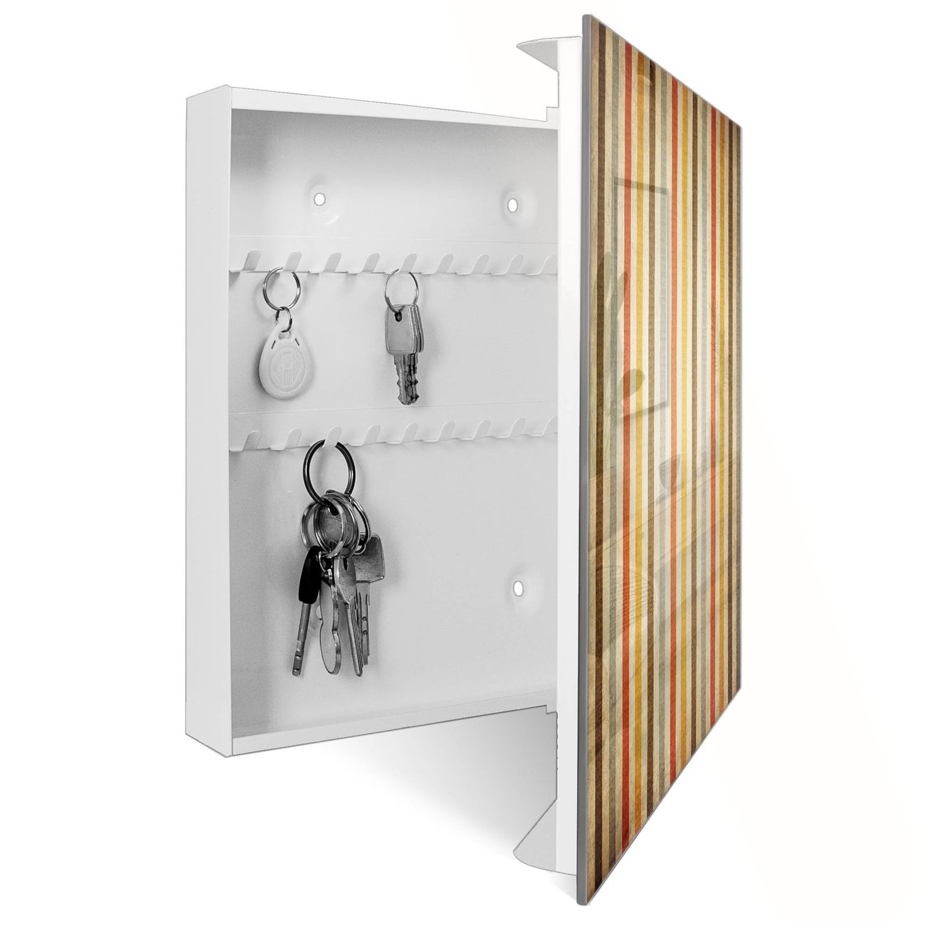 Bringe Ordnung und Eleganz in deinen Eingangsbereich mit dem banjado Schlüsselkasten Motiv Motiv Alte Streifen. Die moderne Schlüsselbox kombiniert funktionales Design mit hochwertiger Verarbeitung und wird so zu einem echten Hingucker in Flur, Büro oder Ferienwohnung. ✅ Stilvolle Schlüsselaufbewahrung mit Glasfront im Motiv Motiv Alte Streifen Der Design-Schlüsselkasten Motiv Motiv Alte Streifen bietet Platz für bis zu 50 Schlüssel, die auf 5 stabilen Reihen mit je 10 Haken übersichtlich verstaut werden. Mit seinen kompakten Maßen von 30 x 30 x 5 cm passt die Schlüsselbox perfekt auch in kleinere Räume. Der weiß lackierte Stahlkorpus mit rechts angeschlagenem Türscharnier harmoniert mit der Glasfront und fügt sich nahtlos in jedes Wohnambiente ein. Ob als Schlüsselorganizer für Zuhause oder als praktische Lösung für Büros, Praxen und Gewerbe, der banjado Schlüsselkasten sorgt für Ordnung und Übersicht. Dank der magnetischen, mit Kreidestiften beschreibbaren Glasfront kannst du Notizen anheften oder Termine direkt auf der Oberfläche festhalten. Die Schlüsselbox Motiv Motiv Alte Streifen zur Wandmontage wird inklusive Befestigungsmaterial geliefert und ist schnell angebracht. So hast du deine Schlüssel jederzeit griffbereit und zugleich stilvoll verstaut. Mit diesem banjado Schlüsselkasten Motiv Motiv Alte Streifen kombinierst du praktische Aufbewahrung mit stilvollem Wohndesign. Ob privat oder geschäftlich, die Schlüsselbox sorgt für mehr Ordnung, Übersicht und ein wohnliches Ambiente.Vorteile im Überblick