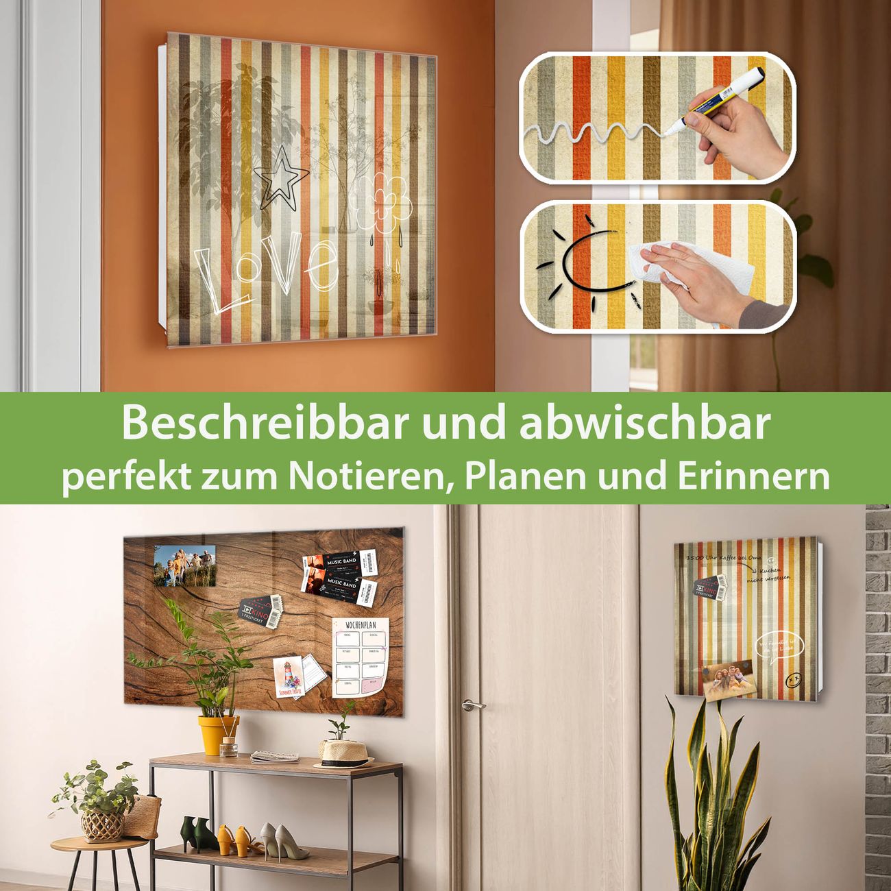 ✅ Magnetisch und mit Kreidestift beschreibbar, gehärtetes Glas, links angeschlagene TürOrdnung und Design in einem