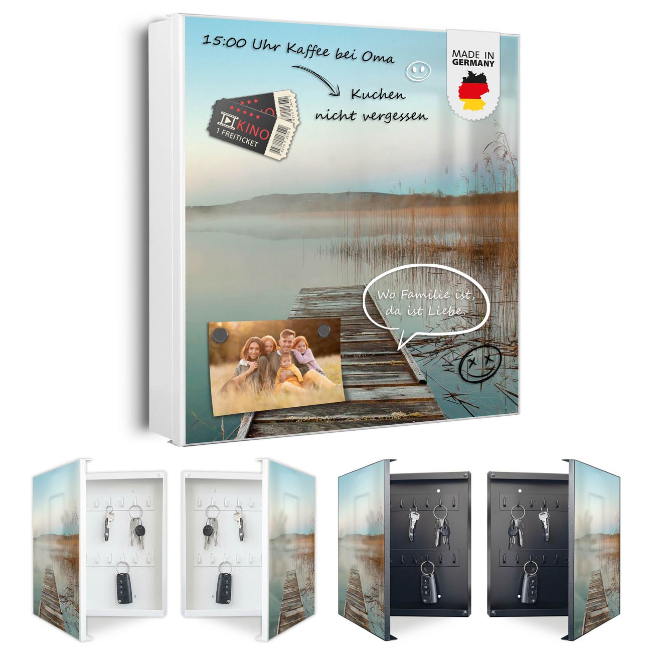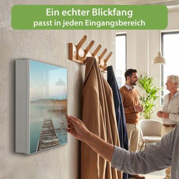 Bringe Ordnung und Eleganz in deinen Eingangsbereich mit dem banjado Schlüsselkasten Motiv Motiv Alter Steg. Die moderne Schlüsselbox kombiniert funktionales Design mit hochwertiger Verarbeitung und wird so zu einem echten Hingucker in Flur, Büro oder Ferienwohnung. ✅ Stilvolle Schlüsselaufbewahrung mit Motiv Motiv Alter Steg Der Design-Schlüsselkasten Motiv Motiv Alter Steg bietet Platz für bis zu 32 Schlüssel, die auf 4 stabilen Reihen mit je 8 Haken übersichtlich verstaut werden. Mit seinen kompakten Maßen von 30 x 30 x 5 cm passt die Schlüsselbox perfekt auch in kleinere Räume. Der weiß lackierte Stahlkorpus mit links angeschlagenem Türscharnier harmoniert mit gedruckten Folie auf der Front und fügt sich nahtlos in jedes Wohnambiente ein. Ob als Schlüsselorganizer für Zuhause oder als praktische Lösung für Büros, Praxen und Gewerbe, der banjado Schlüsselkasten sorgt für Ordnung und Übersicht. Dank der magnetischen, mit Kreidestiften beschreibbaren Folie auf der Front kannst du Notizen anheften oder Termine direkt auf der Oberfläche festhalten. Die Schlüsselbox Motiv Motiv Alter Steg zur Wandmontage wird inklusive Befestigungsmaterial geliefert und ist schnell angebracht. So hast du deine Schlüssel jederzeit griffbereit und zugleich stilvoll verstaut. Mit diesem banjado Schlüsselkasten Motiv Motiv Alter Steg kombinierst du praktische Aufbewahrung mit stilvollem Wohndesign. Ob privat oder geschäftlich, die Schlüsselbox sorgt für mehr Ordnung, Übersicht und ein wohnliches Ambiente.Vorteile im Überblick