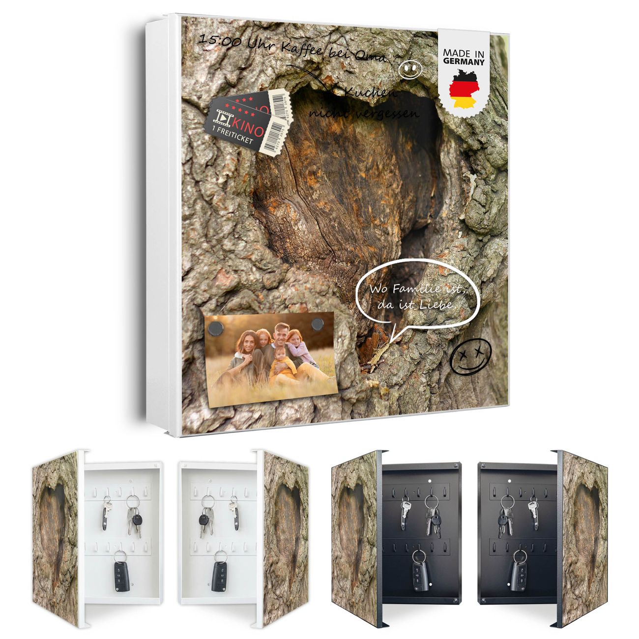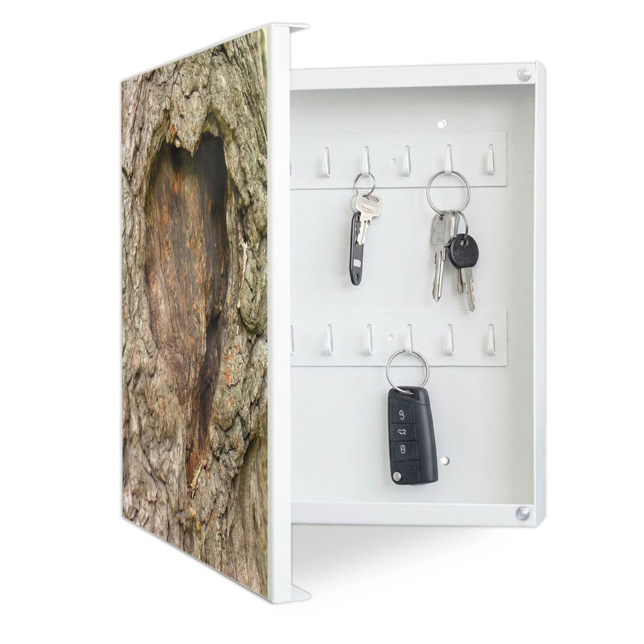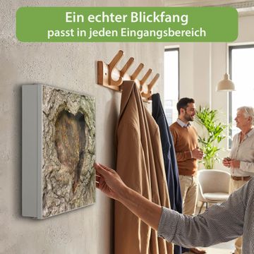 Bringe Ordnung und Eleganz in deinen Eingangsbereich mit dem banjado Schlüsselkasten Motiv Motiv Altes Herz. Die moderne Schlüsselbox kombiniert funktionales Design mit hochwertiger Verarbeitung und wird so zu einem echten Hingucker in Flur, Büro oder Ferienwohnung. ✅ Stilvolle Schlüsselaufbewahrung mit Motiv Motiv Altes Herz Der Design-Schlüsselkasten Motiv Motiv Altes Herz bietet Platz für bis zu 32 Schlüssel, die auf 4 stabilen Reihen mit je 8 Haken übersichtlich verstaut werden. Mit seinen kompakten Maßen von 30 x 30 x 5 cm passt die Schlüsselbox perfekt auch in kleinere Räume. Der weiß lackierte Stahlkorpus mit links angeschlagenem Türscharnier harmoniert mit gedruckten Folie auf der Front und fügt sich nahtlos in jedes Wohnambiente ein. Ob als Schlüsselorganizer für Zuhause oder als praktische Lösung für Büros, Praxen und Gewerbe, der banjado Schlüsselkasten sorgt für Ordnung und Übersicht. Dank der magnetischen, mit Kreidestiften beschreibbaren Folie auf der Front kannst du Notizen anheften oder Termine direkt auf der Oberfläche festhalten. Die Schlüsselbox Motiv Motiv Altes Herz zur Wandmontage wird inklusive Befestigungsmaterial geliefert und ist schnell angebracht. So hast du deine Schlüssel jederzeit griffbereit und zugleich stilvoll verstaut. Mit diesem banjado Schlüsselkasten Motiv Motiv Altes Herz kombinierst du praktische Aufbewahrung mit stilvollem Wohndesign. Ob privat oder geschäftlich, die Schlüsselbox sorgt für mehr Ordnung, Übersicht und ein wohnliches Ambiente.Vorteile im Überblick