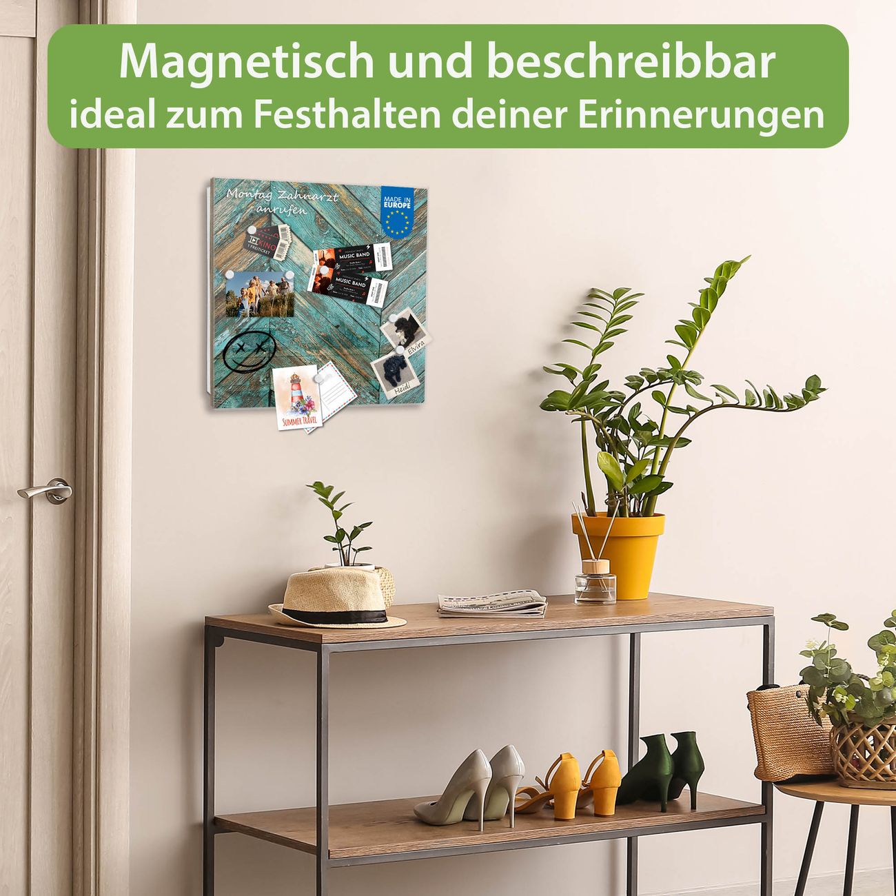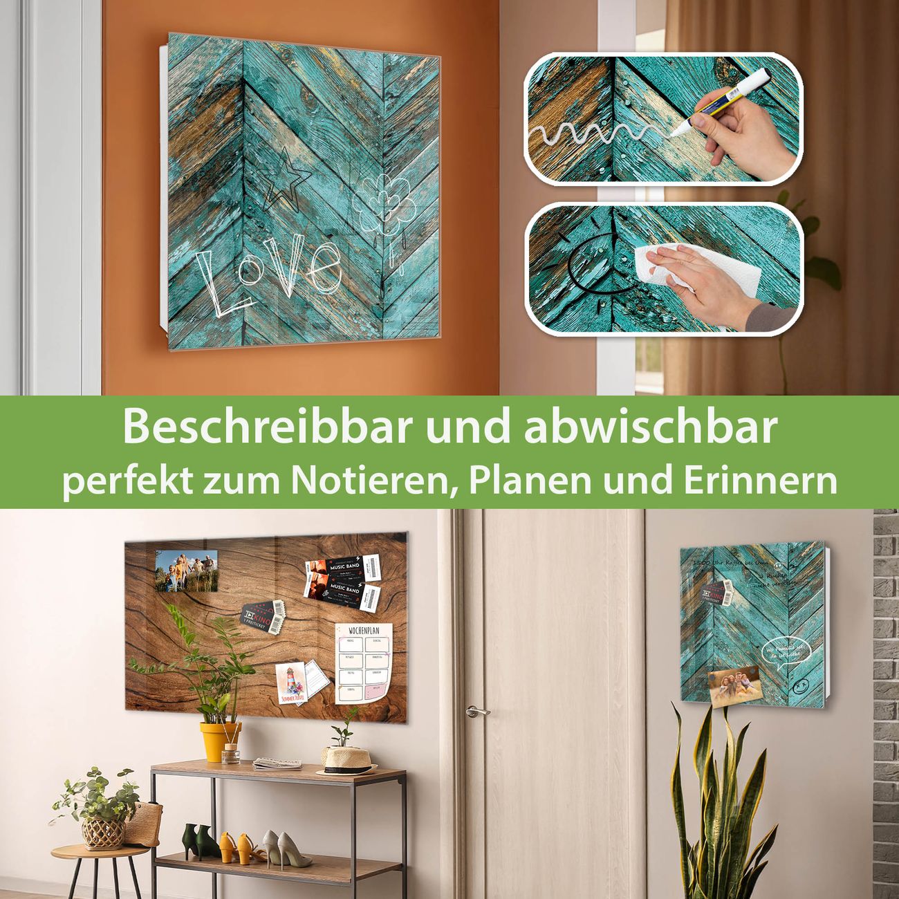 Bringe Ordnung und Eleganz in deinen Eingangsbereich mit dem banjado Schlüsselkasten Motiv Motiv Altes Holz Blau. Die moderne Schlüsselbox kombiniert funktionales Design mit hochwertiger Verarbeitung und wird so zu einem echten Hingucker in Flur, Büro oder Ferienwohnung. ✅ Stilvolle Schlüsselaufbewahrung mit Glasfront im Motiv Motiv Altes Holz Blau Der Design-Schlüsselkasten Motiv Motiv Altes Holz Blau bietet Platz für bis zu 50 Schlüssel, die auf 5 stabilen Reihen mit je 10 Haken übersichtlich verstaut werden. Mit seinen kompakten Maßen von 30 x 30 x 5 cm passt die Schlüsselbox perfekt auch in kleinere Räume. Der weiß lackierte Stahlkorpus mit rechts angeschlagenem Türscharnier harmoniert mit der Glasfront und fügt sich nahtlos in jedes Wohnambiente ein. Ob als Schlüsselorganizer für Zuhause oder als praktische Lösung für Büros, Praxen und Gewerbe, der banjado Schlüsselkasten sorgt für Ordnung und Übersicht. Dank der magnetischen, mit Kreidestiften beschreibbaren Glasfront kannst du Notizen anheften oder Termine direkt auf der Oberfläche festhalten. Die Schlüsselbox Motiv Motiv Altes Holz Blau zur Wandmontage wird inklusive Befestigungsmaterial geliefert und ist schnell angebracht. So hast du deine Schlüssel jederzeit griffbereit und zugleich stilvoll verstaut. Mit diesem banjado Schlüsselkasten Motiv Motiv Altes Holz Blau kombinierst du praktische Aufbewahrung mit stilvollem Wohndesign. Ob privat oder geschäftlich, die Schlüsselbox sorgt für mehr Ordnung, Übersicht und ein wohnliches Ambiente.Vorteile im Überblick