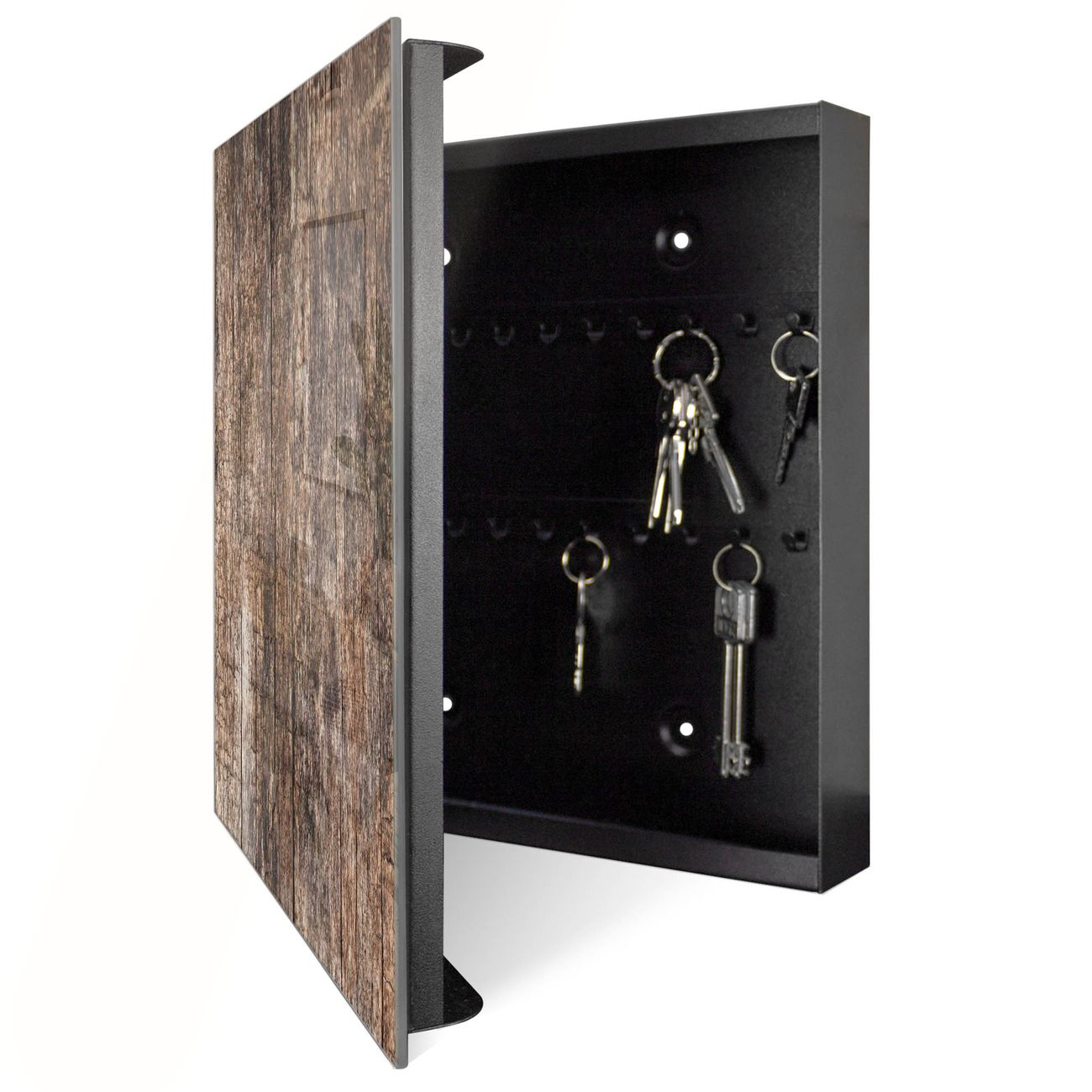 Bringe Ordnung und Eleganz in deinen Eingangsbereich mit dem banjado Schlüsselkasten Motiv Motiv Altes Holz. Die moderne Schlüsselbox kombiniert funktionales Design mit hochwertiger Verarbeitung und wird so zu einem echten Hingucker in Flur, Büro oder Ferienwohnung. ✅ Stilvolle Schlüsselaufbewahrung mit Glasfront im Motiv Motiv Altes Holz Der Design-Schlüsselkasten Motiv Motiv Altes Holz bietet Platz für bis zu 50 Schlüssel, die auf 5 stabilen Reihen mit je 10 Haken übersichtlich verstaut werden. Mit seinen kompakten Maßen von 30 x 30 x 5 cm passt die Schlüsselbox perfekt auch in kleinere Räume. Der schwarz lackierte Stahlkorpus mit rechts angeschlagenem Türscharnier harmoniert mit der Glasfront und fügt sich nahtlos in jedes Wohnambiente ein. Ob als Schlüsselorganizer für Zuhause oder als praktische Lösung für Büros, Praxen und Gewerbe, der banjado Schlüsselkasten sorgt für Ordnung und Übersicht. Dank der magnetischen, mit Kreidestiften beschreibbaren Glasfront kannst du Notizen anheften oder Termine direkt auf der Oberfläche festhalten. Die Schlüsselbox Motiv Motiv Altes Holz zur Wandmontage wird inklusive Befestigungsmaterial geliefert und ist schnell angebracht. So hast du deine Schlüssel jederzeit griffbereit und zugleich stilvoll verstaut. Mit diesem banjado Schlüsselkasten Motiv Motiv Altes Holz kombinierst du praktische Aufbewahrung mit stilvollem Wohndesign. Ob privat oder geschäftlich, die Schlüsselbox sorgt für mehr Ordnung, Übersicht und ein wohnliches Ambiente.Vorteile im Überblick