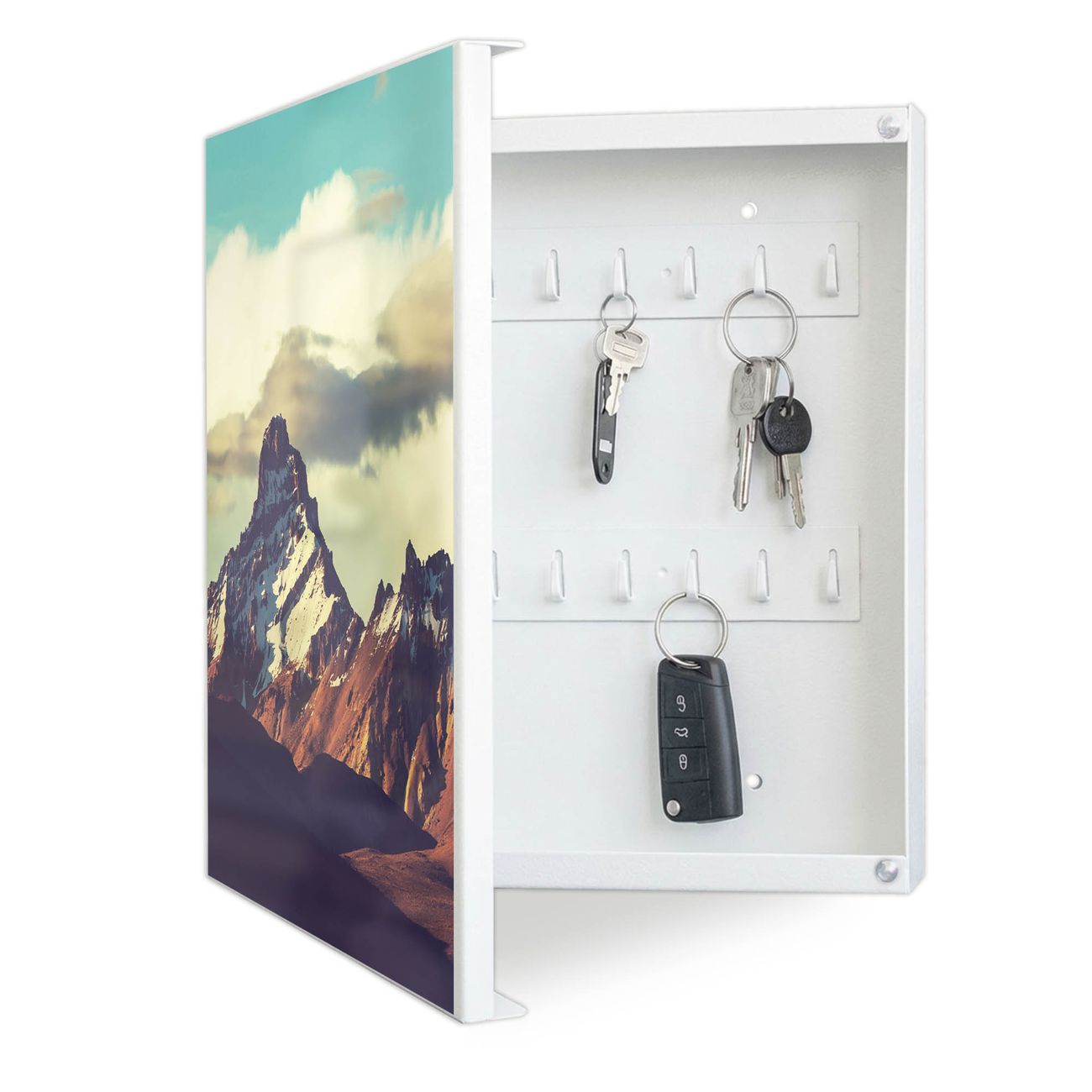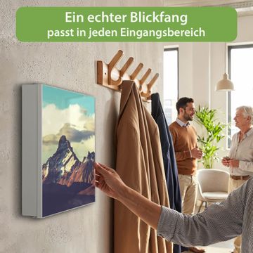 Bringe Ordnung und Eleganz in deinen Eingangsbereich mit dem banjado Schlüsselkasten Motiv Motiv Anden. Die moderne Schlüsselbox kombiniert funktionales Design mit hochwertiger Verarbeitung und wird so zu einem echten Hingucker in Flur, Büro oder Ferienwohnung. ✅ Stilvolle Schlüsselaufbewahrung mit Motiv Motiv Anden Der Design-Schlüsselkasten Motiv Motiv Anden bietet Platz für bis zu 32 Schlüssel, die auf 4 stabilen Reihen mit je 8 Haken übersichtlich verstaut werden. Mit seinen kompakten Maßen von 30 x 30 x 5 cm passt die Schlüsselbox perfekt auch in kleinere Räume. Der weiß lackierte Stahlkorpus mit links angeschlagenem Türscharnier harmoniert mit gedruckten Folie auf der Front und fügt sich nahtlos in jedes Wohnambiente ein. Ob als Schlüsselorganizer für Zuhause oder als praktische Lösung für Büros, Praxen und Gewerbe, der banjado Schlüsselkasten sorgt für Ordnung und Übersicht. Dank der magnetischen, mit Kreidestiften beschreibbaren Folie auf der Front kannst du Notizen anheften oder Termine direkt auf der Oberfläche festhalten. Die Schlüsselbox Motiv Motiv Anden zur Wandmontage wird inklusive Befestigungsmaterial geliefert und ist schnell angebracht. So hast du deine Schlüssel jederzeit griffbereit und zugleich stilvoll verstaut. Mit diesem banjado Schlüsselkasten Motiv Motiv Anden kombinierst du praktische Aufbewahrung mit stilvollem Wohndesign. Ob privat oder geschäftlich, die Schlüsselbox sorgt für mehr Ordnung, Übersicht und ein wohnliches Ambiente.Vorteile im Überblick