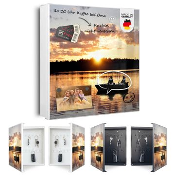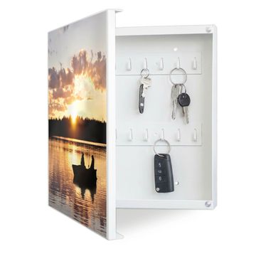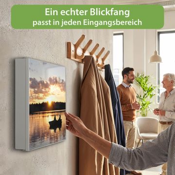 Bringe Ordnung und Eleganz in deinen Eingangsbereich mit dem banjado Schlüsselkasten Motiv Motiv Angler. Die moderne Schlüsselbox kombiniert funktionales Design mit hochwertiger Verarbeitung und wird so zu einem echten Hingucker in Flur, Büro oder Ferienwohnung. ✅ Stilvolle Schlüsselaufbewahrung mit Motiv Motiv Angler Der Design-Schlüsselkasten Motiv Motiv Angler bietet Platz für bis zu 32 Schlüssel, die auf 4 stabilen Reihen mit je 8 Haken übersichtlich verstaut werden. Mit seinen kompakten Maßen von 30 x 30 x 5 cm passt die Schlüsselbox perfekt auch in kleinere Räume. Der weiß lackierte Stahlkorpus mit links angeschlagenem Türscharnier harmoniert mit gedruckten Folie auf der Front und fügt sich nahtlos in jedes Wohnambiente ein. Ob als Schlüsselorganizer für Zuhause oder als praktische Lösung für Büros, Praxen und Gewerbe, der banjado Schlüsselkasten sorgt für Ordnung und Übersicht. Dank der magnetischen, mit Kreidestiften beschreibbaren Folie auf der Front kannst du Notizen anheften oder Termine direkt auf der Oberfläche festhalten. Die Schlüsselbox Motiv Motiv Angler zur Wandmontage wird inklusive Befestigungsmaterial geliefert und ist schnell angebracht. So hast du deine Schlüssel jederzeit griffbereit und zugleich stilvoll verstaut. Mit diesem banjado Schlüsselkasten Motiv Motiv Angler kombinierst du praktische Aufbewahrung mit stilvollem Wohndesign. Ob privat oder geschäftlich, die Schlüsselbox sorgt für mehr Ordnung, Übersicht und ein wohnliches Ambiente.Vorteile im Überblick