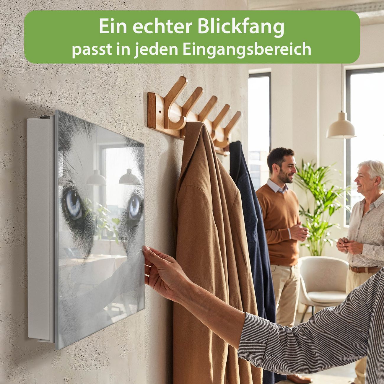 Bringe Ordnung und Eleganz in deinen Eingangsbereich mit dem banjado Schlüsselkasten Motiv Motiv Anouk. Die moderne Schlüsselbox kombiniert funktionales Design mit hochwertiger Verarbeitung und wird so zu einem echten Hingucker in Flur, Büro oder Ferienwohnung. ✅ Stilvolle Schlüsselaufbewahrung mit Glasfront im Motiv Motiv Anouk Der Design-Schlüsselkasten Motiv Motiv Anouk bietet Platz für bis zu 50 Schlüssel, die auf 5 stabilen Reihen mit je 10 Haken übersichtlich verstaut werden. Mit seinen kompakten Maßen von 30 x 30 x 5 cm passt die Schlüsselbox perfekt auch in kleinere Räume. Der weiß lackierte Stahlkorpus mit rechts angeschlagenem Türscharnier harmoniert mit der Glasfront und fügt sich nahtlos in jedes Wohnambiente ein. Ob als Schlüsselorganizer für Zuhause oder als praktische Lösung für Büros, Praxen und Gewerbe, der banjado Schlüsselkasten sorgt für Ordnung und Übersicht. Dank der magnetischen, mit Kreidestiften beschreibbaren Glasfront kannst du Notizen anheften oder Termine direkt auf der Oberfläche festhalten. Die Schlüsselbox Motiv Motiv Anouk zur Wandmontage wird inklusive Befestigungsmaterial geliefert und ist schnell angebracht. So hast du deine Schlüssel jederzeit griffbereit und zugleich stilvoll verstaut. Mit diesem banjado Schlüsselkasten Motiv Motiv Anouk kombinierst du praktische Aufbewahrung mit stilvollem Wohndesign. Ob privat oder geschäftlich, die Schlüsselbox sorgt für mehr Ordnung, Übersicht und ein wohnliches Ambiente.Vorteile im Überblick