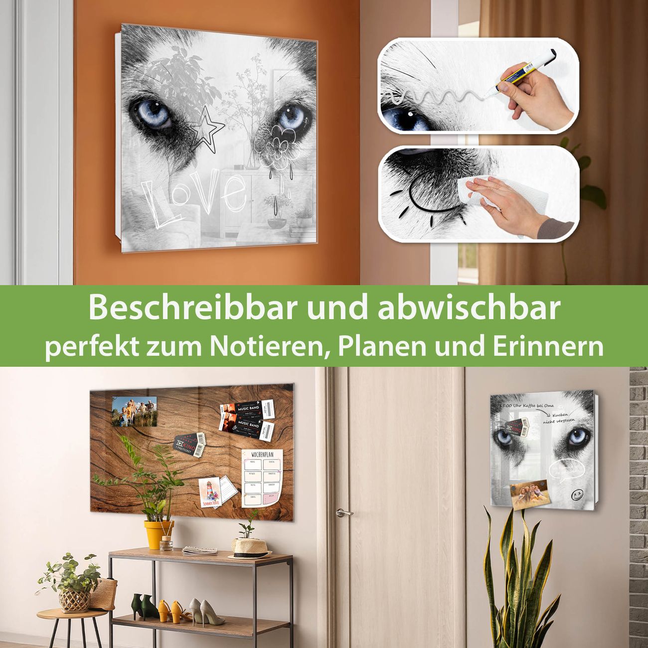 ✅ Magnetisch und mit Kreidestift beschreibbar, gehärtetes Glas, rechts angeschlagene TürOrdnung und Design in einem