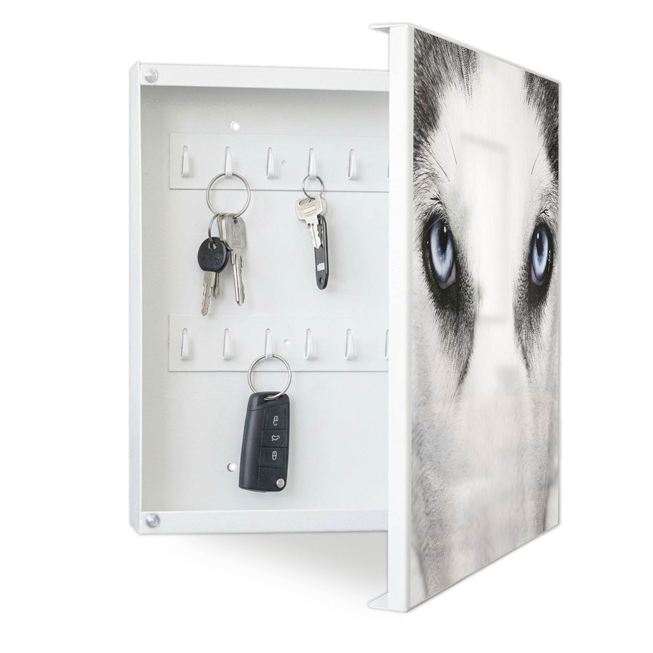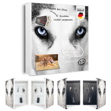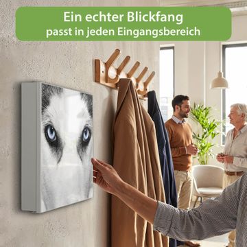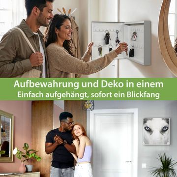 Bringe Ordnung und Eleganz in deinen Eingangsbereich mit dem banjado Schlüsselkasten Motiv Motiv Anouk. Die moderne Schlüsselbox kombiniert funktionales Design mit hochwertiger Verarbeitung und wird so zu einem echten Hingucker in Flur, Büro oder Ferienwohnung. ✅ Stilvolle Schlüsselaufbewahrung mit Motiv Motiv Anouk Der Design-Schlüsselkasten Motiv Motiv Anouk bietet Platz für bis zu 32 Schlüssel, die auf 4 stabilen Reihen mit je 8 Haken übersichtlich verstaut werden. Mit seinen kompakten Maßen von 30 x 30 x 5 cm passt die Schlüsselbox perfekt auch in kleinere Räume. Der weiß lackierte Stahlkorpus mit rechts angeschlagenem Türscharnier harmoniert mit gedruckten Folie auf der Front und fügt sich nahtlos in jedes Wohnambiente ein. Ob als Schlüsselorganizer für Zuhause oder als praktische Lösung für Büros, Praxen und Gewerbe, der banjado Schlüsselkasten sorgt für Ordnung und Übersicht. Dank der magnetischen, mit Kreidestiften beschreibbaren Folie auf der Front kannst du Notizen anheften oder Termine direkt auf der Oberfläche festhalten. Die Schlüsselbox Motiv Motiv Anouk zur Wandmontage wird inklusive Befestigungsmaterial geliefert und ist schnell angebracht. So hast du deine Schlüssel jederzeit griffbereit und zugleich stilvoll verstaut. Mit diesem banjado Schlüsselkasten Motiv Motiv Anouk kombinierst du praktische Aufbewahrung mit stilvollem Wohndesign. Ob privat oder geschäftlich, die Schlüsselbox sorgt für mehr Ordnung, Übersicht und ein wohnliches Ambiente.Vorteile im Überblick