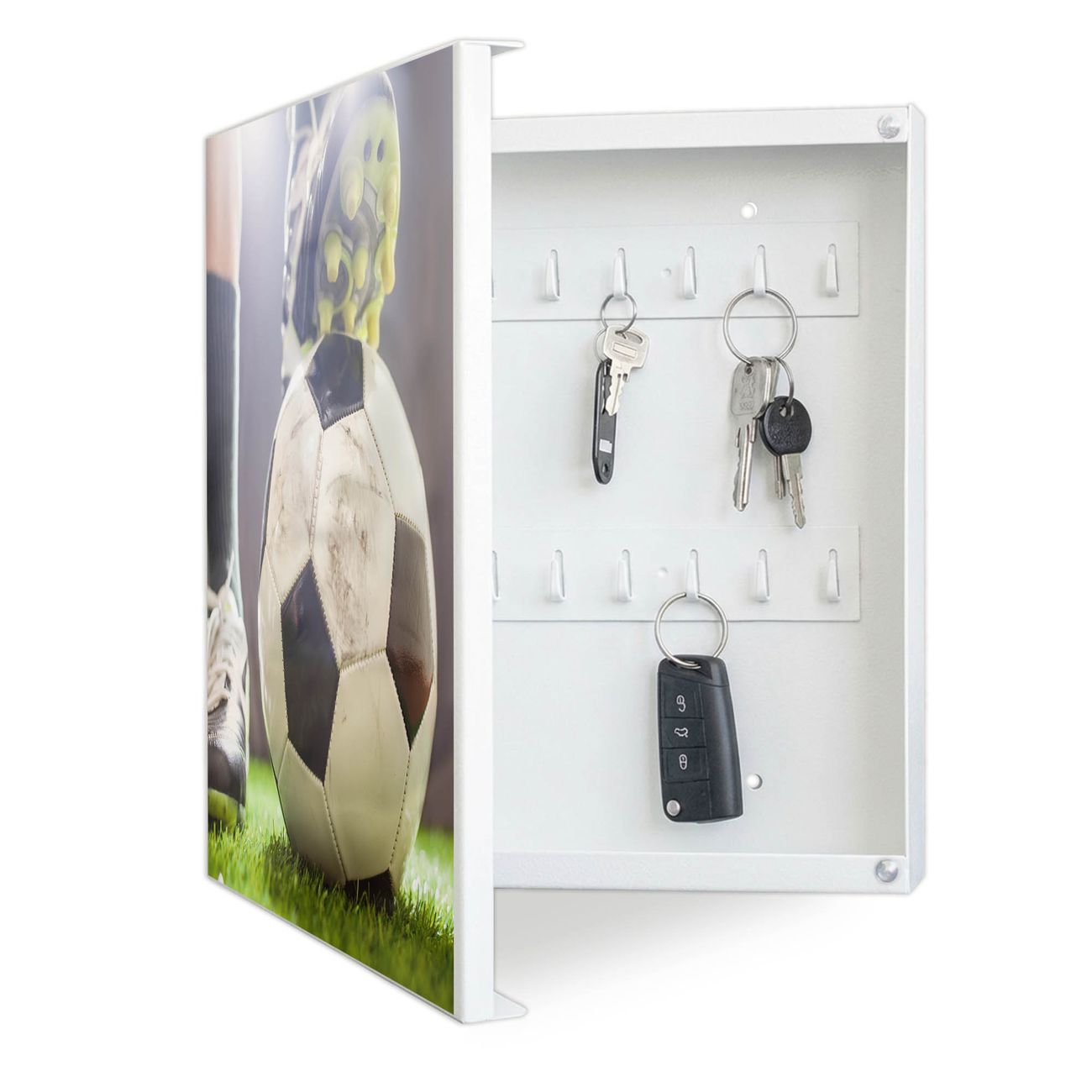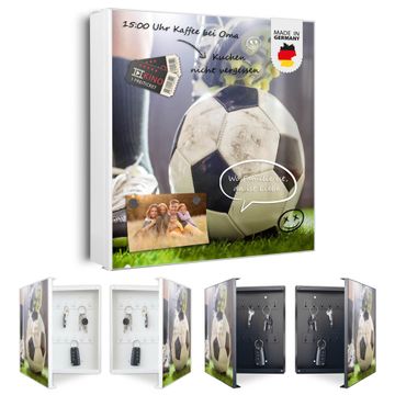 Bringe Ordnung und Eleganz in deinen Eingangsbereich mit dem banjado Schlüsselkasten Motiv Motiv Anpfiff. Die moderne Schlüsselbox kombiniert funktionales Design mit hochwertiger Verarbeitung und wird so zu einem echten Hingucker in Flur, Büro oder Ferienwohnung. ✅ Stilvolle Schlüsselaufbewahrung mit Motiv Motiv Anpfiff Der Design-Schlüsselkasten Motiv Motiv Anpfiff bietet Platz für bis zu 32 Schlüssel, die auf 4 stabilen Reihen mit je 8 Haken übersichtlich verstaut werden. Mit seinen kompakten Maßen von 30 x 30 x 5 cm passt die Schlüsselbox perfekt auch in kleinere Räume. Der weiß lackierte Stahlkorpus mit links angeschlagenem Türscharnier harmoniert mit gedruckten Folie auf der Front und fügt sich nahtlos in jedes Wohnambiente ein. Ob als Schlüsselorganizer für Zuhause oder als praktische Lösung für Büros, Praxen und Gewerbe, der banjado Schlüsselkasten sorgt für Ordnung und Übersicht. Dank der magnetischen, mit Kreidestiften beschreibbaren Folie auf der Front kannst du Notizen anheften oder Termine direkt auf der Oberfläche festhalten. Die Schlüsselbox Motiv Motiv Anpfiff zur Wandmontage wird inklusive Befestigungsmaterial geliefert und ist schnell angebracht. So hast du deine Schlüssel jederzeit griffbereit und zugleich stilvoll verstaut. Mit diesem banjado Schlüsselkasten Motiv Motiv Anpfiff kombinierst du praktische Aufbewahrung mit stilvollem Wohndesign. Ob privat oder geschäftlich, die Schlüsselbox sorgt für mehr Ordnung, Übersicht und ein wohnliches Ambiente.Vorteile im Überblick