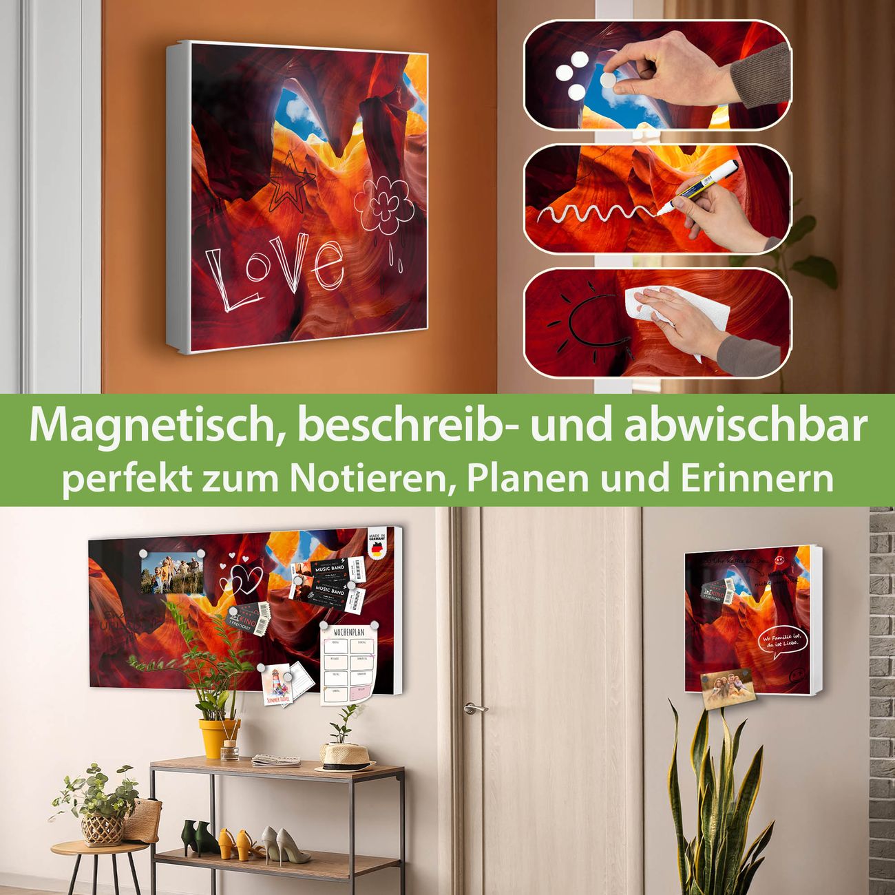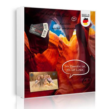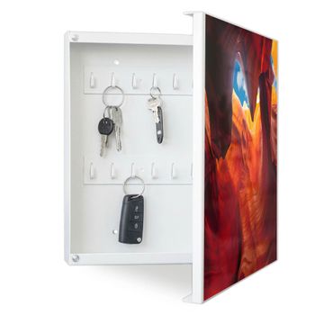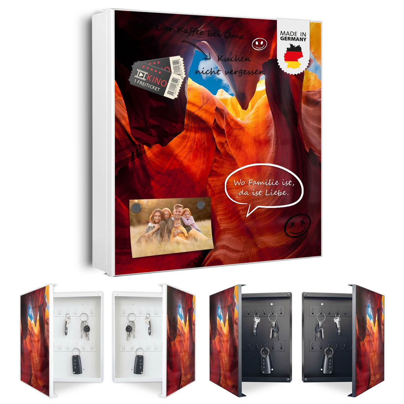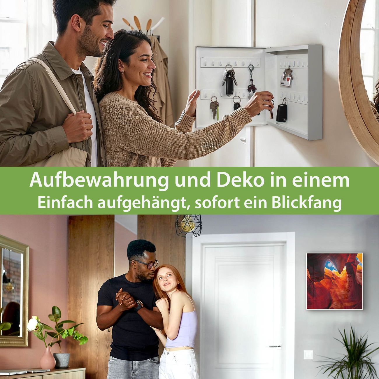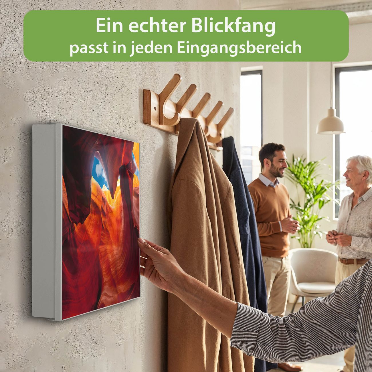Bringe Ordnung und Eleganz in deinen Eingangsbereich mit dem banjado Schlüsselkasten Motiv Motiv Antelope Canyon 2. Die moderne Schlüsselbox kombiniert funktionales Design mit hochwertiger Verarbeitung und wird so zu einem echten Hingucker in Flur, Büro oder Ferienwohnung. ✅ Stilvolle Schlüsselaufbewahrung mit Motiv Motiv Antelope Canyon 2 Der Design-Schlüsselkasten Motiv Motiv Antelope Canyon 2 bietet Platz für bis zu 32 Schlüssel, die auf 4 stabilen Reihen mit je 8 Haken übersichtlich verstaut werden. Mit seinen kompakten Maßen von 30 x 30 x 5 cm passt die Schlüsselbox perfekt auch in kleinere Räume. Der weiß lackierte Stahlkorpus mit rechts angeschlagenem Türscharnier harmoniert mit gedruckten Folie auf der Front und fügt sich nahtlos in jedes Wohnambiente ein. Ob als Schlüsselorganizer für Zuhause oder als praktische Lösung für Büros, Praxen und Gewerbe, der banjado Schlüsselkasten sorgt für Ordnung und Übersicht. Dank der magnetischen, mit Kreidestiften beschreibbaren Folie auf der Front kannst du Notizen anheften oder Termine direkt auf der Oberfläche festhalten. Die Schlüsselbox Motiv Motiv Antelope Canyon 2 zur Wandmontage wird inklusive Befestigungsmaterial geliefert und ist schnell angebracht. So hast du deine Schlüssel jederzeit griffbereit und zugleich stilvoll verstaut. Mit diesem banjado Schlüsselkasten Motiv Motiv Antelope Canyon 2 kombinierst du praktische Aufbewahrung mit stilvollem Wohndesign. Ob privat oder geschäftlich, die Schlüsselbox sorgt für mehr Ordnung, Übersicht und ein wohnliches Ambiente.Vorteile im Überblick