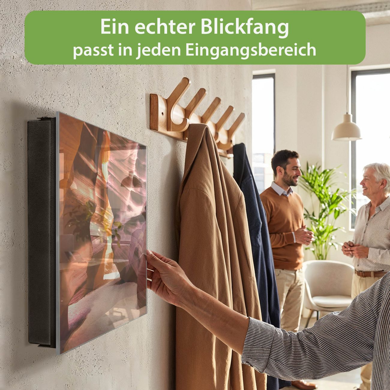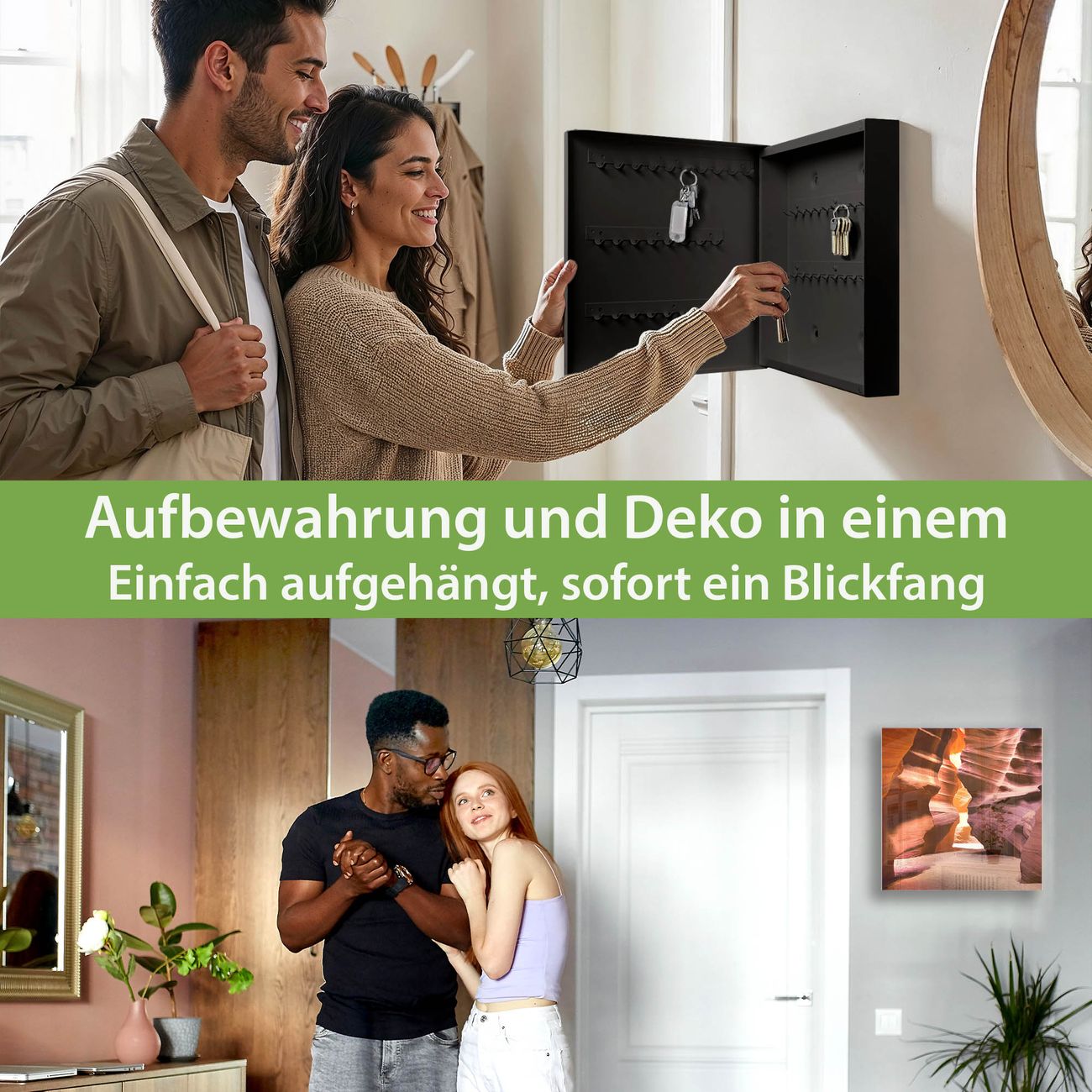 Bringe Ordnung und Eleganz in deinen Eingangsbereich mit dem banjado Schlüsselkasten Motiv Motiv Antelope Canyon. Die moderne Schlüsselbox kombiniert funktionales Design mit hochwertiger Verarbeitung und wird so zu einem echten Hingucker in Flur, Büro oder Ferienwohnung. ✅ Stilvolle Schlüsselaufbewahrung mit Glasfront im Motiv Motiv Antelope Canyon Der Design-Schlüsselkasten Motiv Motiv Antelope Canyon bietet Platz für bis zu 50 Schlüssel, die auf 5 stabilen Reihen mit je 10 Haken übersichtlich verstaut werden. Mit seinen kompakten Maßen von 30 x 30 x 5 cm passt die Schlüsselbox perfekt auch in kleinere Räume. Der schwarz lackierte Stahlkorpus mit rechts angeschlagenem Türscharnier harmoniert mit der Glasfront und fügt sich nahtlos in jedes Wohnambiente ein. Ob als Schlüsselorganizer für Zuhause oder als praktische Lösung für Büros, Praxen und Gewerbe, der banjado Schlüsselkasten sorgt für Ordnung und Übersicht. Dank der magnetischen, mit Kreidestiften beschreibbaren Glasfront kannst du Notizen anheften oder Termine direkt auf der Oberfläche festhalten. Die Schlüsselbox Motiv Motiv Antelope Canyon zur Wandmontage wird inklusive Befestigungsmaterial geliefert und ist schnell angebracht. So hast du deine Schlüssel jederzeit griffbereit und zugleich stilvoll verstaut. Mit diesem banjado Schlüsselkasten Motiv Motiv Antelope Canyon kombinierst du praktische Aufbewahrung mit stilvollem Wohndesign. Ob privat oder geschäftlich, die Schlüsselbox sorgt für mehr Ordnung, Übersicht und ein wohnliches Ambiente.Vorteile im Überblick
