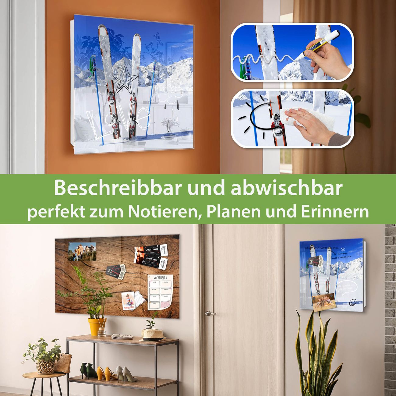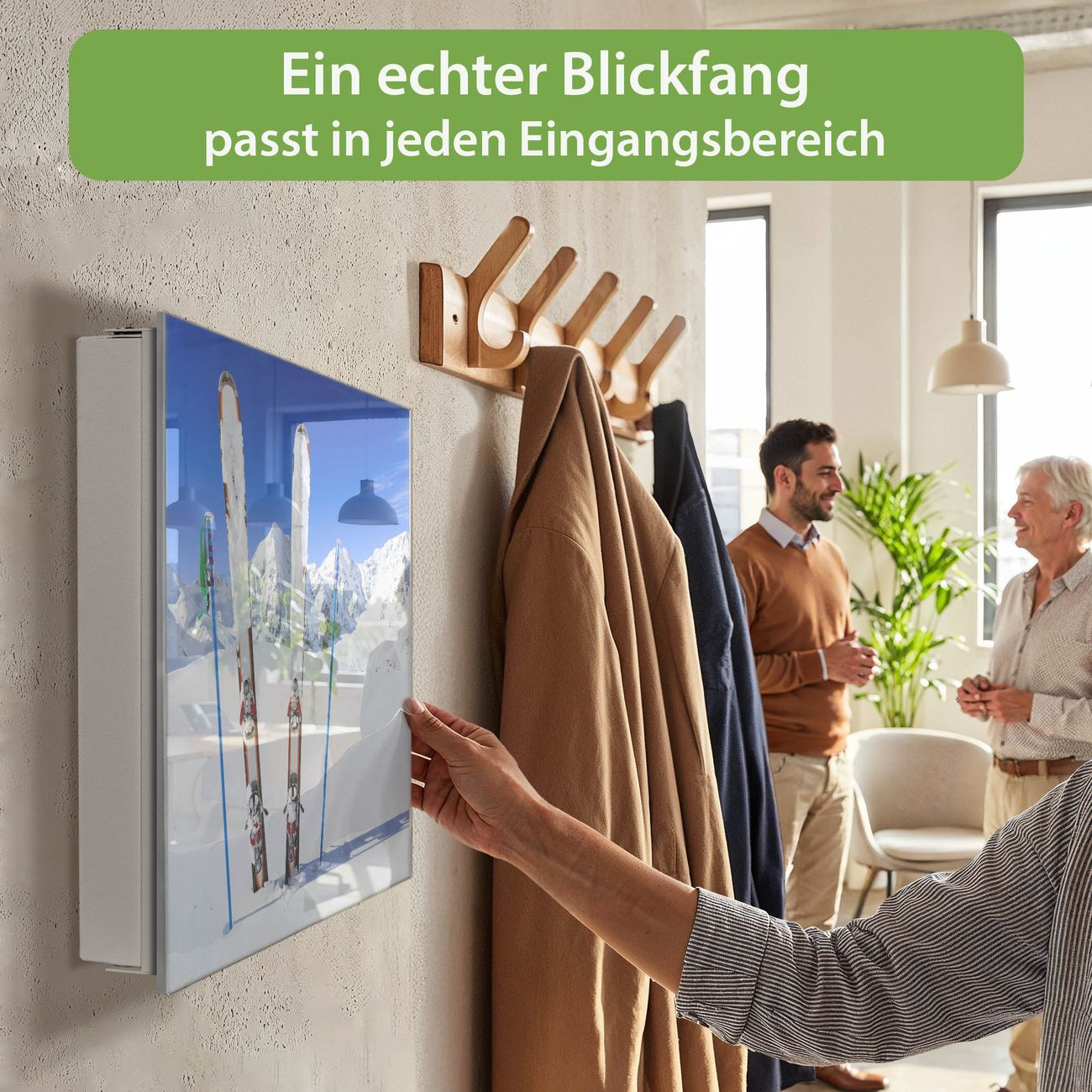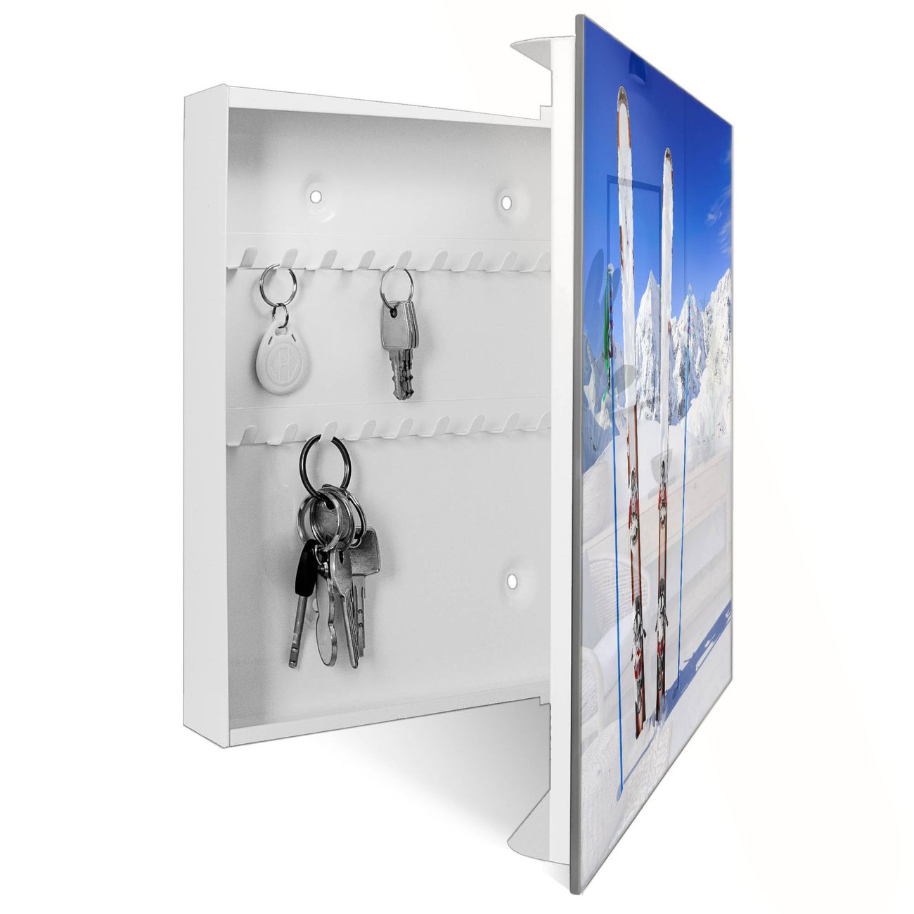Bringe Ordnung und Eleganz in deinen Eingangsbereich mit dem banjado Schlüsselkasten Motiv Motiv Apres Ski. Die moderne Schlüsselbox kombiniert funktionales Design mit hochwertiger Verarbeitung und wird so zu einem echten Hingucker in Flur, Büro oder Ferienwohnung. ✅ Stilvolle Schlüsselaufbewahrung mit Glasfront im Motiv Motiv Apres Ski Der Design-Schlüsselkasten Motiv Motiv Apres Ski bietet Platz für bis zu 50 Schlüssel, die auf 5 stabilen Reihen mit je 10 Haken übersichtlich verstaut werden. Mit seinen kompakten Maßen von 30 x 30 x 5 cm passt die Schlüsselbox perfekt auch in kleinere Räume. Der weiß lackierte Stahlkorpus mit rechts angeschlagenem Türscharnier harmoniert mit der Glasfront und fügt sich nahtlos in jedes Wohnambiente ein. Ob als Schlüsselorganizer für Zuhause oder als praktische Lösung für Büros, Praxen und Gewerbe, der banjado Schlüsselkasten sorgt für Ordnung und Übersicht. Dank der magnetischen, mit Kreidestiften beschreibbaren Glasfront kannst du Notizen anheften oder Termine direkt auf der Oberfläche festhalten. Die Schlüsselbox Motiv Motiv Apres Ski zur Wandmontage wird inklusive Befestigungsmaterial geliefert und ist schnell angebracht. So hast du deine Schlüssel jederzeit griffbereit und zugleich stilvoll verstaut. Mit diesem banjado Schlüsselkasten Motiv Motiv Apres Ski kombinierst du praktische Aufbewahrung mit stilvollem Wohndesign. Ob privat oder geschäftlich, die Schlüsselbox sorgt für mehr Ordnung, Übersicht und ein wohnliches Ambiente.Vorteile im Überblick