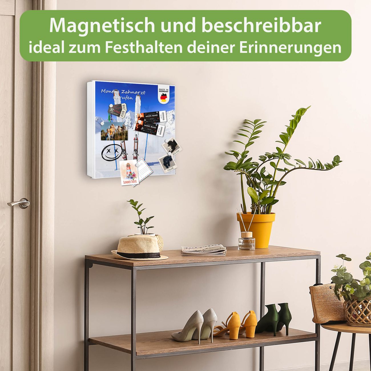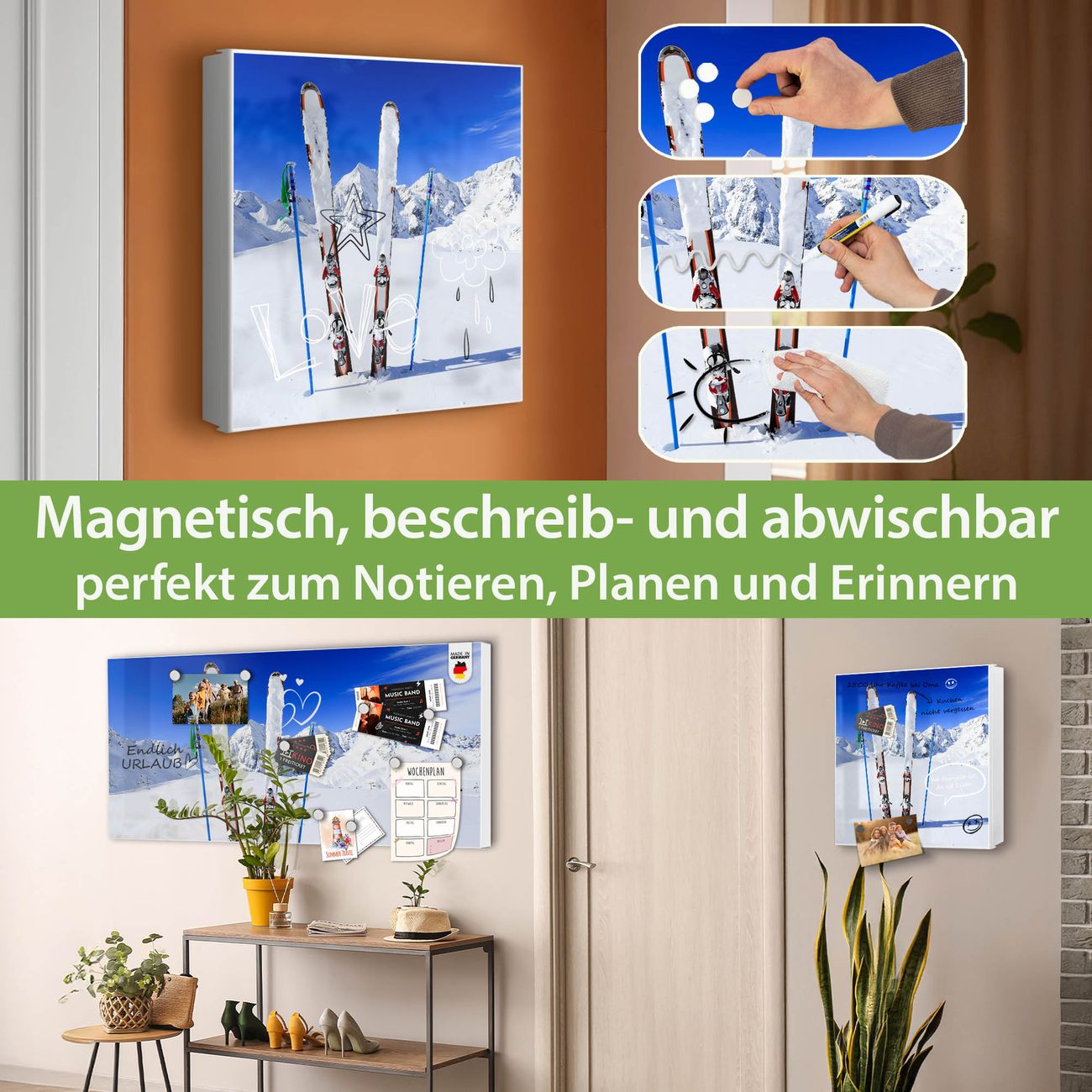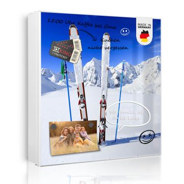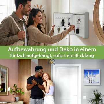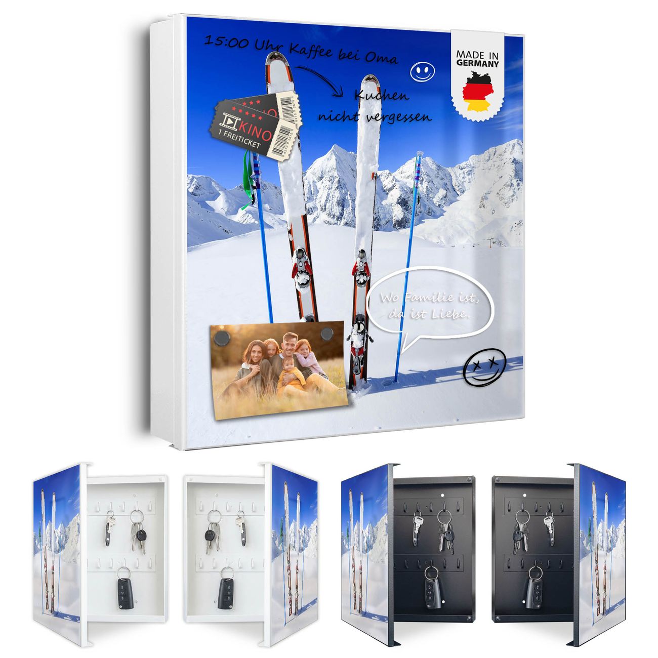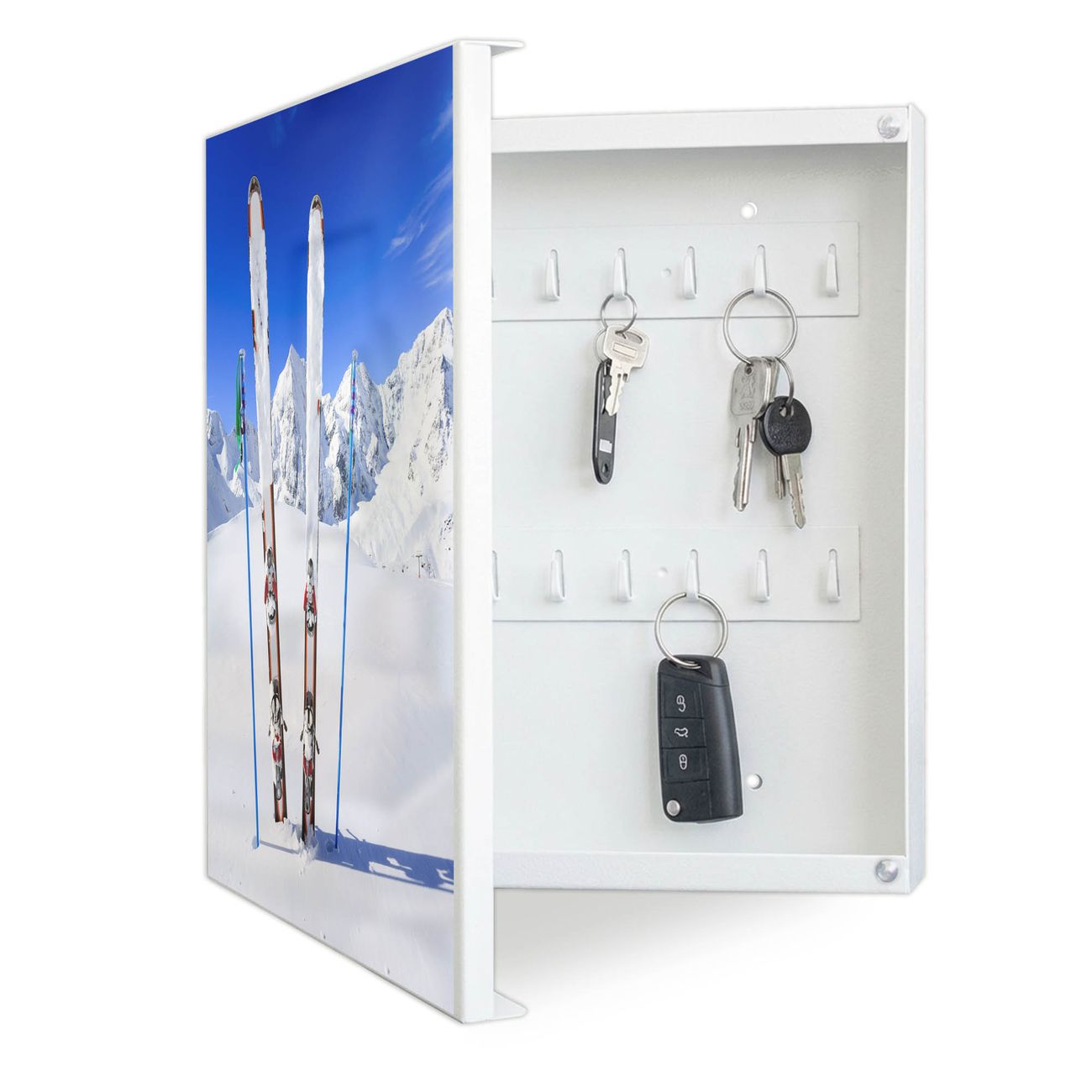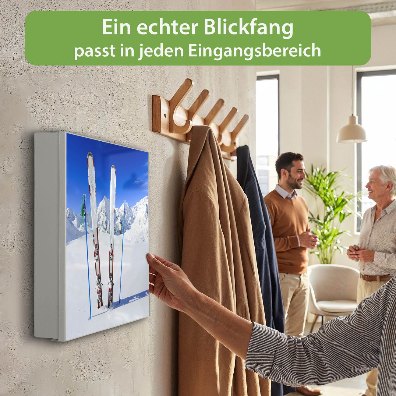 Bringe Ordnung und Eleganz in deinen Eingangsbereich mit dem banjado Schlüsselkasten Motiv Motiv Apres Ski. Die moderne Schlüsselbox kombiniert funktionales Design mit hochwertiger Verarbeitung und wird so zu einem echten Hingucker in Flur, Büro oder Ferienwohnung. ✅ Stilvolle Schlüsselaufbewahrung mit Motiv Motiv Apres Ski Der Design-Schlüsselkasten Motiv Motiv Apres Ski bietet Platz für bis zu 32 Schlüssel, die auf 4 stabilen Reihen mit je 8 Haken übersichtlich verstaut werden. Mit seinen kompakten Maßen von 30 x 30 x 5 cm passt die Schlüsselbox perfekt auch in kleinere Räume. Der weiß lackierte Stahlkorpus mit links angeschlagenem Türscharnier harmoniert mit gedruckten Folie auf der Front und fügt sich nahtlos in jedes Wohnambiente ein. Ob als Schlüsselorganizer für Zuhause oder als praktische Lösung für Büros, Praxen und Gewerbe, der banjado Schlüsselkasten sorgt für Ordnung und Übersicht. Dank der magnetischen, mit Kreidestiften beschreibbaren Folie auf der Front kannst du Notizen anheften oder Termine direkt auf der Oberfläche festhalten. Die Schlüsselbox Motiv Motiv Apres Ski zur Wandmontage wird inklusive Befestigungsmaterial geliefert und ist schnell angebracht. So hast du deine Schlüssel jederzeit griffbereit und zugleich stilvoll verstaut. Mit diesem banjado Schlüsselkasten Motiv Motiv Apres Ski kombinierst du praktische Aufbewahrung mit stilvollem Wohndesign. Ob privat oder geschäftlich, die Schlüsselbox sorgt für mehr Ordnung, Übersicht und ein wohnliches Ambiente.Vorteile im Überblick