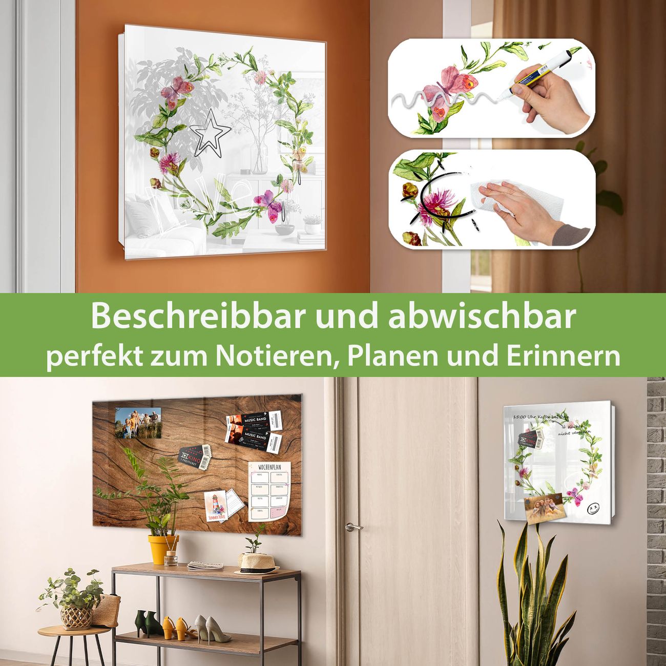 Bringe Ordnung und Eleganz in deinen Eingangsbereich mit dem banjado Schlüsselkasten Motiv Motiv Aquarell Blumenring. Die moderne Schlüsselbox kombiniert funktionales Design mit hochwertiger Verarbeitung und wird so zu einem echten Hingucker in Flur, Büro oder Ferienwohnung. ✅ Stilvolle Schlüsselaufbewahrung mit Glasfront im Motiv Motiv Aquarell Blumenring Der Design-Schlüsselkasten Motiv Motiv Aquarell Blumenring bietet Platz für bis zu 50 Schlüssel, die auf 5 stabilen Reihen mit je 10 Haken übersichtlich verstaut werden. Mit seinen kompakten Maßen von 30 x 30 x 5 cm passt die Schlüsselbox perfekt auch in kleinere Räume. Der weiß lackierte Stahlkorpus mit rechts angeschlagenem Türscharnier harmoniert mit der Glasfront und fügt sich nahtlos in jedes Wohnambiente ein. Ob als Schlüsselorganizer für Zuhause oder als praktische Lösung für Büros, Praxen und Gewerbe, der banjado Schlüsselkasten sorgt für Ordnung und Übersicht. Dank der magnetischen, mit Kreidestiften beschreibbaren Glasfront kannst du Notizen anheften oder Termine direkt auf der Oberfläche festhalten. Die Schlüsselbox Motiv Motiv Aquarell Blumenring zur Wandmontage wird inklusive Befestigungsmaterial geliefert und ist schnell angebracht. So hast du deine Schlüssel jederzeit griffbereit und zugleich stilvoll verstaut. Mit diesem banjado Schlüsselkasten Motiv Motiv Aquarell Blumenring kombinierst du praktische Aufbewahrung mit stilvollem Wohndesign. Ob privat oder geschäftlich, die Schlüsselbox sorgt für mehr Ordnung, Übersicht und ein wohnliches Ambiente.Vorteile im Überblick