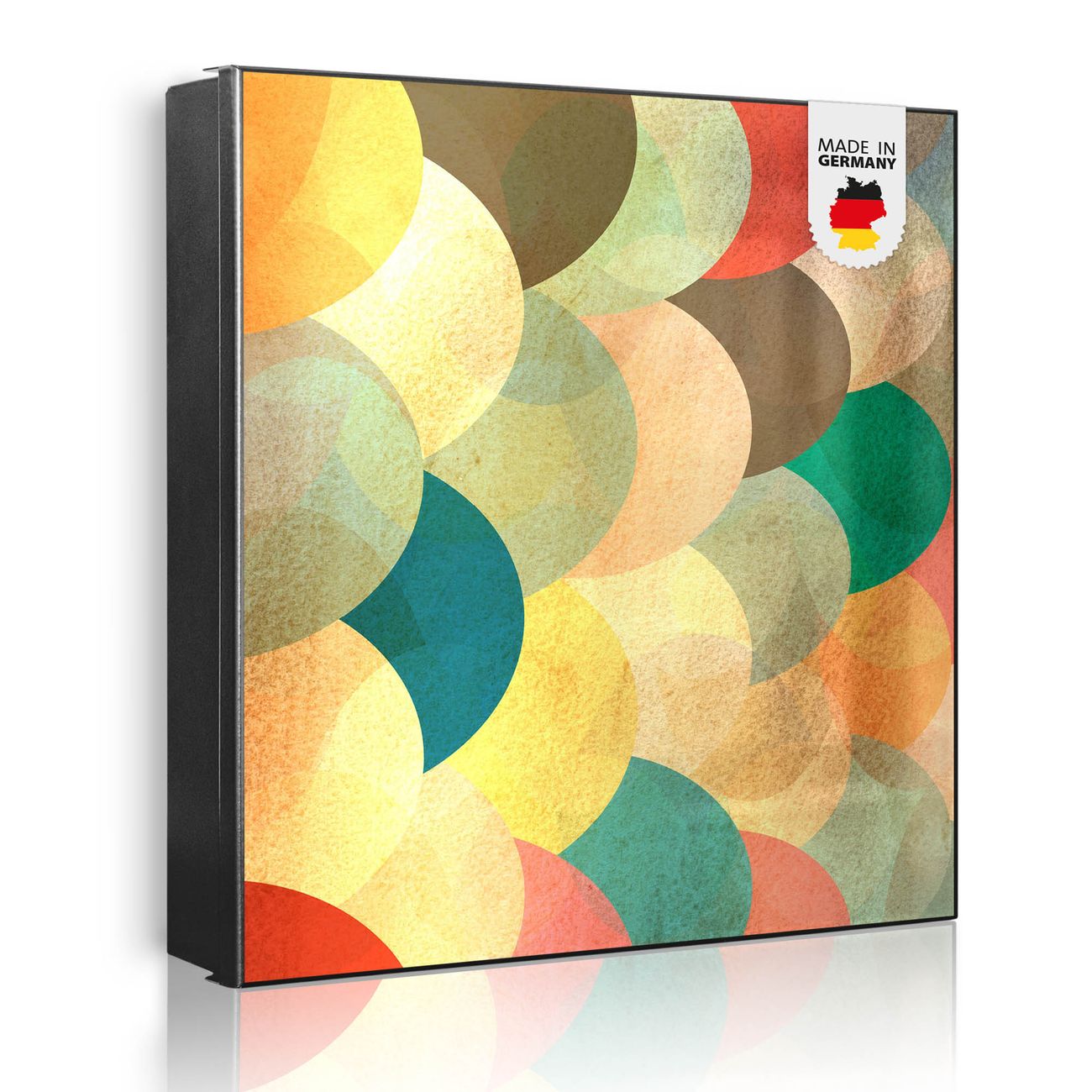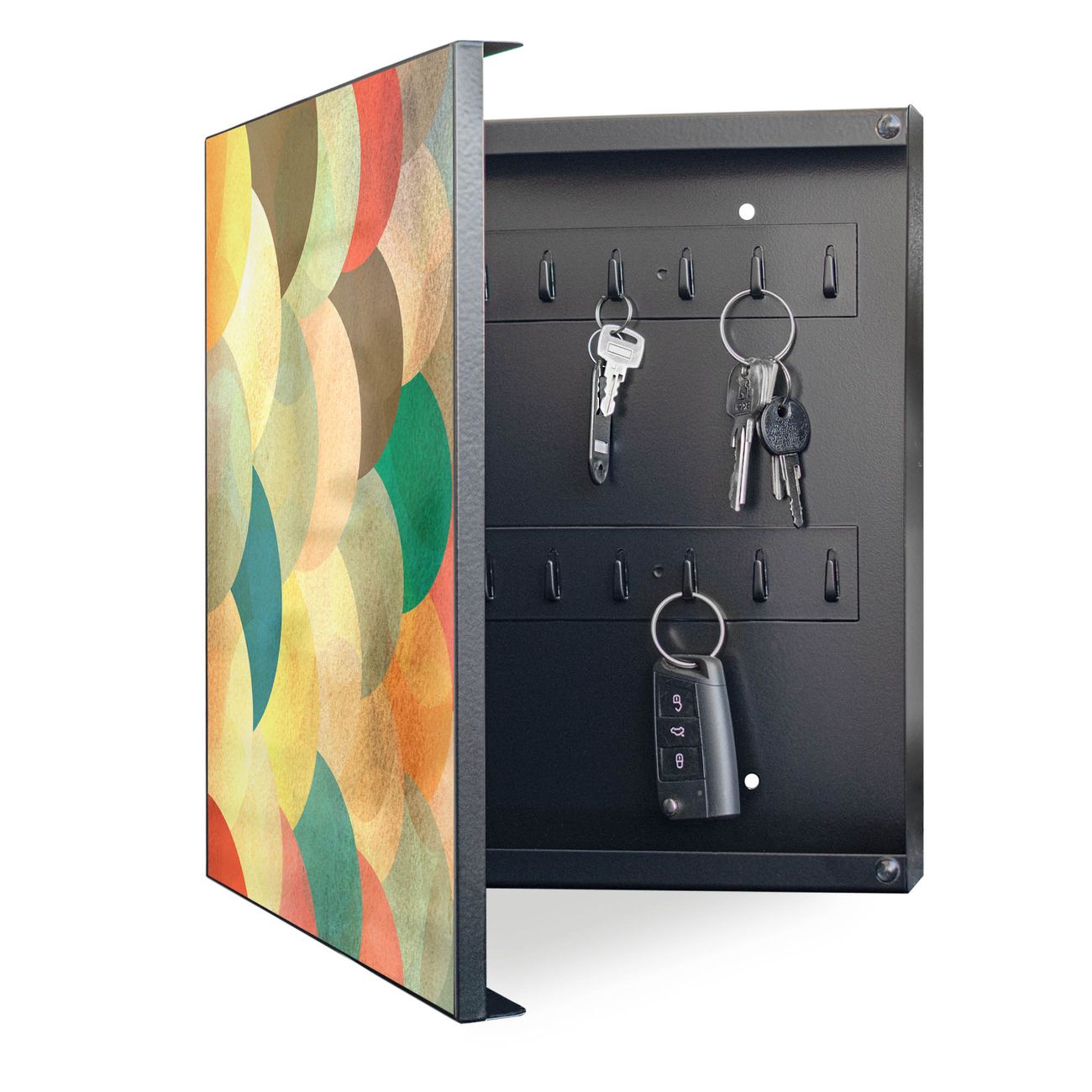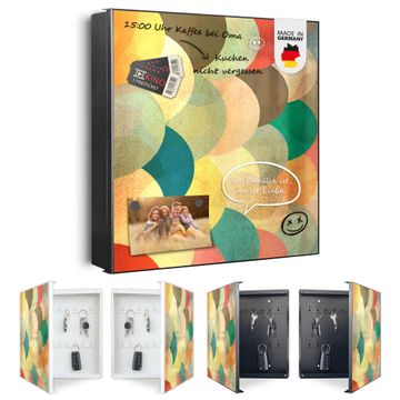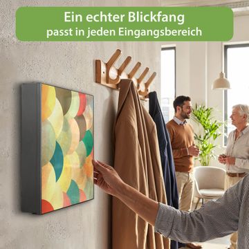 Bringe Ordnung und Eleganz in deinen Eingangsbereich mit dem banjado Schlüsselkasten Motiv Motiv Aquarell Schuppen. Die moderne Schlüsselbox kombiniert funktionales Design mit hochwertiger Verarbeitung und wird so zu einem echten Hingucker in Flur, Büro oder Ferienwohnung. ✅ Stilvolle Schlüsselaufbewahrung mit Motiv Motiv Aquarell Schuppen Der Design-Schlüsselkasten Motiv Motiv Aquarell Schuppen bietet Platz für bis zu 32 Schlüssel, die auf 4 stabilen Reihen mit je 8 Haken übersichtlich verstaut werden. Mit seinen kompakten Maßen von 30 x 30 x 5 cm passt die Schlüsselbox perfekt auch in kleinere Räume. Der schwarz lackierte Stahlkorpus mit links angeschlagenem Türscharnier harmoniert mit gedruckten Folie auf der Front und fügt sich nahtlos in jedes Wohnambiente ein. Ob als Schlüsselorganizer für Zuhause oder als praktische Lösung für Büros, Praxen und Gewerbe, der banjado Schlüsselkasten sorgt für Ordnung und Übersicht. Dank der magnetischen, mit Kreidestiften beschreibbaren Folie auf der Front kannst du Notizen anheften oder Termine direkt auf der Oberfläche festhalten. Die Schlüsselbox Motiv Motiv Aquarell Schuppen zur Wandmontage wird inklusive Befestigungsmaterial geliefert und ist schnell angebracht. So hast du deine Schlüssel jederzeit griffbereit und zugleich stilvoll verstaut. Mit diesem banjado Schlüsselkasten Motiv Motiv Aquarell Schuppen kombinierst du praktische Aufbewahrung mit stilvollem Wohndesign. Ob privat oder geschäftlich, die Schlüsselbox sorgt für mehr Ordnung, Übersicht und ein wohnliches Ambiente.Vorteile im Überblick