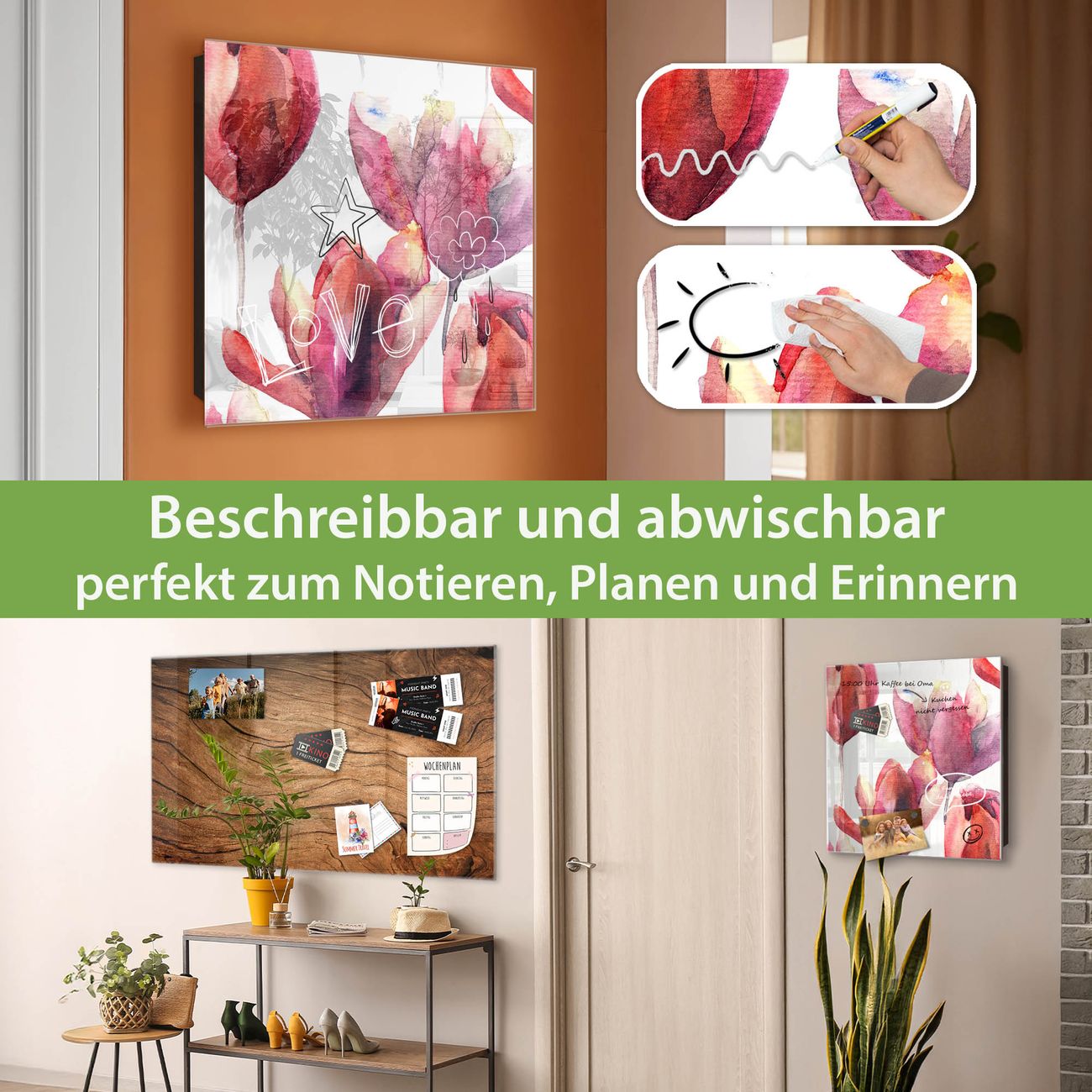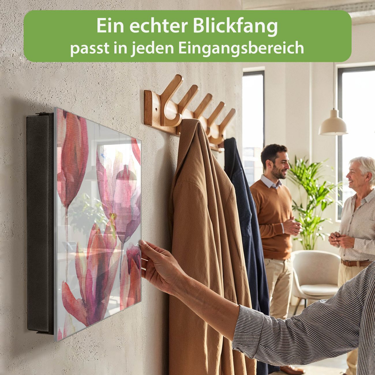 Bringe Ordnung und Eleganz in deinen Eingangsbereich mit dem banjado Schlüsselkasten Motiv Motiv Aquarell Tulpen. Die moderne Schlüsselbox kombiniert funktionales Design mit hochwertiger Verarbeitung und wird so zu einem echten Hingucker in Flur, Büro oder Ferienwohnung. ✅ Stilvolle Schlüsselaufbewahrung mit Glasfront im Motiv Motiv Aquarell Tulpen Der Design-Schlüsselkasten Motiv Motiv Aquarell Tulpen bietet Platz für bis zu 50 Schlüssel, die auf 5 stabilen Reihen mit je 10 Haken übersichtlich verstaut werden. Mit seinen kompakten Maßen von 30 x 30 x 5 cm passt die Schlüsselbox perfekt auch in kleinere Räume. Der schwarz lackierte Stahlkorpus mit rechts angeschlagenem Türscharnier harmoniert mit der Glasfront und fügt sich nahtlos in jedes Wohnambiente ein. Ob als Schlüsselorganizer für Zuhause oder als praktische Lösung für Büros, Praxen und Gewerbe, der banjado Schlüsselkasten sorgt für Ordnung und Übersicht. Dank der magnetischen, mit Kreidestiften beschreibbaren Glasfront kannst du Notizen anheften oder Termine direkt auf der Oberfläche festhalten. Die Schlüsselbox Motiv Motiv Aquarell Tulpen zur Wandmontage wird inklusive Befestigungsmaterial geliefert und ist schnell angebracht. So hast du deine Schlüssel jederzeit griffbereit und zugleich stilvoll verstaut. Mit diesem banjado Schlüsselkasten Motiv Motiv Aquarell Tulpen kombinierst du praktische Aufbewahrung mit stilvollem Wohndesign. Ob privat oder geschäftlich, die Schlüsselbox sorgt für mehr Ordnung, Übersicht und ein wohnliches Ambiente.Vorteile im Überblick