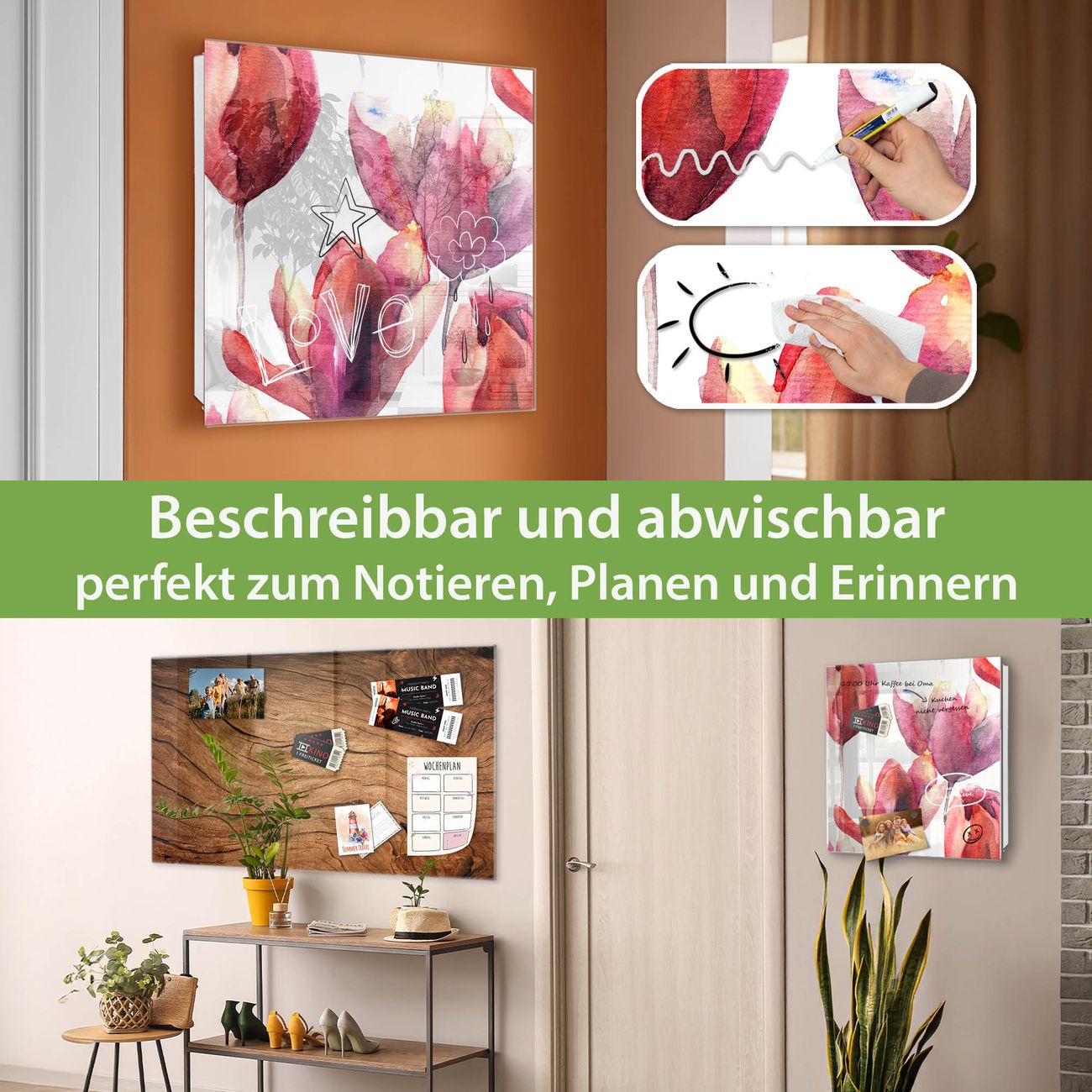 ✅ Magnetisch und mit Kreidestift beschreibbar, gehärtetes Glas, links angeschlagene TürOrdnung und Design in einem