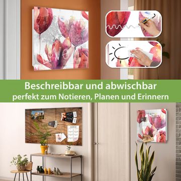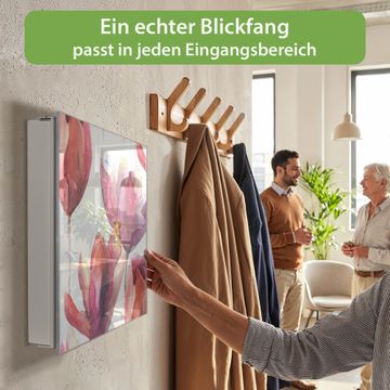 Bringe Ordnung und Eleganz in deinen Eingangsbereich mit dem banjado Schlüsselkasten Motiv Motiv Aquarell Tulpen. Die moderne Schlüsselbox kombiniert funktionales Design mit hochwertiger Verarbeitung und wird so zu einem echten Hingucker in Flur, Büro oder Ferienwohnung. ✅ Stilvolle Schlüsselaufbewahrung mit Glasfront im Motiv Motiv Aquarell Tulpen Der Design-Schlüsselkasten Motiv Motiv Aquarell Tulpen bietet Platz für bis zu 50 Schlüssel, die auf 5 stabilen Reihen mit je 10 Haken übersichtlich verstaut werden. Mit seinen kompakten Maßen von 30 x 30 x 5 cm passt die Schlüsselbox perfekt auch in kleinere Räume. Der weiß lackierte Stahlkorpus mit rechts angeschlagenem Türscharnier harmoniert mit der Glasfront und fügt sich nahtlos in jedes Wohnambiente ein. Ob als Schlüsselorganizer für Zuhause oder als praktische Lösung für Büros, Praxen und Gewerbe, der banjado Schlüsselkasten sorgt für Ordnung und Übersicht. Dank der magnetischen, mit Kreidestiften beschreibbaren Glasfront kannst du Notizen anheften oder Termine direkt auf der Oberfläche festhalten. Die Schlüsselbox Motiv Motiv Aquarell Tulpen zur Wandmontage wird inklusive Befestigungsmaterial geliefert und ist schnell angebracht. So hast du deine Schlüssel jederzeit griffbereit und zugleich stilvoll verstaut. Mit diesem banjado Schlüsselkasten Motiv Motiv Aquarell Tulpen kombinierst du praktische Aufbewahrung mit stilvollem Wohndesign. Ob privat oder geschäftlich, die Schlüsselbox sorgt für mehr Ordnung, Übersicht und ein wohnliches Ambiente.Vorteile im Überblick