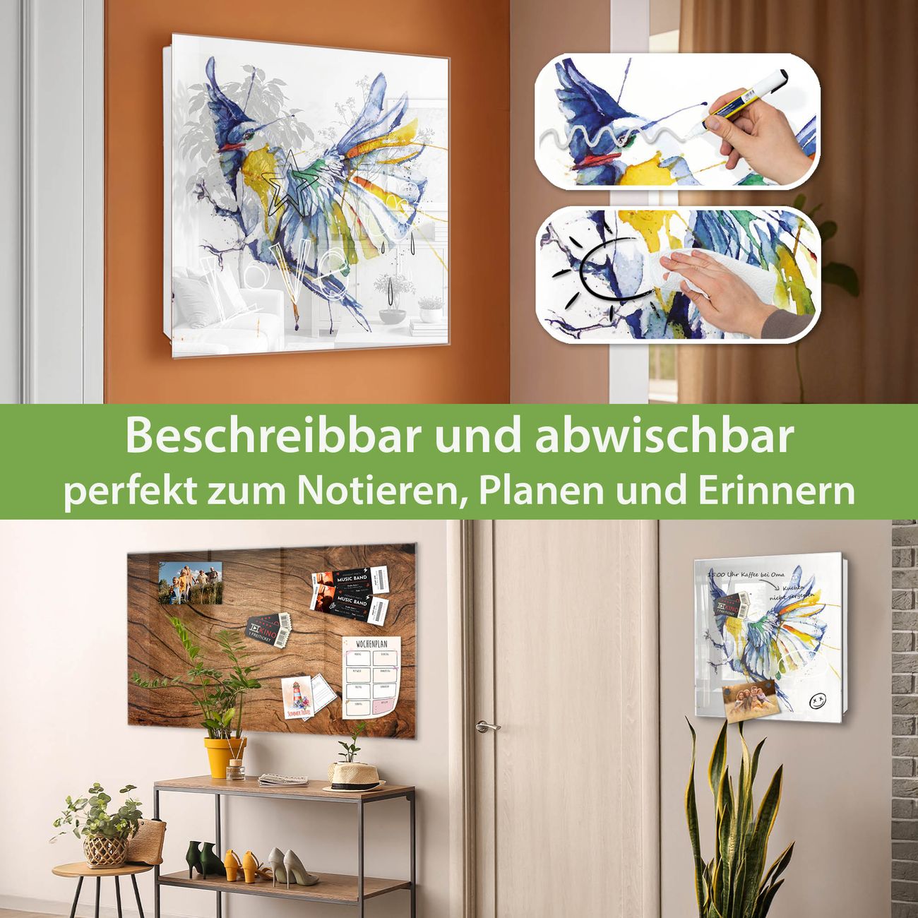 Bringe Ordnung und Eleganz in deinen Eingangsbereich mit dem banjado Schlüsselkasten Motiv Motiv Aquarell Vogel. Die moderne Schlüsselbox kombiniert funktionales Design mit hochwertiger Verarbeitung und wird so zu einem echten Hingucker in Flur, Büro oder Ferienwohnung. ✅ Stilvolle Schlüsselaufbewahrung mit Glasfront im Motiv Motiv Aquarell Vogel Der Design-Schlüsselkasten Motiv Motiv Aquarell Vogel bietet Platz für bis zu 50 Schlüssel, die auf 5 stabilen Reihen mit je 10 Haken übersichtlich verstaut werden. Mit seinen kompakten Maßen von 30 x 30 x 5 cm passt die Schlüsselbox perfekt auch in kleinere Räume. Der weiß lackierte Stahlkorpus mit rechts angeschlagenem Türscharnier harmoniert mit der Glasfront und fügt sich nahtlos in jedes Wohnambiente ein. Ob als Schlüsselorganizer für Zuhause oder als praktische Lösung für Büros, Praxen und Gewerbe, der banjado Schlüsselkasten sorgt für Ordnung und Übersicht. Dank der magnetischen, mit Kreidestiften beschreibbaren Glasfront kannst du Notizen anheften oder Termine direkt auf der Oberfläche festhalten. Die Schlüsselbox Motiv Motiv Aquarell Vogel zur Wandmontage wird inklusive Befestigungsmaterial geliefert und ist schnell angebracht. So hast du deine Schlüssel jederzeit griffbereit und zugleich stilvoll verstaut. Mit diesem banjado Schlüsselkasten Motiv Motiv Aquarell Vogel kombinierst du praktische Aufbewahrung mit stilvollem Wohndesign. Ob privat oder geschäftlich, die Schlüsselbox sorgt für mehr Ordnung, Übersicht und ein wohnliches Ambiente.Vorteile im Überblick