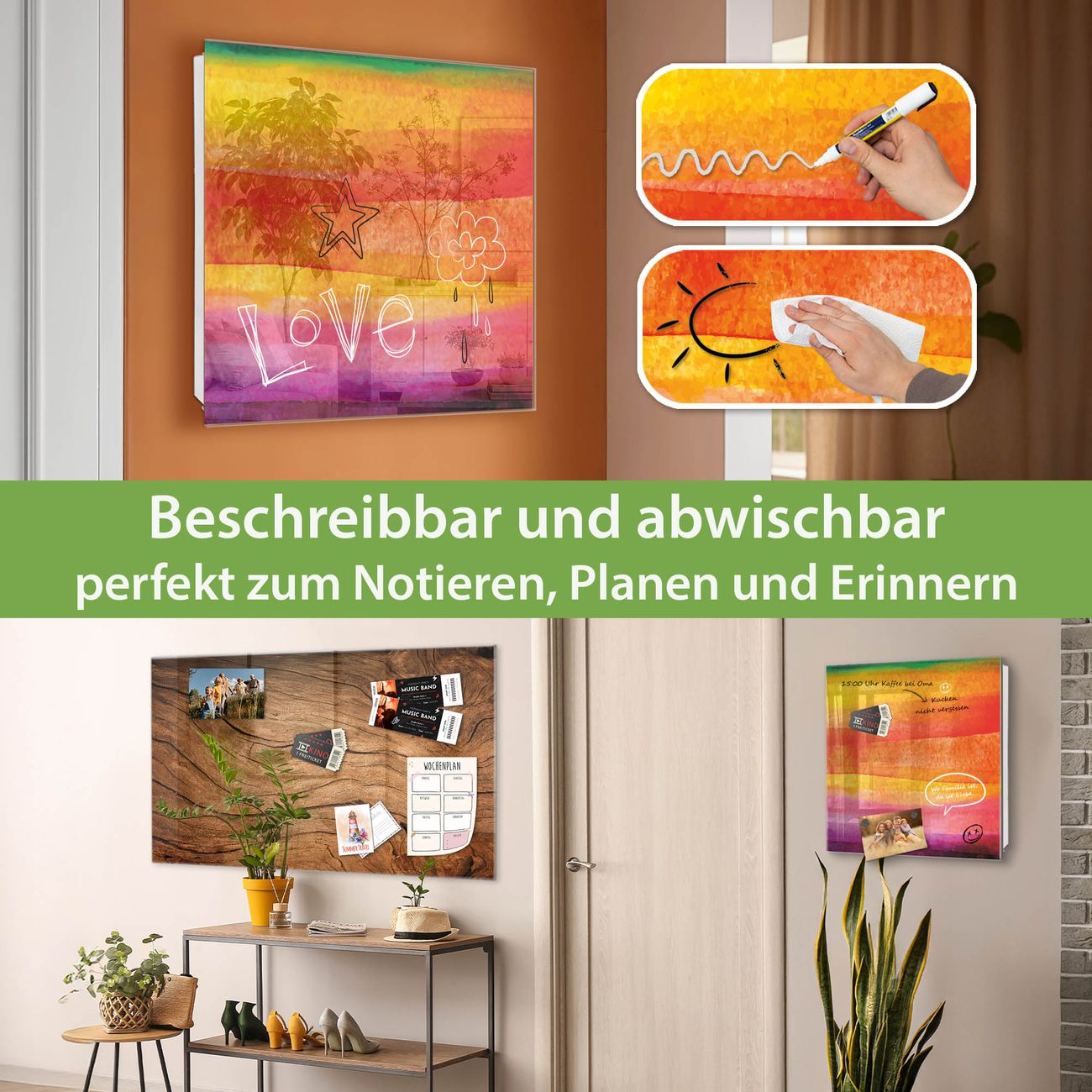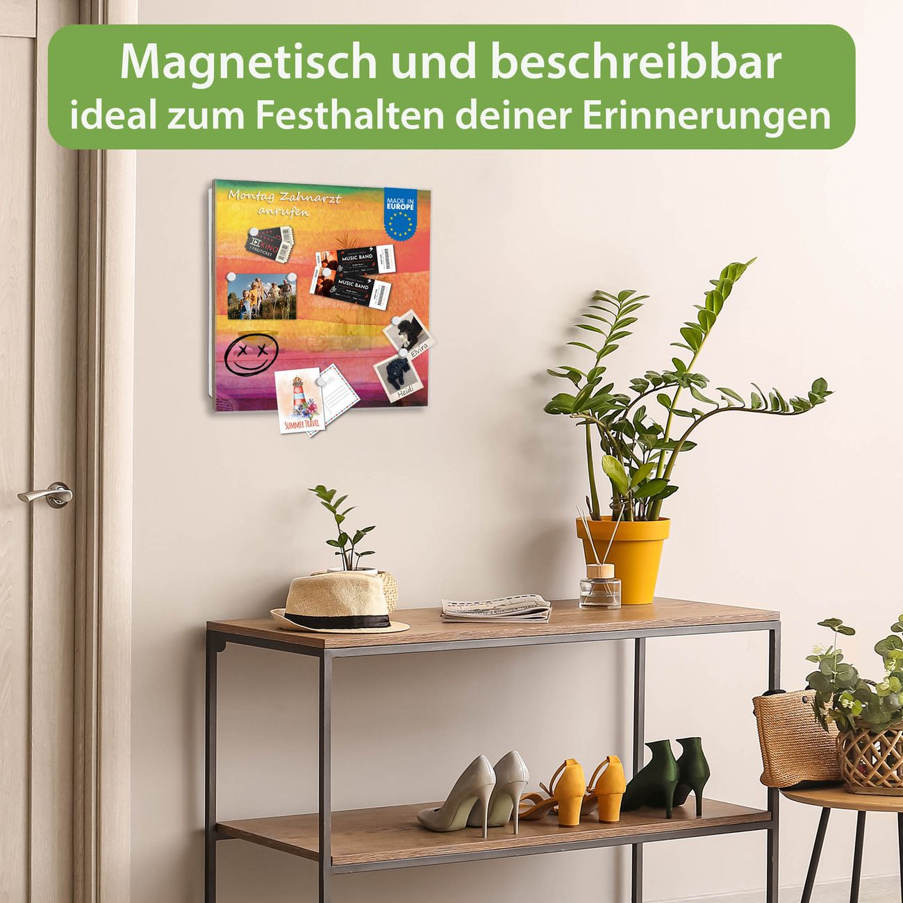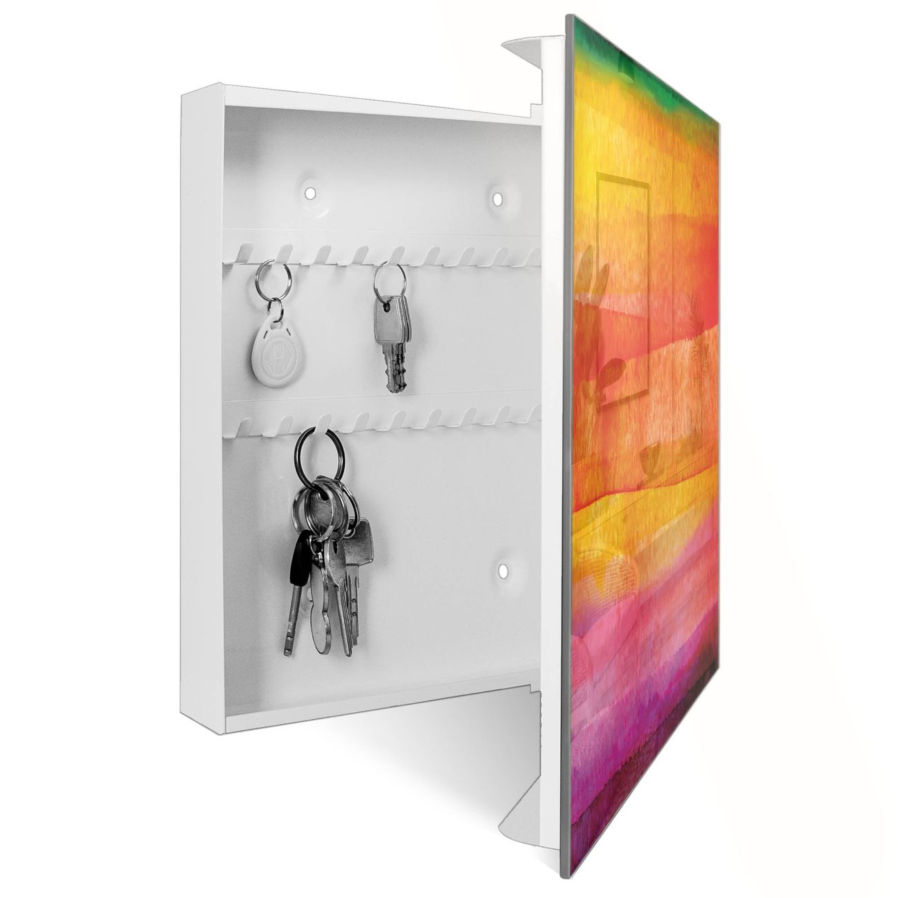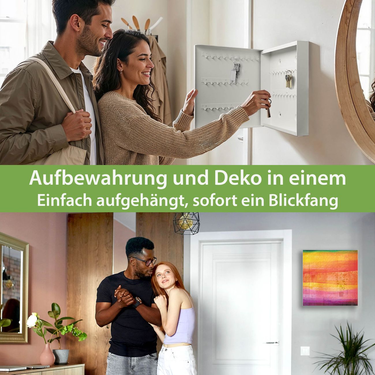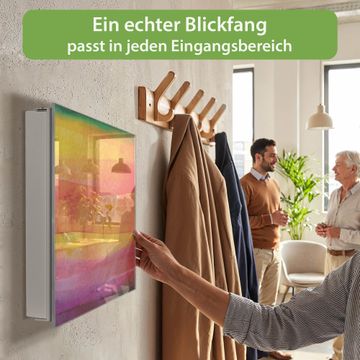 Bringe Ordnung und Eleganz in deinen Eingangsbereich mit dem banjado Schlüsselkasten Motiv Motiv Aquarell. Die moderne Schlüsselbox kombiniert funktionales Design mit hochwertiger Verarbeitung und wird so zu einem echten Hingucker in Flur, Büro oder Ferienwohnung. ✅ Stilvolle Schlüsselaufbewahrung mit Glasfront im Motiv Motiv Aquarell Der Design-Schlüsselkasten Motiv Motiv Aquarell bietet Platz für bis zu 50 Schlüssel, die auf 5 stabilen Reihen mit je 10 Haken übersichtlich verstaut werden. Mit seinen kompakten Maßen von 30 x 30 x 5 cm passt die Schlüsselbox perfekt auch in kleinere Räume. Der weiß lackierte Stahlkorpus mit rechts angeschlagenem Türscharnier harmoniert mit der Glasfront und fügt sich nahtlos in jedes Wohnambiente ein. Ob als Schlüsselorganizer für Zuhause oder als praktische Lösung für Büros, Praxen und Gewerbe, der banjado Schlüsselkasten sorgt für Ordnung und Übersicht. Dank der magnetischen, mit Kreidestiften beschreibbaren Glasfront kannst du Notizen anheften oder Termine direkt auf der Oberfläche festhalten. Die Schlüsselbox Motiv Motiv Aquarell zur Wandmontage wird inklusive Befestigungsmaterial geliefert und ist schnell angebracht. So hast du deine Schlüssel jederzeit griffbereit und zugleich stilvoll verstaut. Mit diesem banjado Schlüsselkasten Motiv Motiv Aquarell kombinierst du praktische Aufbewahrung mit stilvollem Wohndesign. Ob privat oder geschäftlich, die Schlüsselbox sorgt für mehr Ordnung, Übersicht und ein wohnliches Ambiente.Vorteile im Überblick