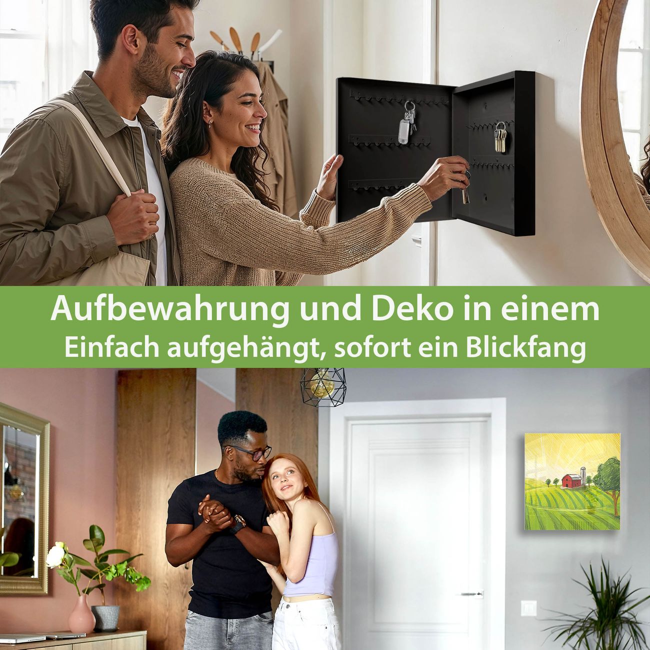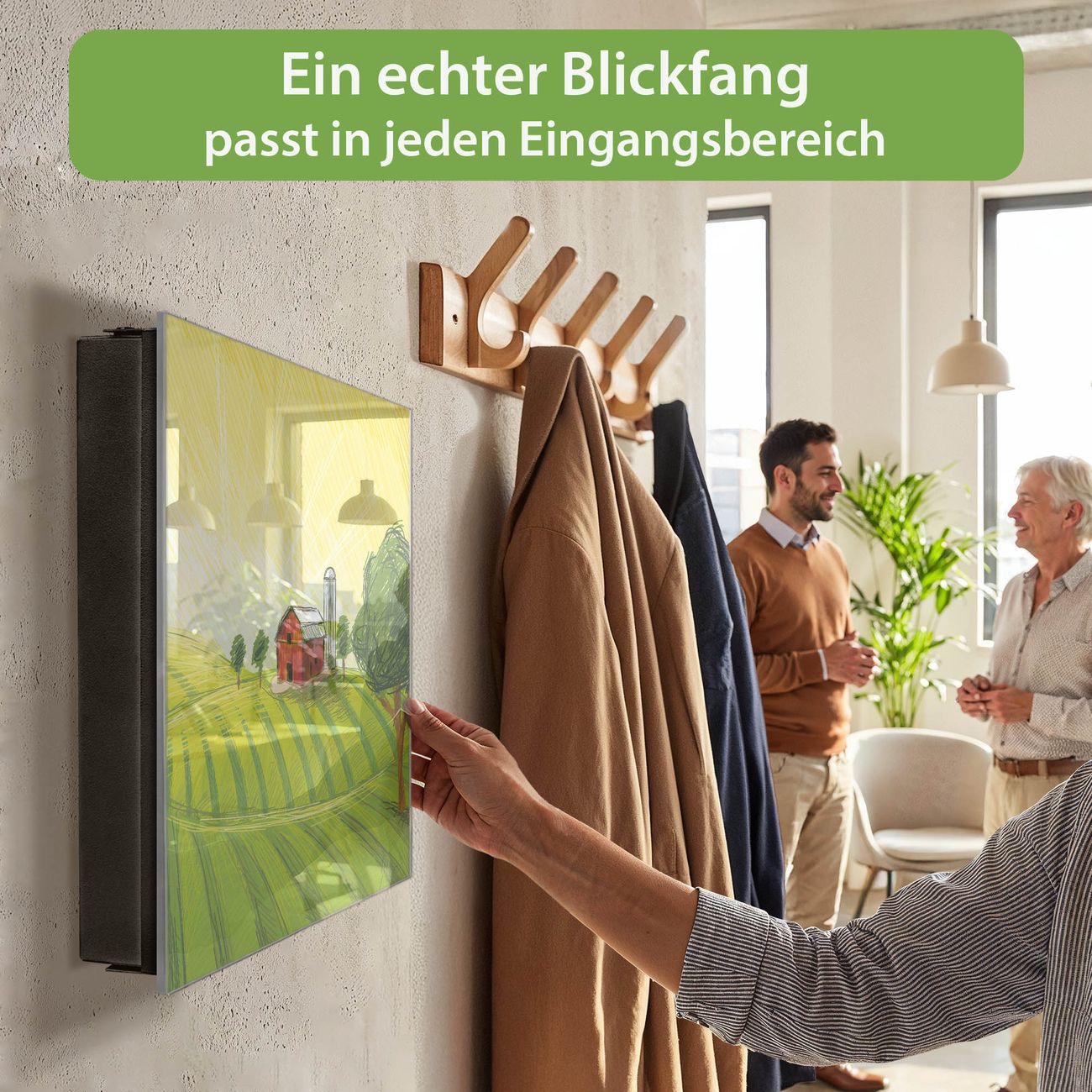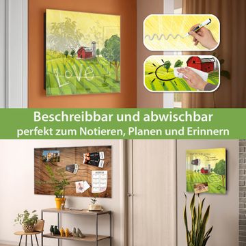 Bringe Ordnung und Eleganz in deinen Eingangsbereich mit dem banjado Schlüsselkasten Motiv Motiv Auf dem Land. Die moderne Schlüsselbox kombiniert funktionales Design mit hochwertiger Verarbeitung und wird so zu einem echten Hingucker in Flur, Büro oder Ferienwohnung. ✅ Stilvolle Schlüsselaufbewahrung mit Glasfront im Motiv Motiv Auf dem Land Der Design-Schlüsselkasten Motiv Motiv Auf dem Land bietet Platz für bis zu 50 Schlüssel, die auf 5 stabilen Reihen mit je 10 Haken übersichtlich verstaut werden. Mit seinen kompakten Maßen von 30 x 30 x 5 cm passt die Schlüsselbox perfekt auch in kleinere Räume. Der schwarz lackierte Stahlkorpus mit rechts angeschlagenem Türscharnier harmoniert mit der Glasfront und fügt sich nahtlos in jedes Wohnambiente ein. Ob als Schlüsselorganizer für Zuhause oder als praktische Lösung für Büros, Praxen und Gewerbe, der banjado Schlüsselkasten sorgt für Ordnung und Übersicht. Dank der magnetischen, mit Kreidestiften beschreibbaren Glasfront kannst du Notizen anheften oder Termine direkt auf der Oberfläche festhalten. Die Schlüsselbox Motiv Motiv Auf dem Land zur Wandmontage wird inklusive Befestigungsmaterial geliefert und ist schnell angebracht. So hast du deine Schlüssel jederzeit griffbereit und zugleich stilvoll verstaut. Mit diesem banjado Schlüsselkasten Motiv Motiv Auf dem Land kombinierst du praktische Aufbewahrung mit stilvollem Wohndesign. Ob privat oder geschäftlich, die Schlüsselbox sorgt für mehr Ordnung, Übersicht und ein wohnliches Ambiente.Vorteile im Überblick