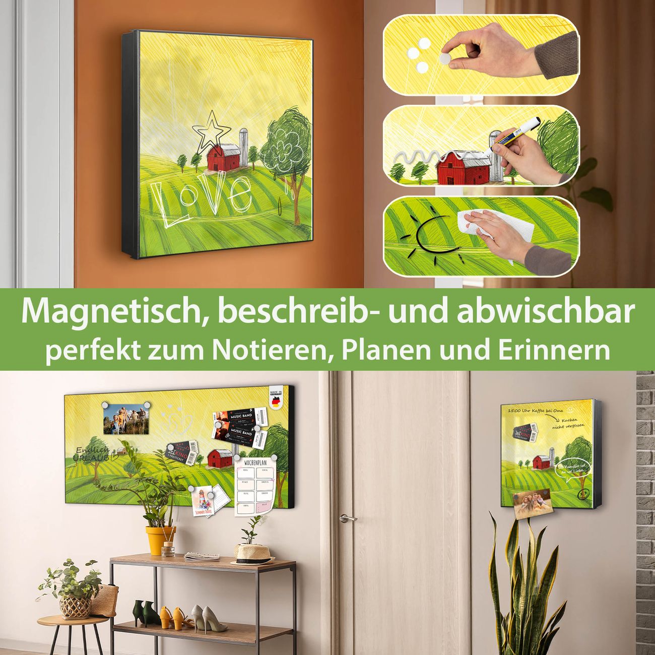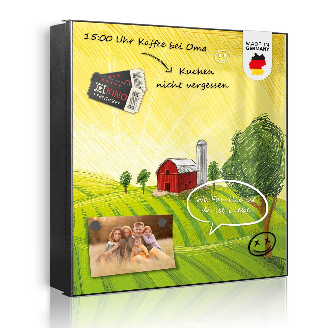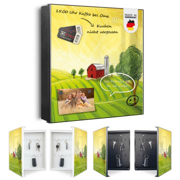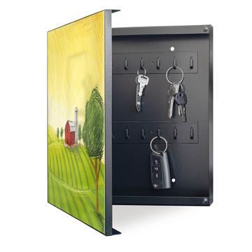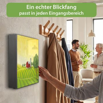 Bringe Ordnung und Eleganz in deinen Eingangsbereich mit dem banjado Schlüsselkasten Motiv Motiv Auf dem Land. Die moderne Schlüsselbox kombiniert funktionales Design mit hochwertiger Verarbeitung und wird so zu einem echten Hingucker in Flur, Büro oder Ferienwohnung. ✅ Stilvolle Schlüsselaufbewahrung mit Motiv Motiv Auf dem Land Der Design-Schlüsselkasten Motiv Motiv Auf dem Land bietet Platz für bis zu 32 Schlüssel, die auf 4 stabilen Reihen mit je 8 Haken übersichtlich verstaut werden. Mit seinen kompakten Maßen von 30 x 30 x 5 cm passt die Schlüsselbox perfekt auch in kleinere Räume. Der schwarz lackierte Stahlkorpus mit links angeschlagenem Türscharnier harmoniert mit gedruckten Folie auf der Front und fügt sich nahtlos in jedes Wohnambiente ein. Ob als Schlüsselorganizer für Zuhause oder als praktische Lösung für Büros, Praxen und Gewerbe, der banjado Schlüsselkasten sorgt für Ordnung und Übersicht. Dank der magnetischen, mit Kreidestiften beschreibbaren Folie auf der Front kannst du Notizen anheften oder Termine direkt auf der Oberfläche festhalten. Die Schlüsselbox Motiv Motiv Auf dem Land zur Wandmontage wird inklusive Befestigungsmaterial geliefert und ist schnell angebracht. So hast du deine Schlüssel jederzeit griffbereit und zugleich stilvoll verstaut. Mit diesem banjado Schlüsselkasten Motiv Motiv Auf dem Land kombinierst du praktische Aufbewahrung mit stilvollem Wohndesign. Ob privat oder geschäftlich, die Schlüsselbox sorgt für mehr Ordnung, Übersicht und ein wohnliches Ambiente.Vorteile im Überblick