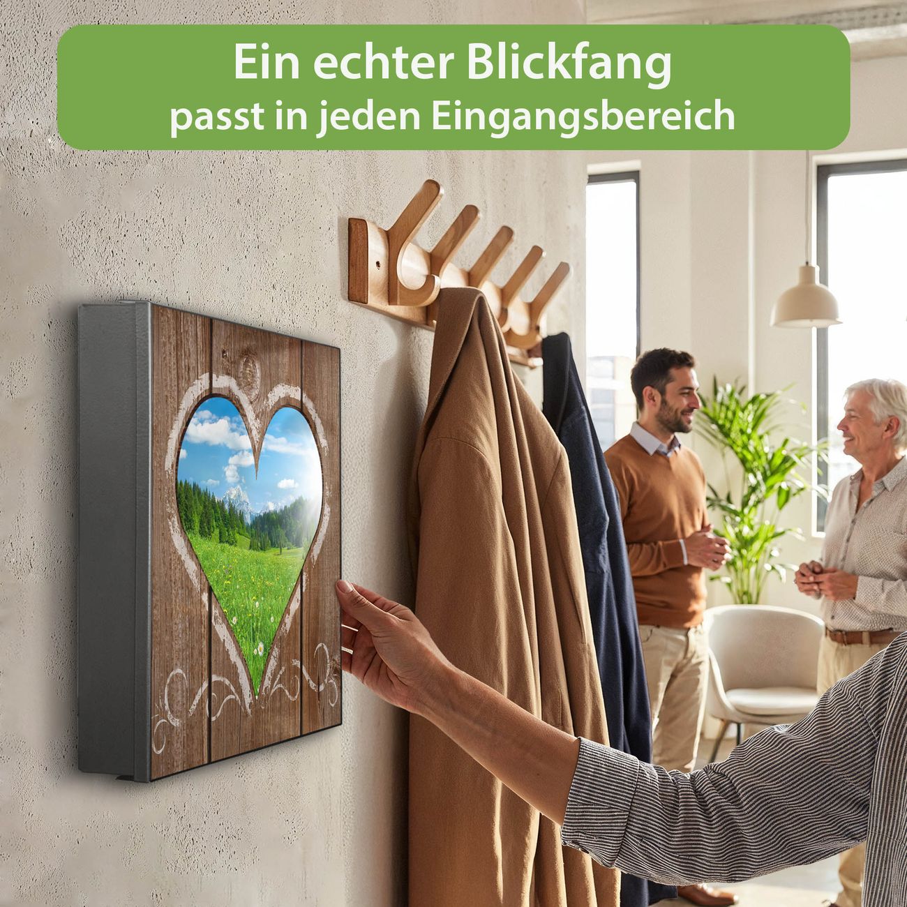 Bringe Ordnung und Eleganz in deinen Eingangsbereich mit dem banjado Schlüsselkasten Motiv Motiv Ausblick mit Herz. Die moderne Schlüsselbox kombiniert funktionales Design mit hochwertiger Verarbeitung und wird so zu einem echten Hingucker in Flur, Büro oder Ferienwohnung. ✅ Stilvolle Schlüsselaufbewahrung mit Motiv Motiv Ausblick mit Herz Der Design-Schlüsselkasten Motiv Motiv Ausblick mit Herz bietet Platz für bis zu 32 Schlüssel, die auf 4 stabilen Reihen mit je 8 Haken übersichtlich verstaut werden. Mit seinen kompakten Maßen von 30 x 30 x 5 cm passt die Schlüsselbox perfekt auch in kleinere Räume. Der schwarz lackierte Stahlkorpus mit links angeschlagenem Türscharnier harmoniert mit gedruckten Folie auf der Front und fügt sich nahtlos in jedes Wohnambiente ein. Ob als Schlüsselorganizer für Zuhause oder als praktische Lösung für Büros, Praxen und Gewerbe, der banjado Schlüsselkasten sorgt für Ordnung und Übersicht. Dank der magnetischen, mit Kreidestiften beschreibbaren Folie auf der Front kannst du Notizen anheften oder Termine direkt auf der Oberfläche festhalten. Die Schlüsselbox Motiv Motiv Ausblick mit Herz zur Wandmontage wird inklusive Befestigungsmaterial geliefert und ist schnell angebracht. So hast du deine Schlüssel jederzeit griffbereit und zugleich stilvoll verstaut. Mit diesem banjado Schlüsselkasten Motiv Motiv Ausblick mit Herz kombinierst du praktische Aufbewahrung mit stilvollem Wohndesign. Ob privat oder geschäftlich, die Schlüsselbox sorgt für mehr Ordnung, Übersicht und ein wohnliches Ambiente.Vorteile im Überblick
