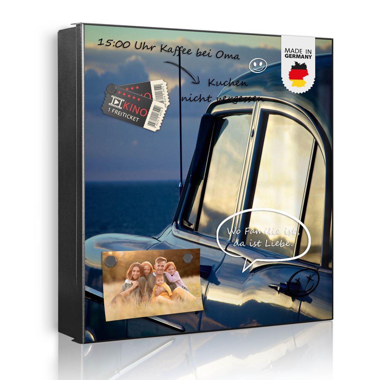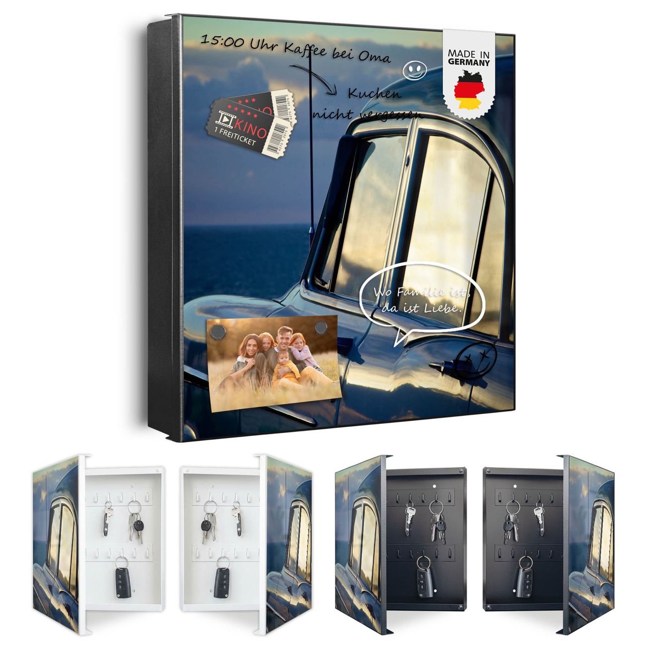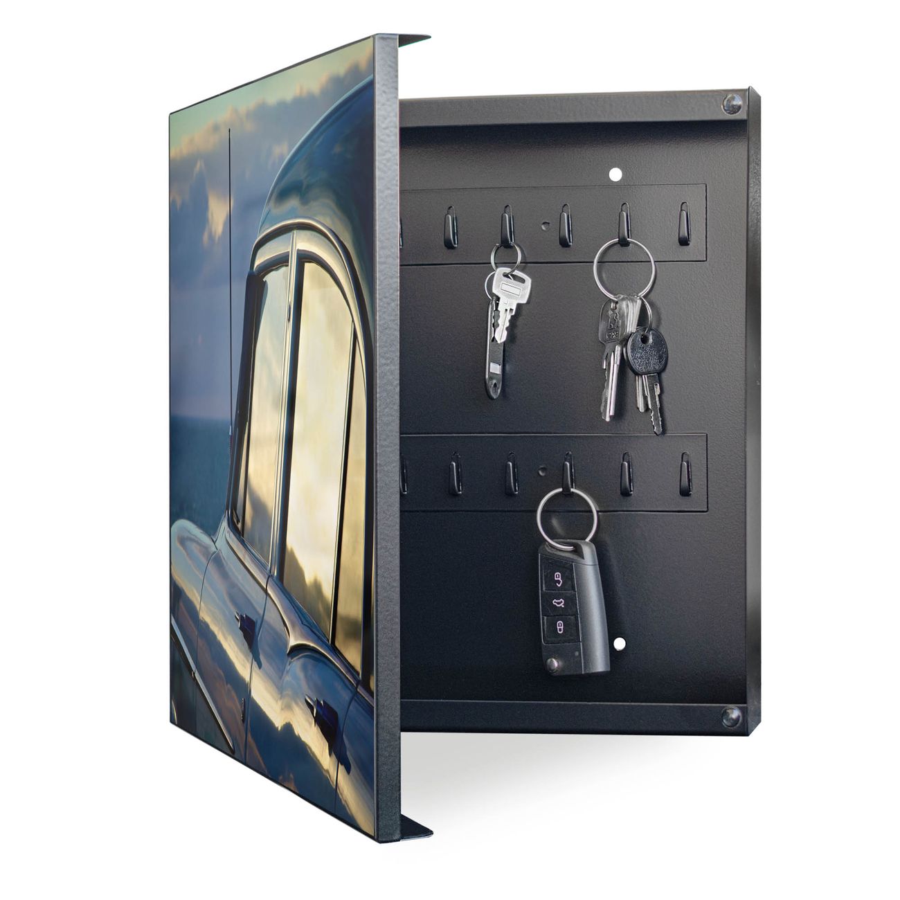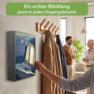 Bringe Ordnung und Eleganz in deinen Eingangsbereich mit dem banjado Schlüsselkasten Motiv Motiv Auto am Strand. Die moderne Schlüsselbox kombiniert funktionales Design mit hochwertiger Verarbeitung und wird so zu einem echten Hingucker in Flur, Büro oder Ferienwohnung. ✅ Stilvolle Schlüsselaufbewahrung mit Motiv Motiv Auto am Strand Der Design-Schlüsselkasten Motiv Motiv Auto am Strand bietet Platz für bis zu 32 Schlüssel, die auf 4 stabilen Reihen mit je 8 Haken übersichtlich verstaut werden. Mit seinen kompakten Maßen von 30 x 30 x 5 cm passt die Schlüsselbox perfekt auch in kleinere Räume. Der schwarz lackierte Stahlkorpus mit links angeschlagenem Türscharnier harmoniert mit gedruckten Folie auf der Front und fügt sich nahtlos in jedes Wohnambiente ein. Ob als Schlüsselorganizer für Zuhause oder als praktische Lösung für Büros, Praxen und Gewerbe, der banjado Schlüsselkasten sorgt für Ordnung und Übersicht. Dank der magnetischen, mit Kreidestiften beschreibbaren Folie auf der Front kannst du Notizen anheften oder Termine direkt auf der Oberfläche festhalten. Die Schlüsselbox Motiv Motiv Auto am Strand zur Wandmontage wird inklusive Befestigungsmaterial geliefert und ist schnell angebracht. So hast du deine Schlüssel jederzeit griffbereit und zugleich stilvoll verstaut. Mit diesem banjado Schlüsselkasten Motiv Motiv Auto am Strand kombinierst du praktische Aufbewahrung mit stilvollem Wohndesign. Ob privat oder geschäftlich, die Schlüsselbox sorgt für mehr Ordnung, Übersicht und ein wohnliches Ambiente.Vorteile im Überblick