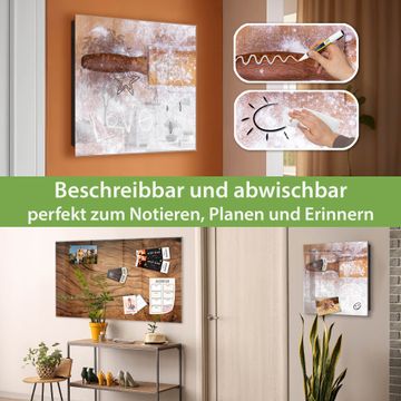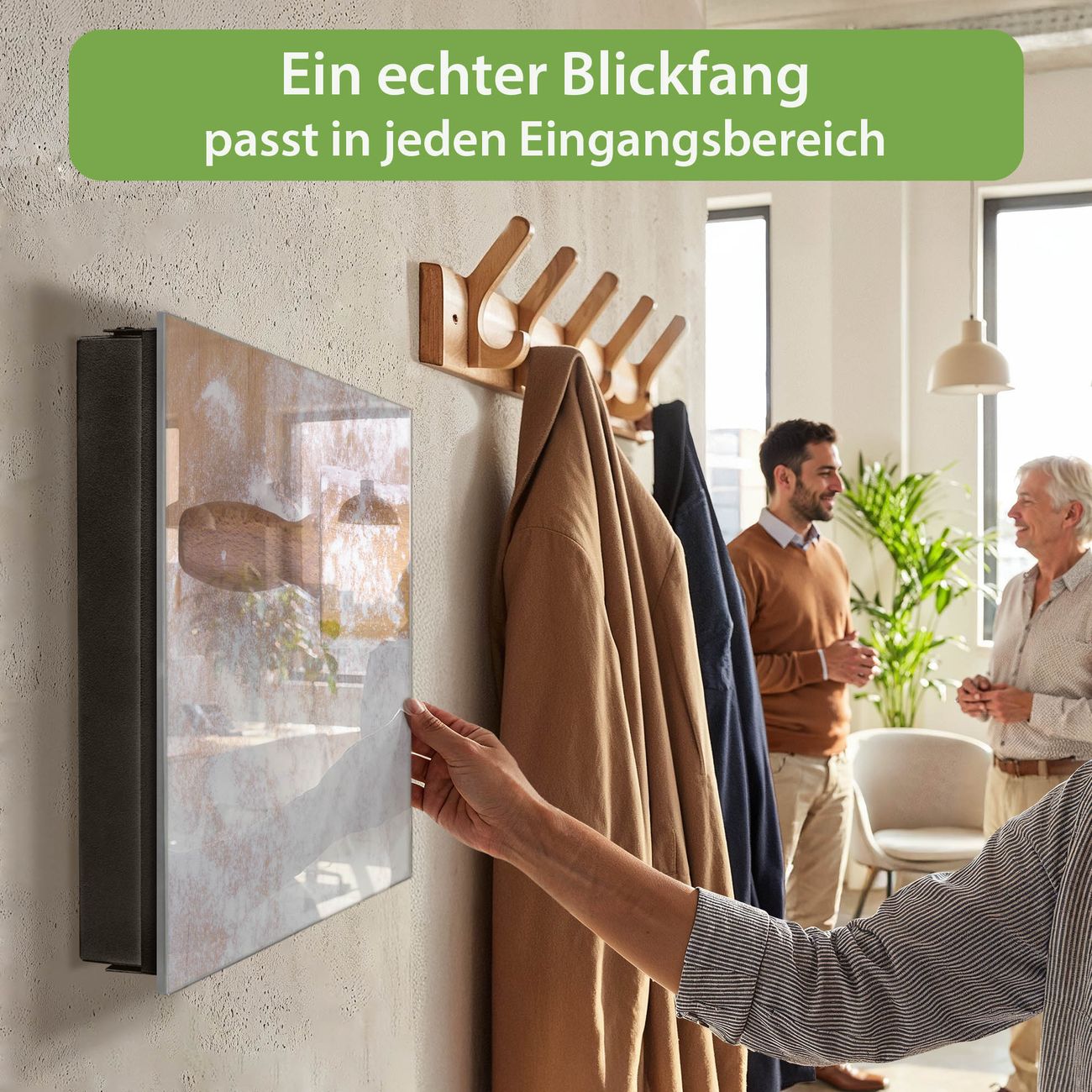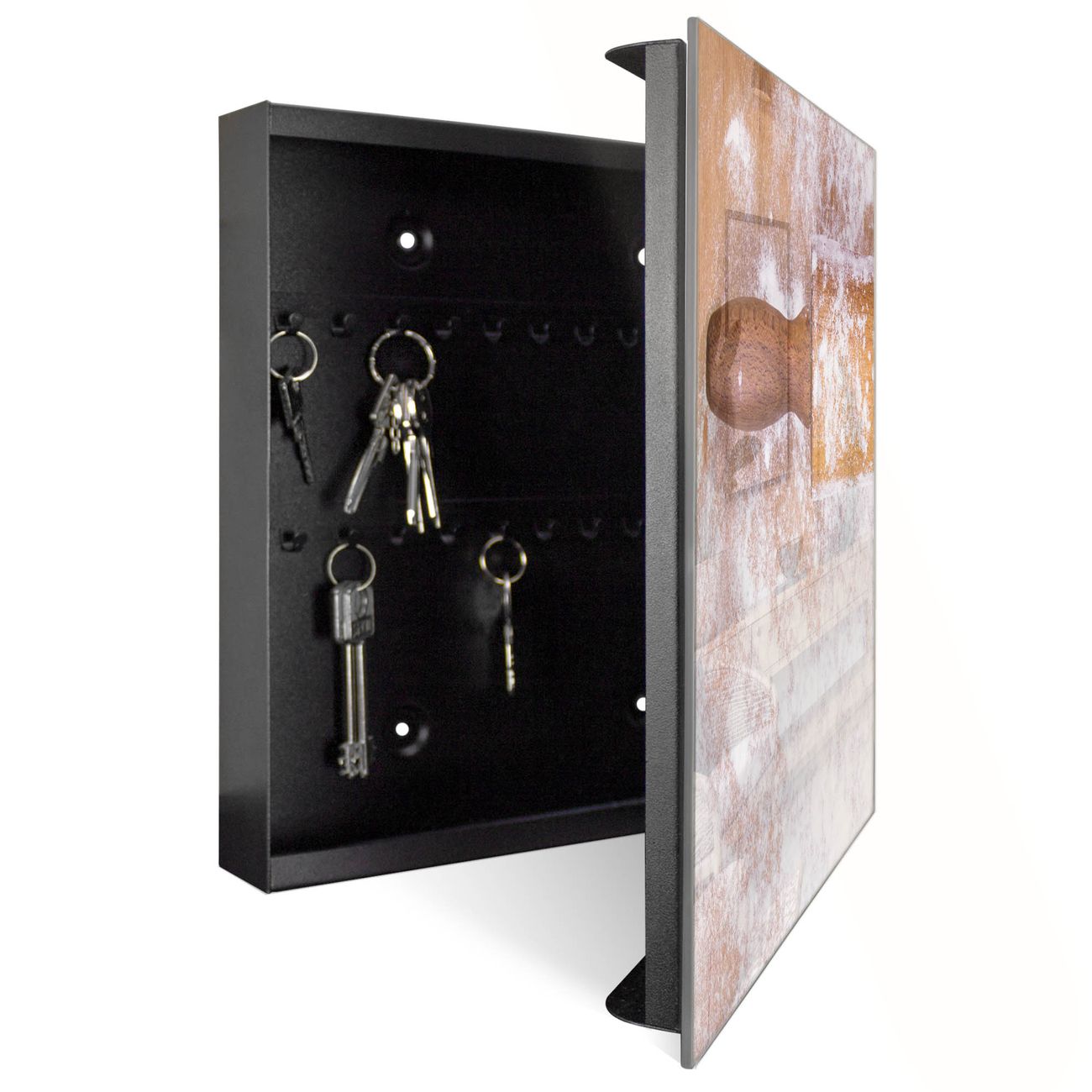 Bringe Ordnung und Eleganz in deinen Eingangsbereich mit dem banjado Schlüsselkasten Motiv Motiv Backen. Die moderne Schlüsselbox kombiniert funktionales Design mit hochwertiger Verarbeitung und wird so zu einem echten Hingucker in Flur, Büro oder Ferienwohnung. ✅ Stilvolle Schlüsselaufbewahrung mit Glasfront im Motiv Motiv Backen Der Design-Schlüsselkasten Motiv Motiv Backen bietet Platz für bis zu 50 Schlüssel, die auf 5 stabilen Reihen mit je 10 Haken übersichtlich verstaut werden. Mit seinen kompakten Maßen von 30 x 30 x 5 cm passt die Schlüsselbox perfekt auch in kleinere Räume. Der schwarz lackierte Stahlkorpus mit rechts angeschlagenem Türscharnier harmoniert mit der Glasfront und fügt sich nahtlos in jedes Wohnambiente ein. Ob als Schlüsselorganizer für Zuhause oder als praktische Lösung für Büros, Praxen und Gewerbe, der banjado Schlüsselkasten sorgt für Ordnung und Übersicht. Dank der magnetischen, mit Kreidestiften beschreibbaren Glasfront kannst du Notizen anheften oder Termine direkt auf der Oberfläche festhalten. Die Schlüsselbox Motiv Motiv Backen zur Wandmontage wird inklusive Befestigungsmaterial geliefert und ist schnell angebracht. So hast du deine Schlüssel jederzeit griffbereit und zugleich stilvoll verstaut. Mit diesem banjado Schlüsselkasten Motiv Motiv Backen kombinierst du praktische Aufbewahrung mit stilvollem Wohndesign. Ob privat oder geschäftlich, die Schlüsselbox sorgt für mehr Ordnung, Übersicht und ein wohnliches Ambiente.Vorteile im Überblick