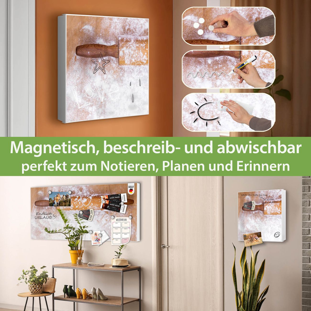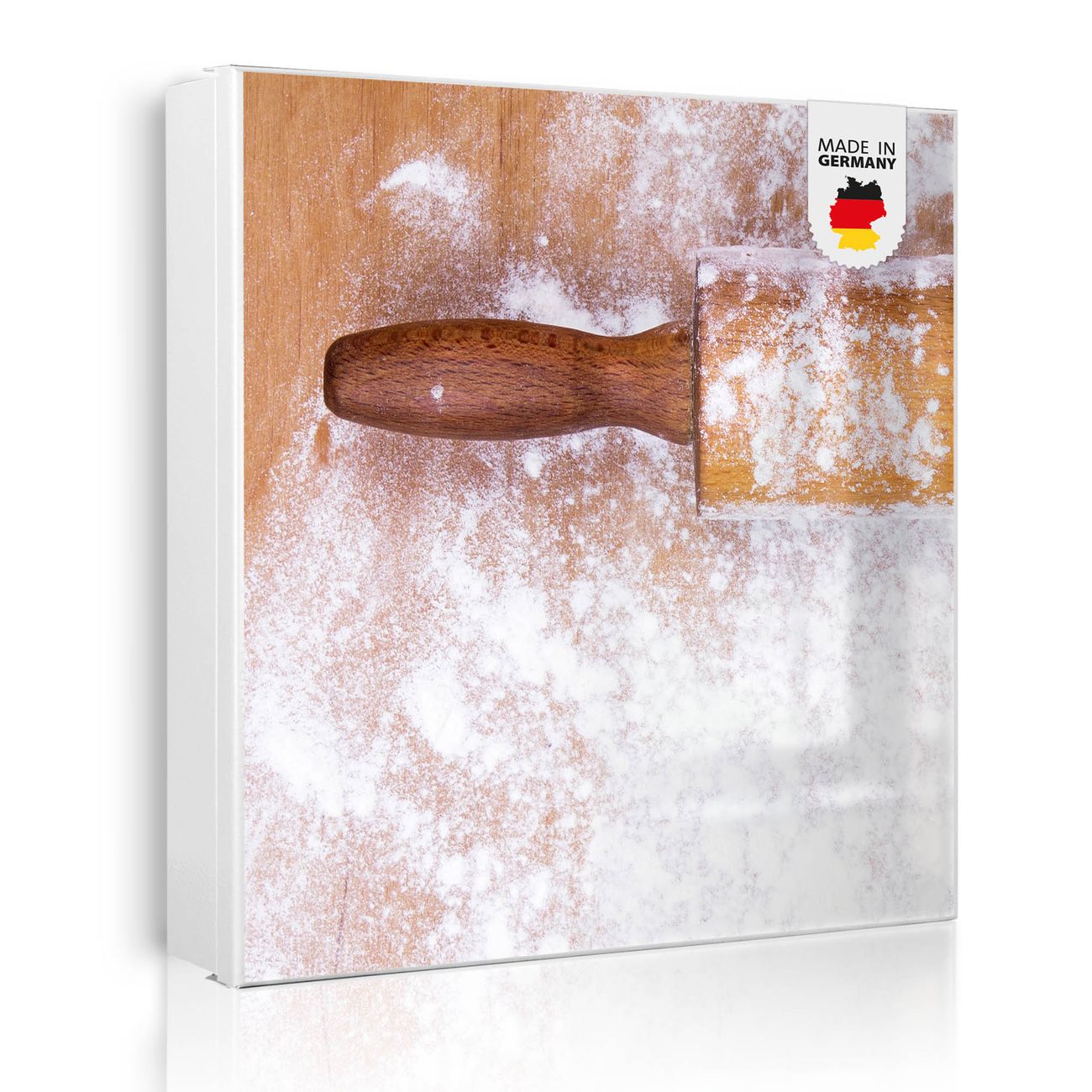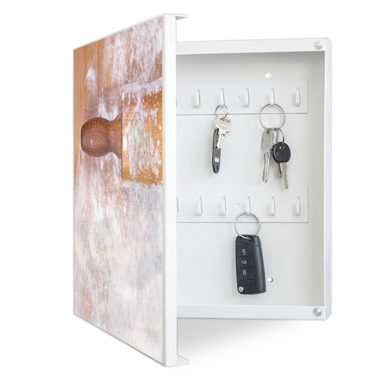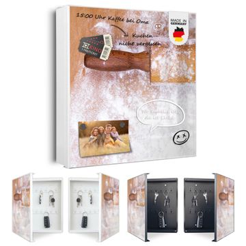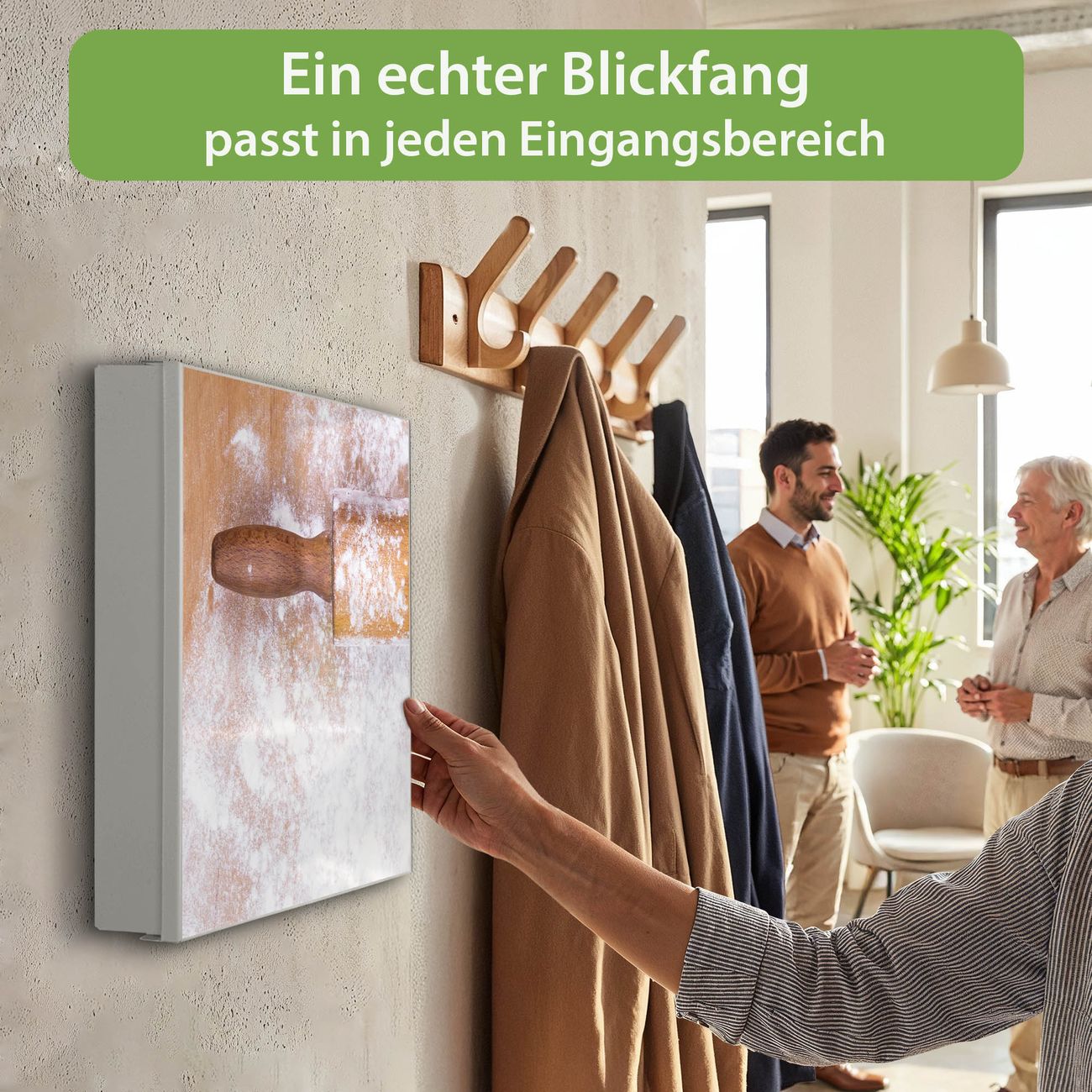 Bringe Ordnung und Eleganz in deinen Eingangsbereich mit dem banjado Schlüsselkasten Motiv Motiv Backen. Die moderne Schlüsselbox kombiniert funktionales Design mit hochwertiger Verarbeitung und wird so zu einem echten Hingucker in Flur, Büro oder Ferienwohnung. ✅ Stilvolle Schlüsselaufbewahrung mit Motiv Motiv Backen Der Design-Schlüsselkasten Motiv Motiv Backen bietet Platz für bis zu 32 Schlüssel, die auf 4 stabilen Reihen mit je 8 Haken übersichtlich verstaut werden. Mit seinen kompakten Maßen von 30 x 30 x 5 cm passt die Schlüsselbox perfekt auch in kleinere Räume. Der weiß lackierte Stahlkorpus mit links angeschlagenem Türscharnier harmoniert mit gedruckten Folie auf der Front und fügt sich nahtlos in jedes Wohnambiente ein. Ob als Schlüsselorganizer für Zuhause oder als praktische Lösung für Büros, Praxen und Gewerbe, der banjado Schlüsselkasten sorgt für Ordnung und Übersicht. Dank der magnetischen, mit Kreidestiften beschreibbaren Folie auf der Front kannst du Notizen anheften oder Termine direkt auf der Oberfläche festhalten. Die Schlüsselbox Motiv Motiv Backen zur Wandmontage wird inklusive Befestigungsmaterial geliefert und ist schnell angebracht. So hast du deine Schlüssel jederzeit griffbereit und zugleich stilvoll verstaut. Mit diesem banjado Schlüsselkasten Motiv Motiv Backen kombinierst du praktische Aufbewahrung mit stilvollem Wohndesign. Ob privat oder geschäftlich, die Schlüsselbox sorgt für mehr Ordnung, Übersicht und ein wohnliches Ambiente.Vorteile im Überblick