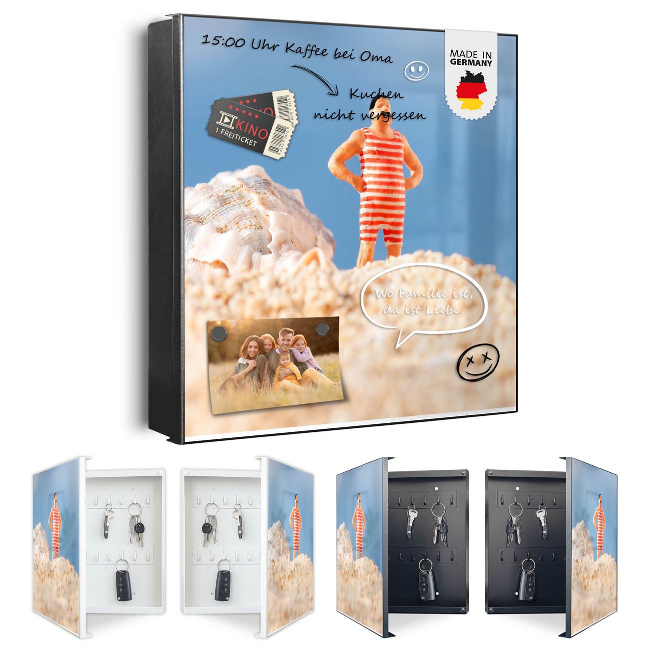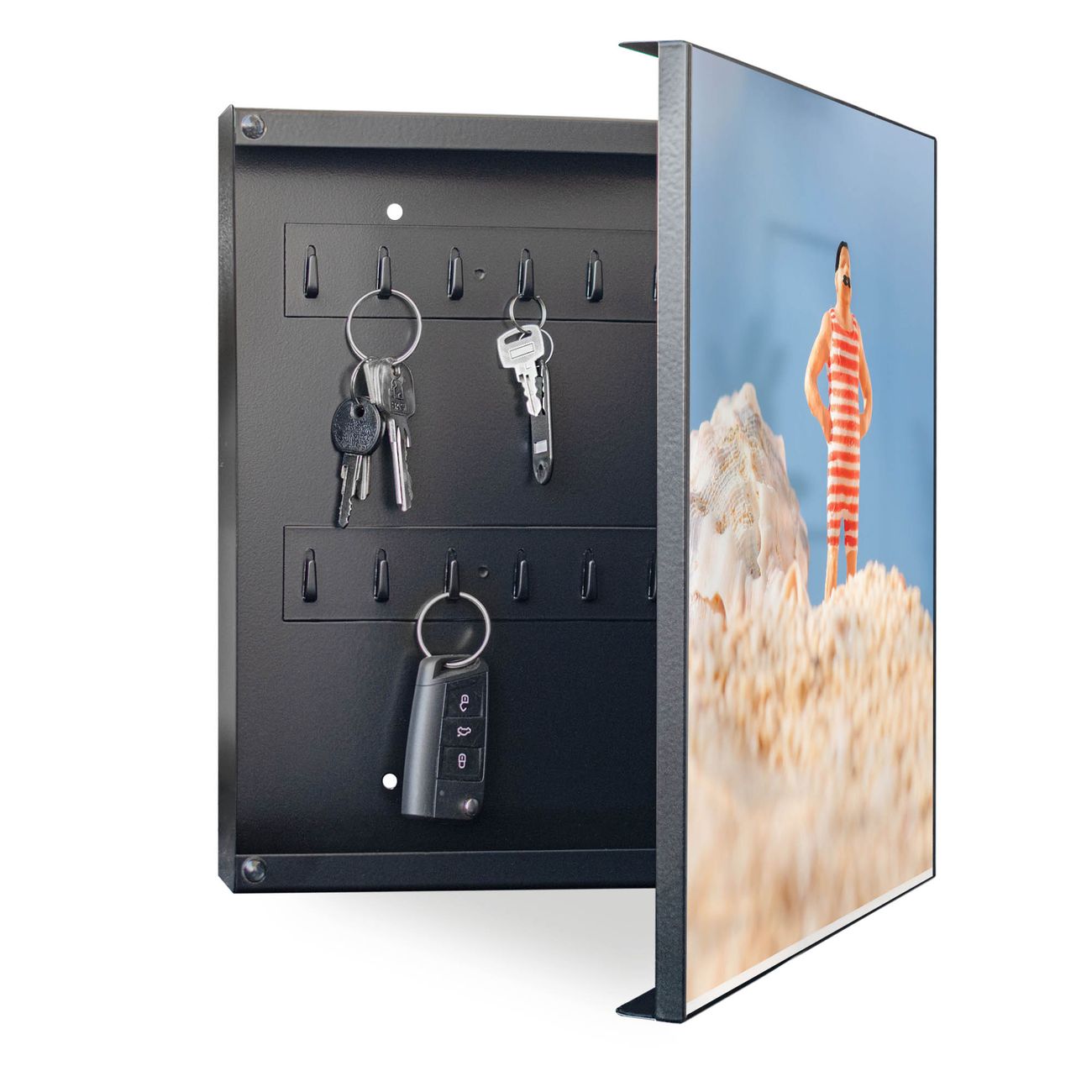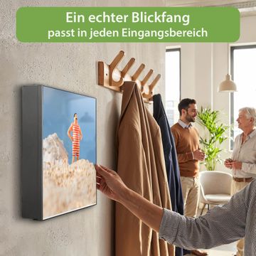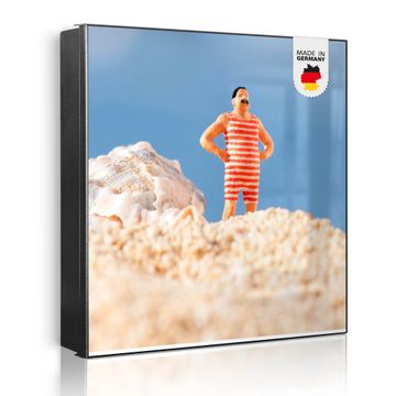 Bringe Ordnung und Eleganz in deinen Eingangsbereich mit dem banjado Schlüsselkasten Motiv Motiv Bademeister. Die moderne Schlüsselbox kombiniert funktionales Design mit hochwertiger Verarbeitung und wird so zu einem echten Hingucker in Flur, Büro oder Ferienwohnung. ✅ Stilvolle Schlüsselaufbewahrung mit Motiv Motiv Bademeister Der Design-Schlüsselkasten Motiv Motiv Bademeister bietet Platz für bis zu 32 Schlüssel, die auf 4 stabilen Reihen mit je 8 Haken übersichtlich verstaut werden. Mit seinen kompakten Maßen von 30 x 30 x 5 cm passt die Schlüsselbox perfekt auch in kleinere Räume. Der schwarz lackierte Stahlkorpus mit rechts angeschlagenem Türscharnier harmoniert mit gedruckten Folie auf der Front und fügt sich nahtlos in jedes Wohnambiente ein. Ob als Schlüsselorganizer für Zuhause oder als praktische Lösung für Büros, Praxen und Gewerbe, der banjado Schlüsselkasten sorgt für Ordnung und Übersicht. Dank der magnetischen, mit Kreidestiften beschreibbaren Folie auf der Front kannst du Notizen anheften oder Termine direkt auf der Oberfläche festhalten. Die Schlüsselbox Motiv Motiv Bademeister zur Wandmontage wird inklusive Befestigungsmaterial geliefert und ist schnell angebracht. So hast du deine Schlüssel jederzeit griffbereit und zugleich stilvoll verstaut. Mit diesem banjado Schlüsselkasten Motiv Motiv Bademeister kombinierst du praktische Aufbewahrung mit stilvollem Wohndesign. Ob privat oder geschäftlich, die Schlüsselbox sorgt für mehr Ordnung, Übersicht und ein wohnliches Ambiente.Vorteile im Überblick