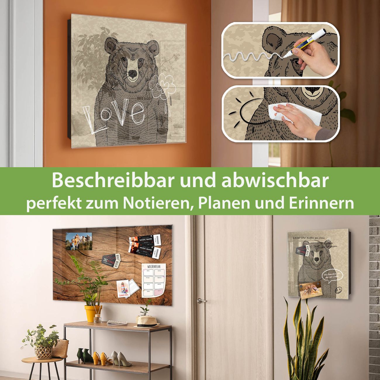 Bringe Ordnung und Eleganz in deinen Eingangsbereich mit dem banjado Schlüsselkasten Motiv Motiv Bär Ohne Brille. Die moderne Schlüsselbox kombiniert funktionales Design mit hochwertiger Verarbeitung und wird so zu einem echten Hingucker in Flur, Büro oder Ferienwohnung. ✅ Stilvolle Schlüsselaufbewahrung mit Glasfront im Motiv Motiv Bär Ohne Brille Der Design-Schlüsselkasten Motiv Motiv Bär Ohne Brille bietet Platz für bis zu 50 Schlüssel, die auf 5 stabilen Reihen mit je 10 Haken übersichtlich verstaut werden. Mit seinen kompakten Maßen von 30 x 30 x 5 cm passt die Schlüsselbox perfekt auch in kleinere Räume. Der schwarz lackierte Stahlkorpus mit rechts angeschlagenem Türscharnier harmoniert mit der Glasfront und fügt sich nahtlos in jedes Wohnambiente ein. Ob als Schlüsselorganizer für Zuhause oder als praktische Lösung für Büros, Praxen und Gewerbe, der banjado Schlüsselkasten sorgt für Ordnung und Übersicht. Dank der magnetischen, mit Kreidestiften beschreibbaren Glasfront kannst du Notizen anheften oder Termine direkt auf der Oberfläche festhalten. Die Schlüsselbox Motiv Motiv Bär Ohne Brille zur Wandmontage wird inklusive Befestigungsmaterial geliefert und ist schnell angebracht. So hast du deine Schlüssel jederzeit griffbereit und zugleich stilvoll verstaut. Mit diesem banjado Schlüsselkasten Motiv Motiv Bär Ohne Brille kombinierst du praktische Aufbewahrung mit stilvollem Wohndesign. Ob privat oder geschäftlich, die Schlüsselbox sorgt für mehr Ordnung, Übersicht und ein wohnliches Ambiente.Vorteile im Überblick