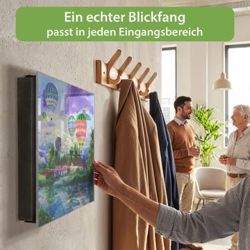 Bringe Ordnung und Eleganz in deinen Eingangsbereich mit dem banjado Schlüsselkasten Motiv Motiv Ballons In Lila Wolken. Die moderne Schlüsselbox kombiniert funktionales Design mit hochwertiger Verarbeitung und wird so zu einem echten Hingucker in Flur, Büro oder Ferienwohnung. ✅ Stilvolle Schlüsselaufbewahrung mit Glasfront im Motiv Motiv Ballons In Lila Wolken Der Design-Schlüsselkasten Motiv Motiv Ballons In Lila Wolken bietet Platz für bis zu 50 Schlüssel, die auf 5 stabilen Reihen mit je 10 Haken übersichtlich verstaut werden. Mit seinen kompakten Maßen von 30 x 30 x 5 cm passt die Schlüsselbox perfekt auch in kleinere Räume. Der schwarz lackierte Stahlkorpus mit rechts angeschlagenem Türscharnier harmoniert mit der Glasfront und fügt sich nahtlos in jedes Wohnambiente ein. Ob als Schlüsselorganizer für Zuhause oder als praktische Lösung für Büros, Praxen und Gewerbe, der banjado Schlüsselkasten sorgt für Ordnung und Übersicht. Dank der magnetischen, mit Kreidestiften beschreibbaren Glasfront kannst du Notizen anheften oder Termine direkt auf der Oberfläche festhalten. Die Schlüsselbox Motiv Motiv Ballons In Lila Wolken zur Wandmontage wird inklusive Befestigungsmaterial geliefert und ist schnell angebracht. So hast du deine Schlüssel jederzeit griffbereit und zugleich stilvoll verstaut. Mit diesem banjado Schlüsselkasten Motiv Motiv Ballons In Lila Wolken kombinierst du praktische Aufbewahrung mit stilvollem Wohndesign. Ob privat oder geschäftlich, die Schlüsselbox sorgt für mehr Ordnung, Übersicht und ein wohnliches Ambiente.Vorteile im Überblick