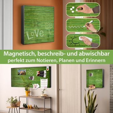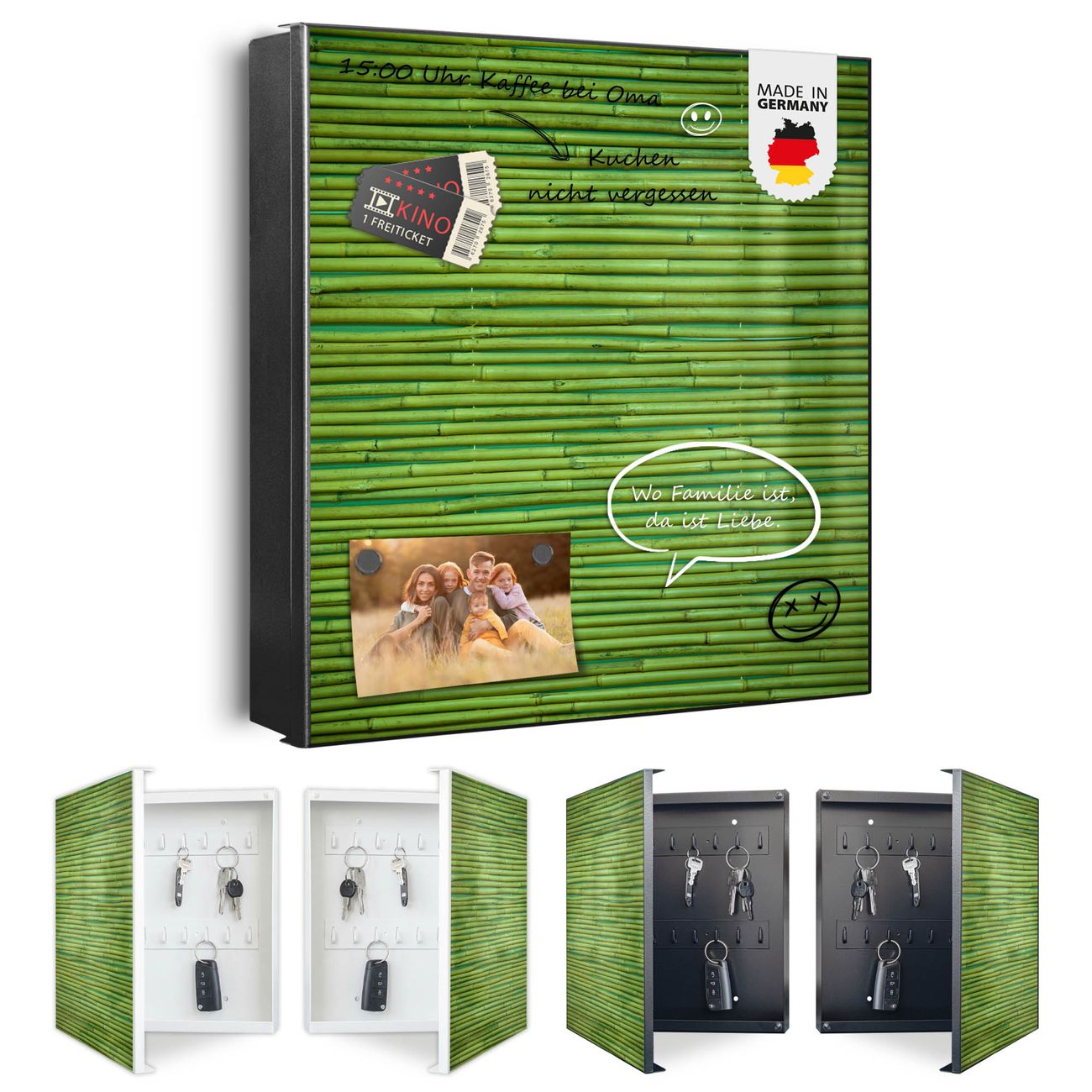 Bringe Ordnung und Eleganz in deinen Eingangsbereich mit dem banjado Schlüsselkasten Motiv Motiv Bambus Grün. Die moderne Schlüsselbox kombiniert funktionales Design mit hochwertiger Verarbeitung und wird so zu einem echten Hingucker in Flur, Büro oder Ferienwohnung. ✅ Stilvolle Schlüsselaufbewahrung mit Motiv Motiv Bambus Grün Der Design-Schlüsselkasten Motiv Motiv Bambus Grün bietet Platz für bis zu 32 Schlüssel, die auf 4 stabilen Reihen mit je 8 Haken übersichtlich verstaut werden. Mit seinen kompakten Maßen von 30 x 30 x 5 cm passt die Schlüsselbox perfekt auch in kleinere Räume. Der schwarz lackierte Stahlkorpus mit rechts angeschlagenem Türscharnier harmoniert mit gedruckten Folie auf der Front und fügt sich nahtlos in jedes Wohnambiente ein. Ob als Schlüsselorganizer für Zuhause oder als praktische Lösung für Büros, Praxen und Gewerbe, der banjado Schlüsselkasten sorgt für Ordnung und Übersicht. Dank der magnetischen, mit Kreidestiften beschreibbaren Folie auf der Front kannst du Notizen anheften oder Termine direkt auf der Oberfläche festhalten. Die Schlüsselbox Motiv Motiv Bambus Grün zur Wandmontage wird inklusive Befestigungsmaterial geliefert und ist schnell angebracht. So hast du deine Schlüssel jederzeit griffbereit und zugleich stilvoll verstaut. Mit diesem banjado Schlüsselkasten Motiv Motiv Bambus Grün kombinierst du praktische Aufbewahrung mit stilvollem Wohndesign. Ob privat oder geschäftlich, die Schlüsselbox sorgt für mehr Ordnung, Übersicht und ein wohnliches Ambiente.Vorteile im Überblick