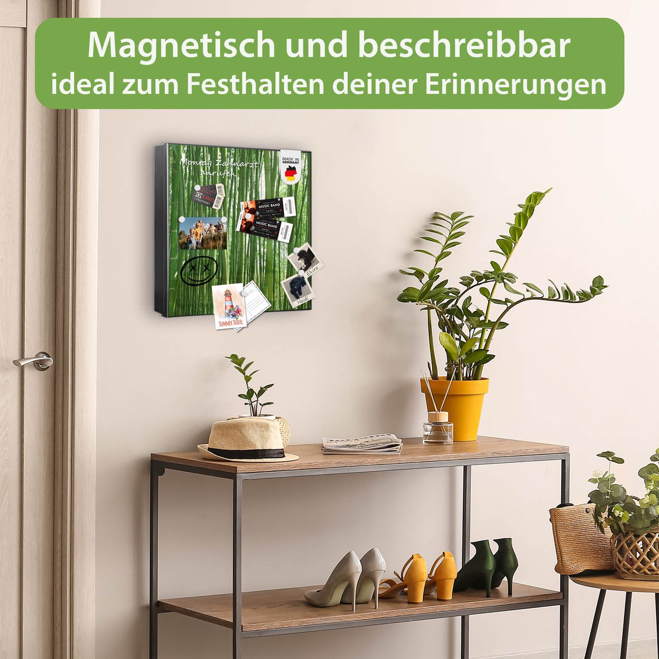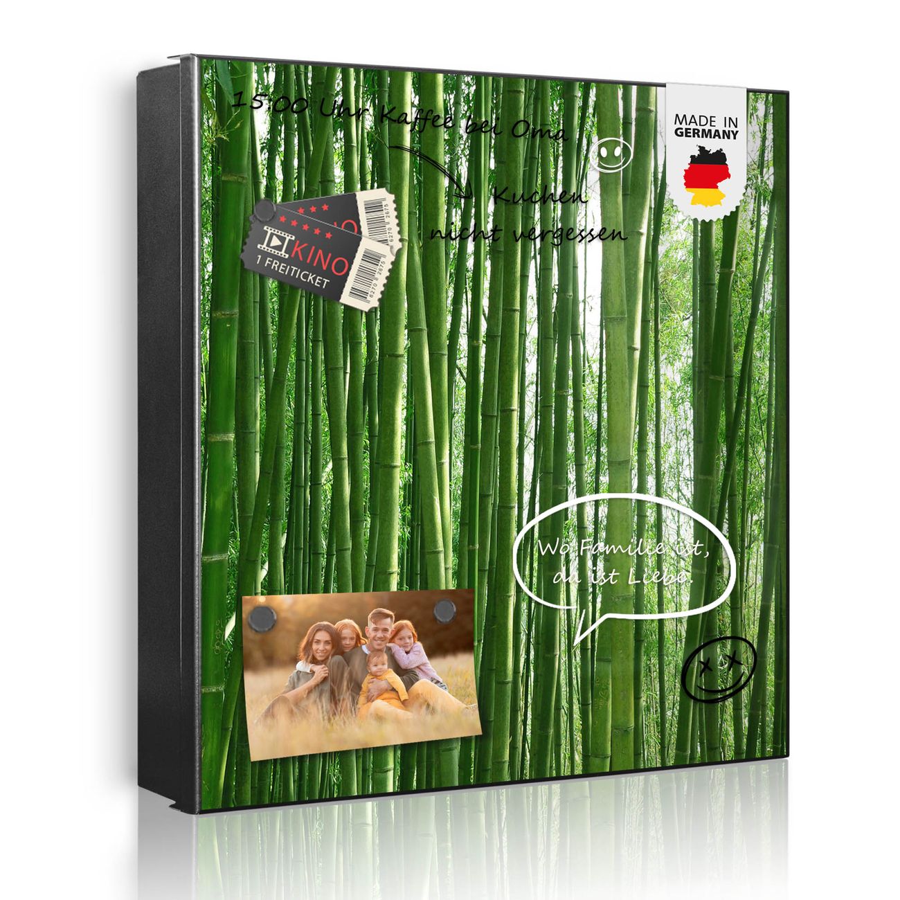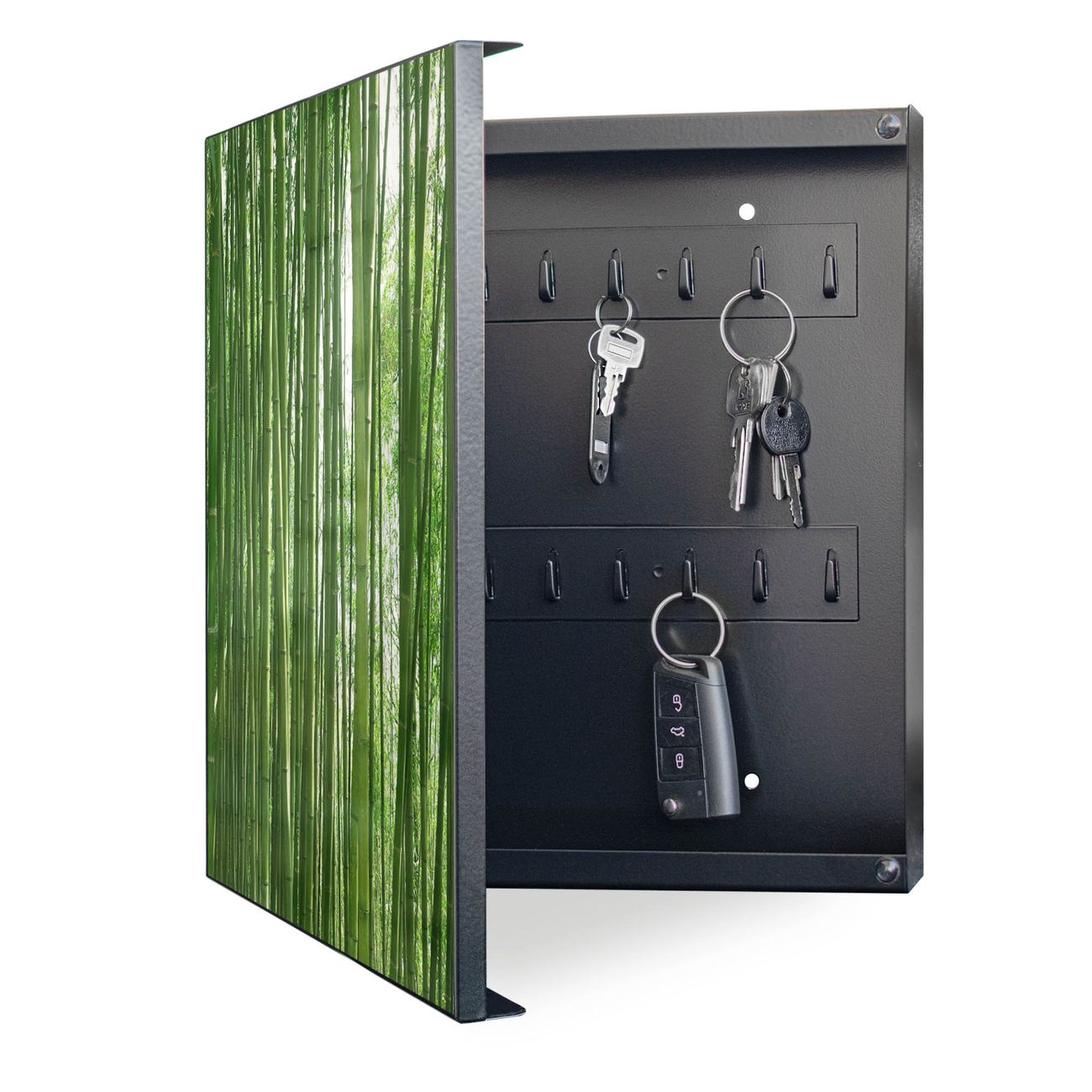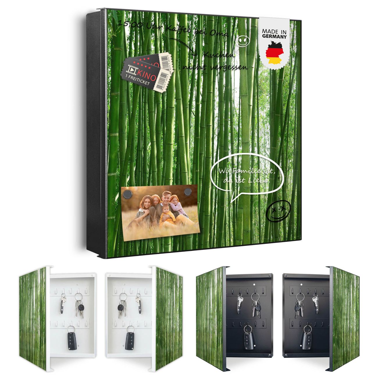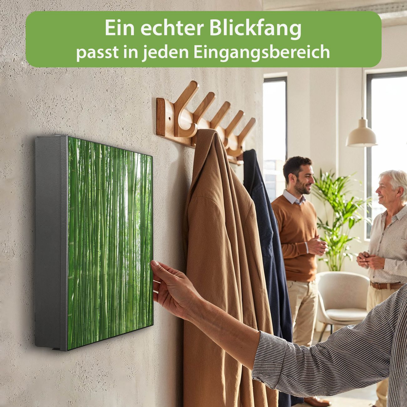 Bringe Ordnung und Eleganz in deinen Eingangsbereich mit dem banjado Schlüsselkasten Motiv Motiv Bambus. Die moderne Schlüsselbox kombiniert funktionales Design mit hochwertiger Verarbeitung und wird so zu einem echten Hingucker in Flur, Büro oder Ferienwohnung. ✅ Stilvolle Schlüsselaufbewahrung mit Motiv Motiv Bambus Der Design-Schlüsselkasten Motiv Motiv Bambus bietet Platz für bis zu 32 Schlüssel, die auf 4 stabilen Reihen mit je 8 Haken übersichtlich verstaut werden. Mit seinen kompakten Maßen von 30 x 30 x 5 cm passt die Schlüsselbox perfekt auch in kleinere Räume. Der schwarz lackierte Stahlkorpus mit links angeschlagenem Türscharnier harmoniert mit gedruckten Folie auf der Front und fügt sich nahtlos in jedes Wohnambiente ein. Ob als Schlüsselorganizer für Zuhause oder als praktische Lösung für Büros, Praxen und Gewerbe, der banjado Schlüsselkasten sorgt für Ordnung und Übersicht. Dank der magnetischen, mit Kreidestiften beschreibbaren Folie auf der Front kannst du Notizen anheften oder Termine direkt auf der Oberfläche festhalten. Die Schlüsselbox Motiv Motiv Bambus zur Wandmontage wird inklusive Befestigungsmaterial geliefert und ist schnell angebracht. So hast du deine Schlüssel jederzeit griffbereit und zugleich stilvoll verstaut. Mit diesem banjado Schlüsselkasten Motiv Motiv Bambus kombinierst du praktische Aufbewahrung mit stilvollem Wohndesign. Ob privat oder geschäftlich, die Schlüsselbox sorgt für mehr Ordnung, Übersicht und ein wohnliches Ambiente.Vorteile im Überblick