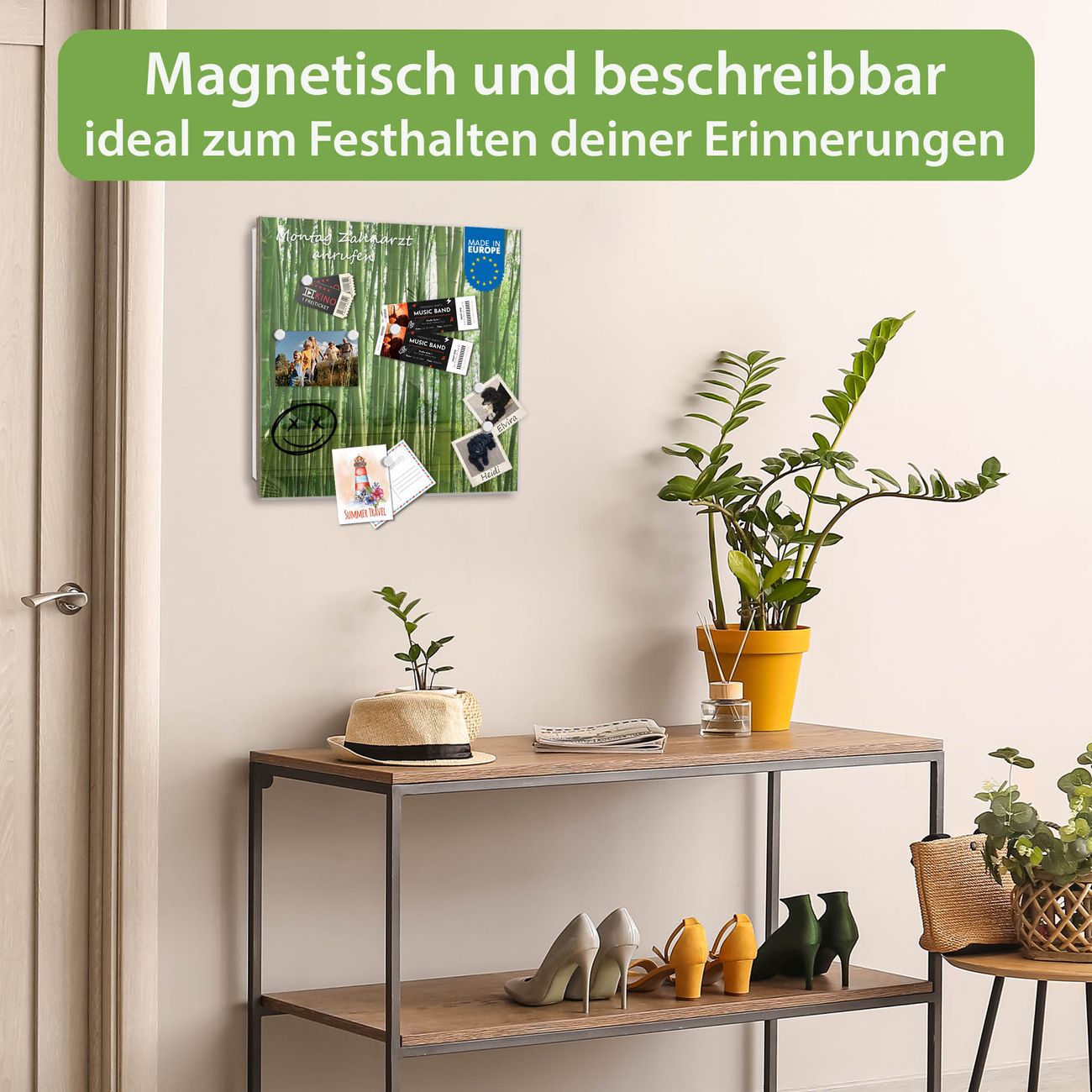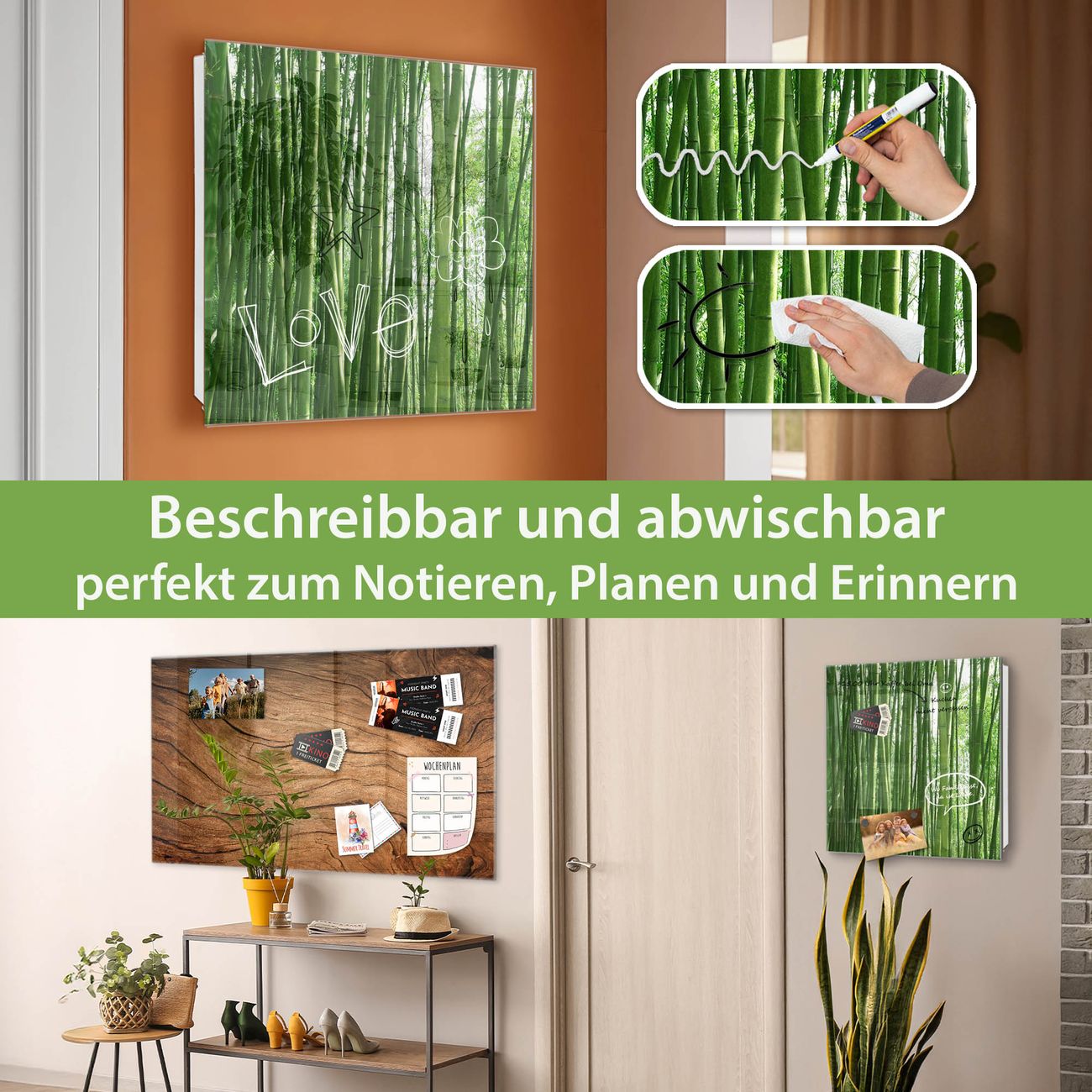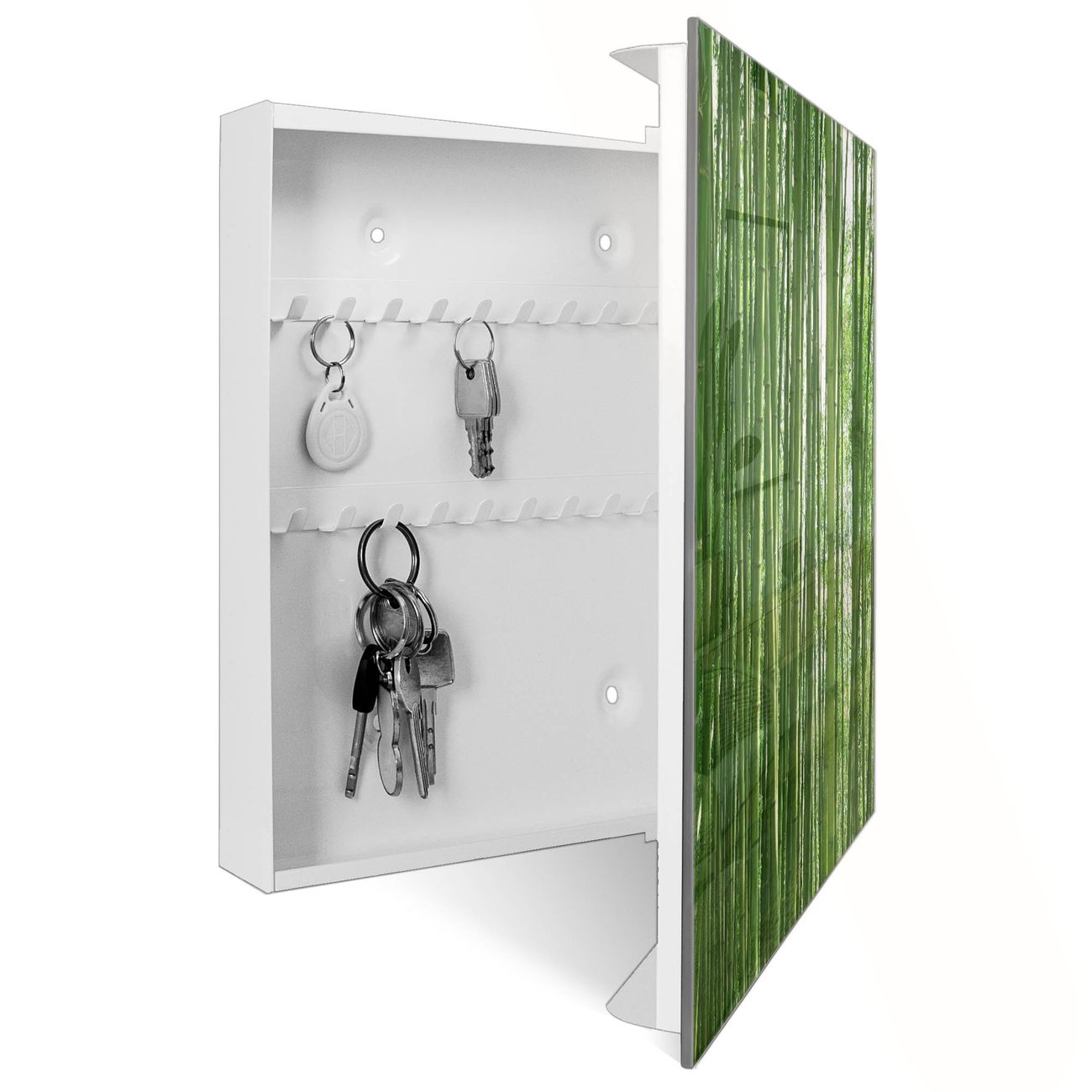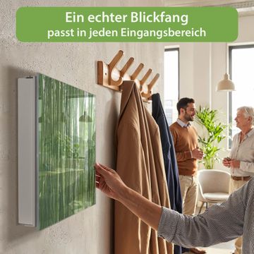 Bringe Ordnung und Eleganz in deinen Eingangsbereich mit dem banjado Schlüsselkasten Motiv Motiv Bambus. Die moderne Schlüsselbox kombiniert funktionales Design mit hochwertiger Verarbeitung und wird so zu einem echten Hingucker in Flur, Büro oder Ferienwohnung. ✅ Stilvolle Schlüsselaufbewahrung mit Glasfront im Motiv Motiv Bambus Der Design-Schlüsselkasten Motiv Motiv Bambus bietet Platz für bis zu 50 Schlüssel, die auf 5 stabilen Reihen mit je 10 Haken übersichtlich verstaut werden. Mit seinen kompakten Maßen von 30 x 30 x 5 cm passt die Schlüsselbox perfekt auch in kleinere Räume. Der weiß lackierte Stahlkorpus mit rechts angeschlagenem Türscharnier harmoniert mit der Glasfront und fügt sich nahtlos in jedes Wohnambiente ein. Ob als Schlüsselorganizer für Zuhause oder als praktische Lösung für Büros, Praxen und Gewerbe, der banjado Schlüsselkasten sorgt für Ordnung und Übersicht. Dank der magnetischen, mit Kreidestiften beschreibbaren Glasfront kannst du Notizen anheften oder Termine direkt auf der Oberfläche festhalten. Die Schlüsselbox Motiv Motiv Bambus zur Wandmontage wird inklusive Befestigungsmaterial geliefert und ist schnell angebracht. So hast du deine Schlüssel jederzeit griffbereit und zugleich stilvoll verstaut. Mit diesem banjado Schlüsselkasten Motiv Motiv Bambus kombinierst du praktische Aufbewahrung mit stilvollem Wohndesign. Ob privat oder geschäftlich, die Schlüsselbox sorgt für mehr Ordnung, Übersicht und ein wohnliches Ambiente.Vorteile im Überblick
