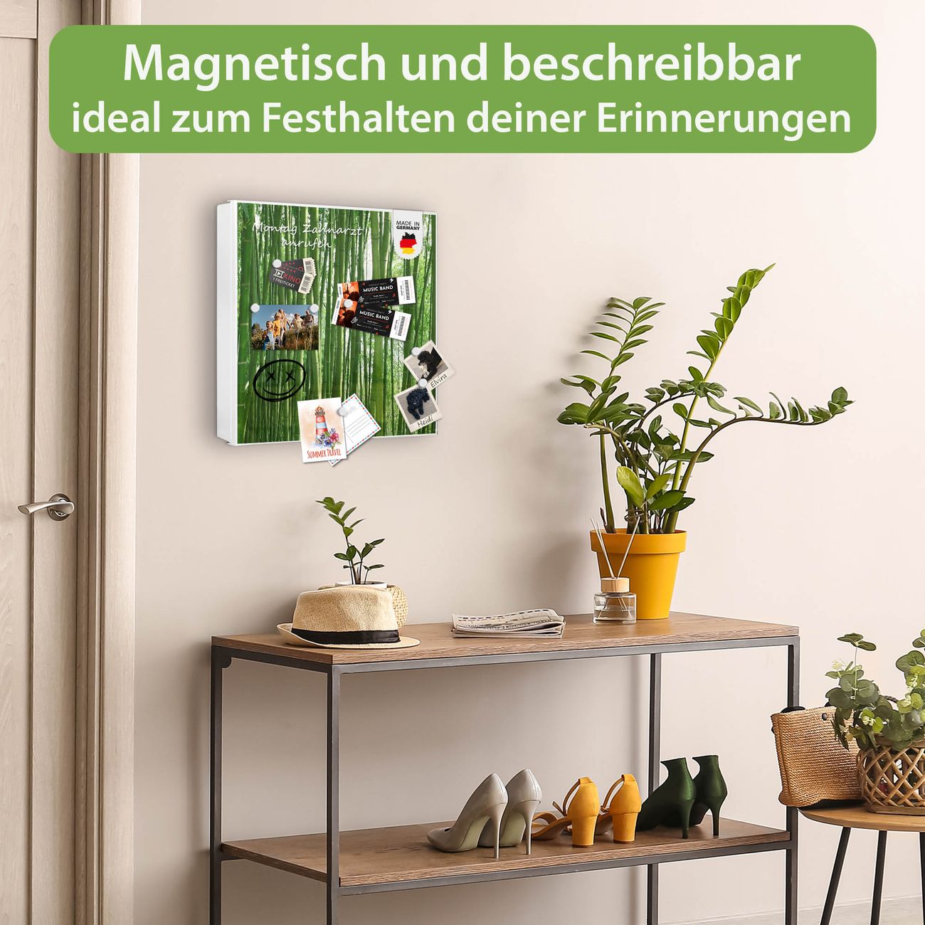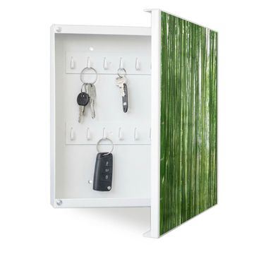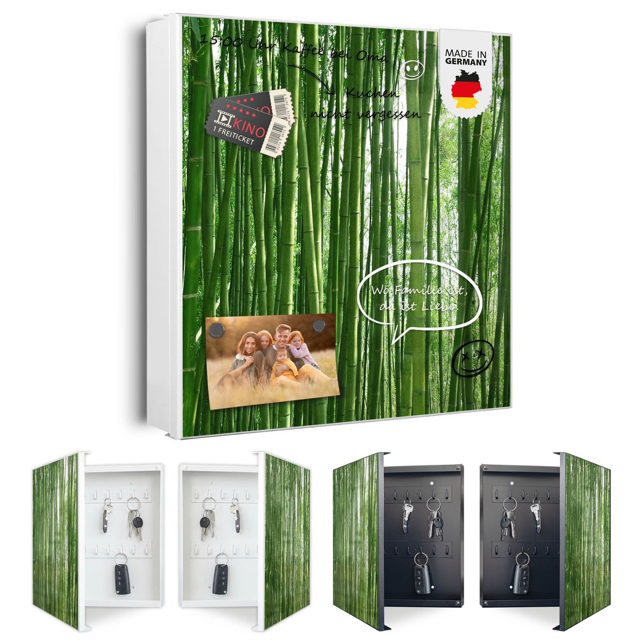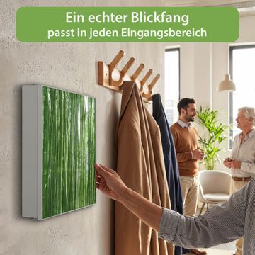 Bringe Ordnung und Eleganz in deinen Eingangsbereich mit dem banjado Schlüsselkasten Motiv Motiv Bambus. Die moderne Schlüsselbox kombiniert funktionales Design mit hochwertiger Verarbeitung und wird so zu einem echten Hingucker in Flur, Büro oder Ferienwohnung. ✅ Stilvolle Schlüsselaufbewahrung mit Motiv Motiv Bambus Der Design-Schlüsselkasten Motiv Motiv Bambus bietet Platz für bis zu 32 Schlüssel, die auf 4 stabilen Reihen mit je 8 Haken übersichtlich verstaut werden. Mit seinen kompakten Maßen von 30 x 30 x 5 cm passt die Schlüsselbox perfekt auch in kleinere Räume. Der weiß lackierte Stahlkorpus mit rechts angeschlagenem Türscharnier harmoniert mit gedruckten Folie auf der Front und fügt sich nahtlos in jedes Wohnambiente ein. Ob als Schlüsselorganizer für Zuhause oder als praktische Lösung für Büros, Praxen und Gewerbe, der banjado Schlüsselkasten sorgt für Ordnung und Übersicht. Dank der magnetischen, mit Kreidestiften beschreibbaren Folie auf der Front kannst du Notizen anheften oder Termine direkt auf der Oberfläche festhalten. Die Schlüsselbox Motiv Motiv Bambus zur Wandmontage wird inklusive Befestigungsmaterial geliefert und ist schnell angebracht. So hast du deine Schlüssel jederzeit griffbereit und zugleich stilvoll verstaut. Mit diesem banjado Schlüsselkasten Motiv Motiv Bambus kombinierst du praktische Aufbewahrung mit stilvollem Wohndesign. Ob privat oder geschäftlich, die Schlüsselbox sorgt für mehr Ordnung, Übersicht und ein wohnliches Ambiente.Vorteile im Überblick