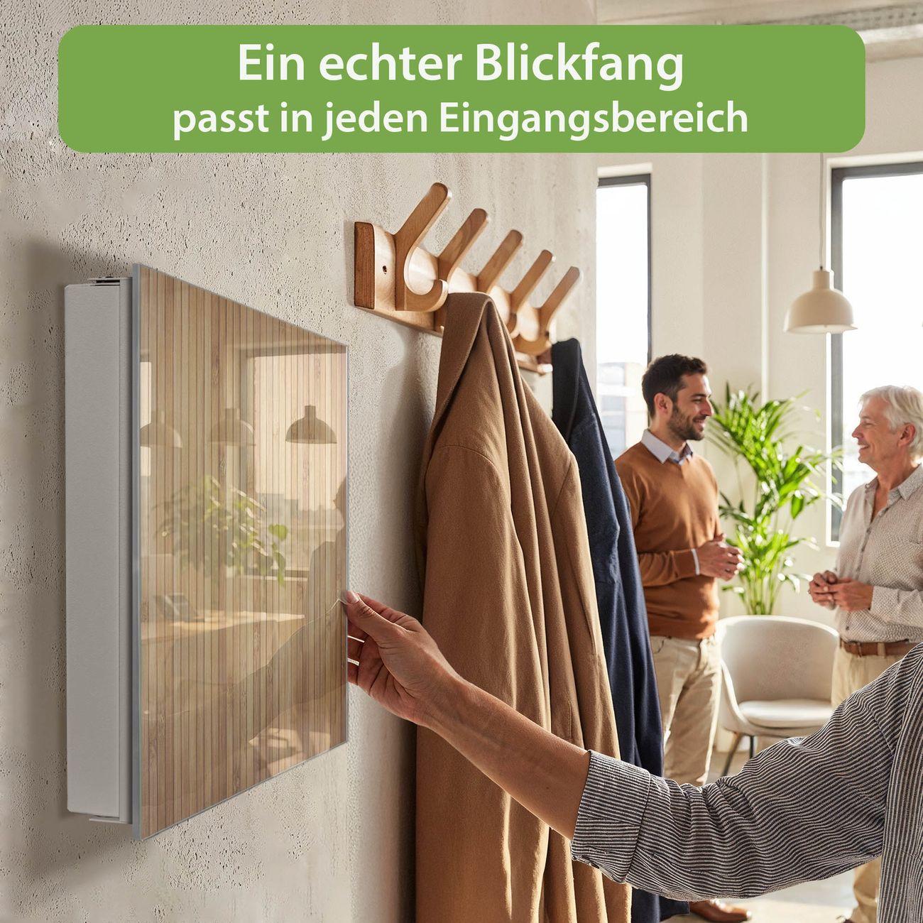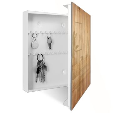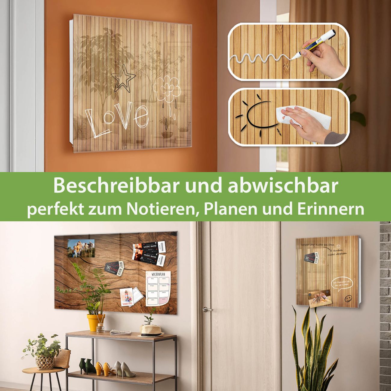 Bringe Ordnung und Eleganz in deinen Eingangsbereich mit dem banjado Schlüsselkasten Motiv Motiv Bambusholz. Die moderne Schlüsselbox kombiniert funktionales Design mit hochwertiger Verarbeitung und wird so zu einem echten Hingucker in Flur, Büro oder Ferienwohnung. ✅ Stilvolle Schlüsselaufbewahrung mit Glasfront im Motiv Motiv Bambusholz Der Design-Schlüsselkasten Motiv Motiv Bambusholz bietet Platz für bis zu 50 Schlüssel, die auf 5 stabilen Reihen mit je 10 Haken übersichtlich verstaut werden. Mit seinen kompakten Maßen von 30 x 30 x 5 cm passt die Schlüsselbox perfekt auch in kleinere Räume. Der weiß lackierte Stahlkorpus mit rechts angeschlagenem Türscharnier harmoniert mit der Glasfront und fügt sich nahtlos in jedes Wohnambiente ein. Ob als Schlüsselorganizer für Zuhause oder als praktische Lösung für Büros, Praxen und Gewerbe, der banjado Schlüsselkasten sorgt für Ordnung und Übersicht. Dank der magnetischen, mit Kreidestiften beschreibbaren Glasfront kannst du Notizen anheften oder Termine direkt auf der Oberfläche festhalten. Die Schlüsselbox Motiv Motiv Bambusholz zur Wandmontage wird inklusive Befestigungsmaterial geliefert und ist schnell angebracht. So hast du deine Schlüssel jederzeit griffbereit und zugleich stilvoll verstaut. Mit diesem banjado Schlüsselkasten Motiv Motiv Bambusholz kombinierst du praktische Aufbewahrung mit stilvollem Wohndesign. Ob privat oder geschäftlich, die Schlüsselbox sorgt für mehr Ordnung, Übersicht und ein wohnliches Ambiente.Vorteile im Überblick
