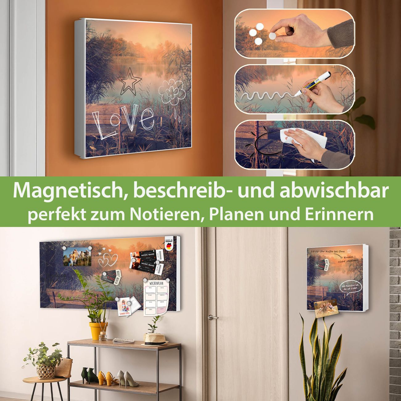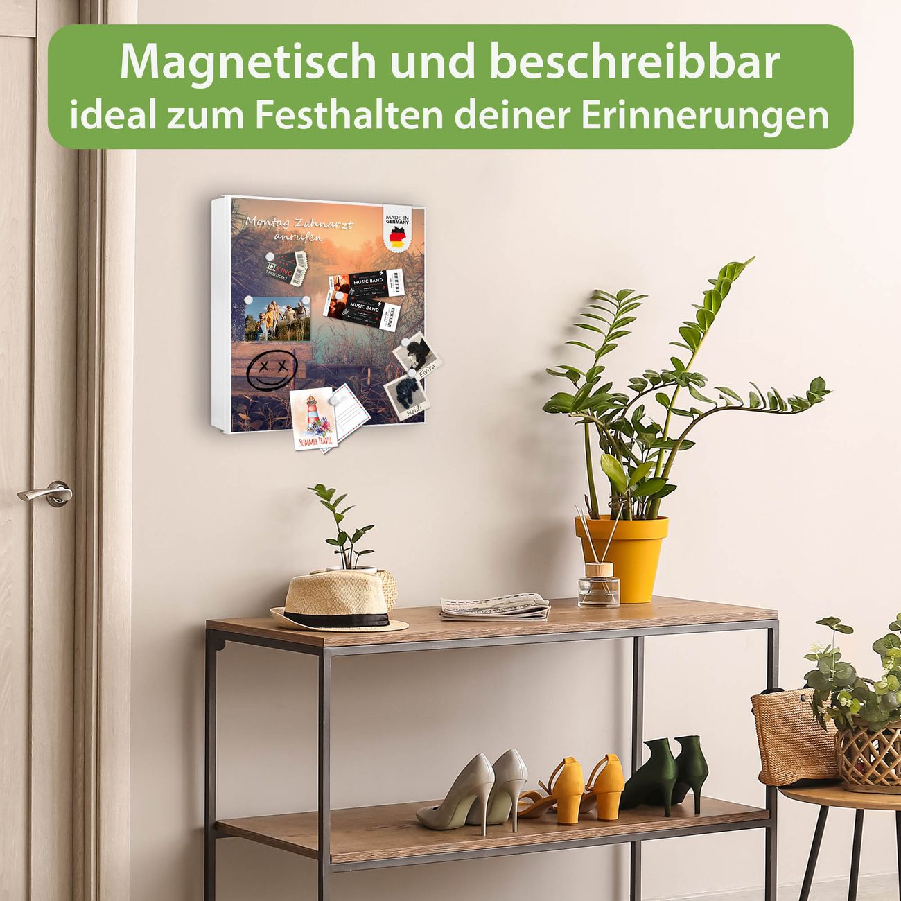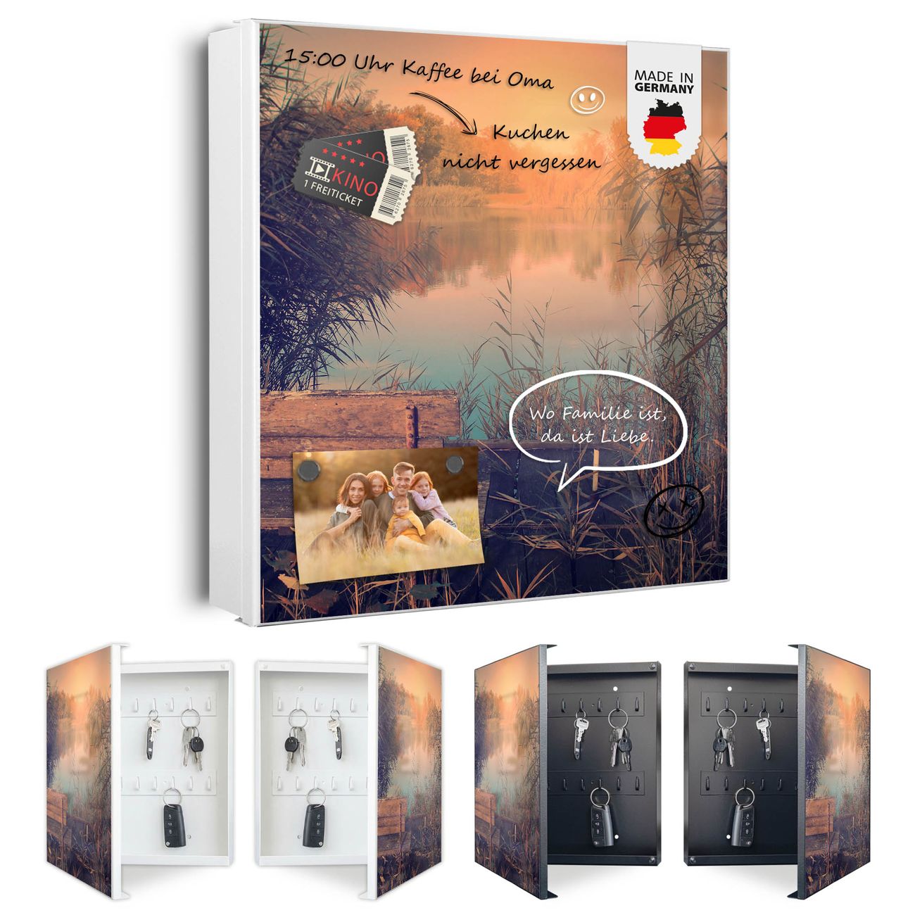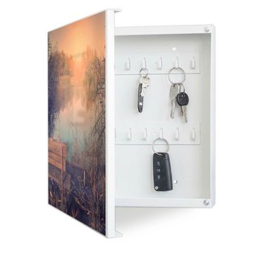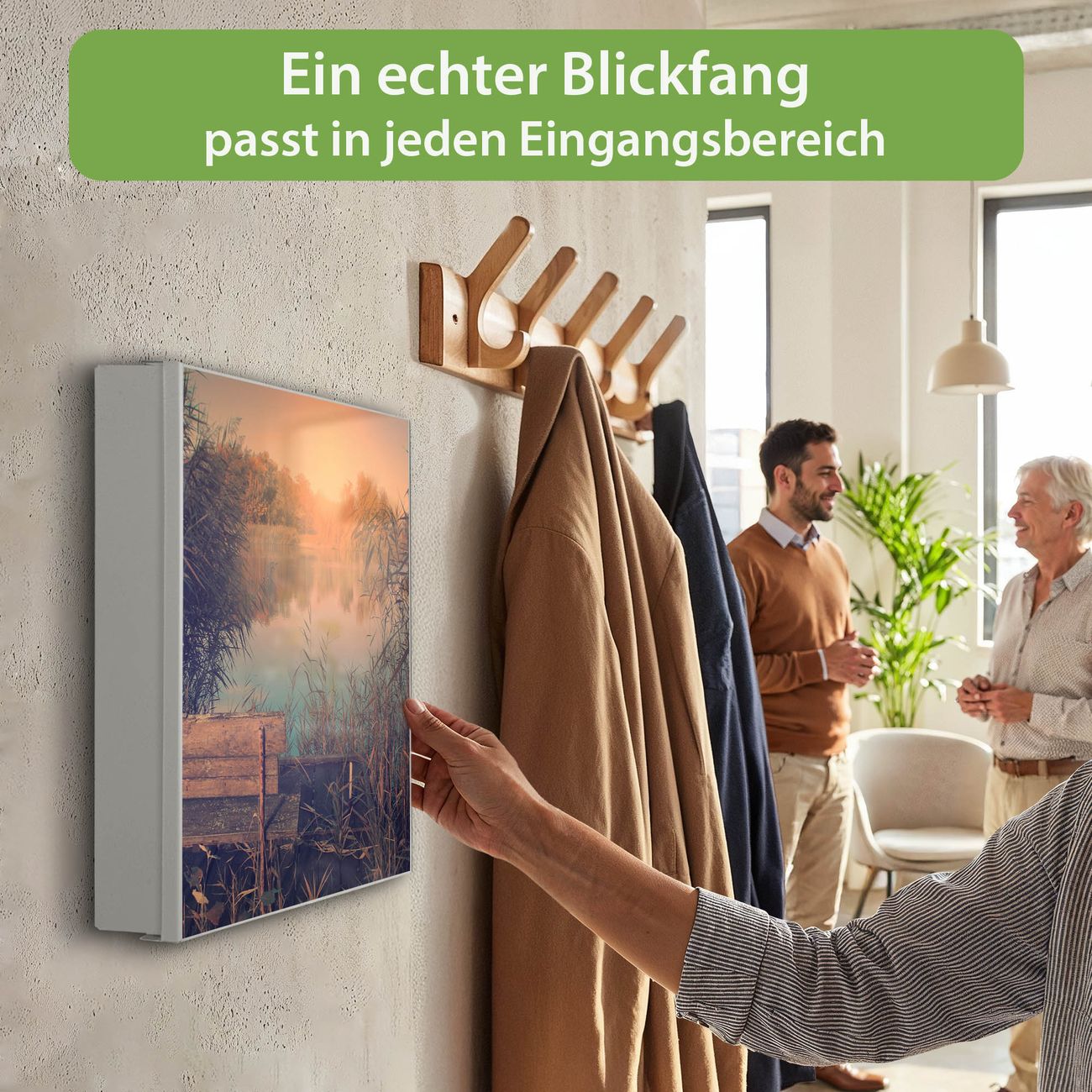 Bringe Ordnung und Eleganz in deinen Eingangsbereich mit dem banjado Schlüsselkasten Motiv Motiv Bank Am See. Die moderne Schlüsselbox kombiniert funktionales Design mit hochwertiger Verarbeitung und wird so zu einem echten Hingucker in Flur, Büro oder Ferienwohnung. ✅ Stilvolle Schlüsselaufbewahrung mit Motiv Motiv Bank Am See Der Design-Schlüsselkasten Motiv Motiv Bank Am See bietet Platz für bis zu 32 Schlüssel, die auf 4 stabilen Reihen mit je 8 Haken übersichtlich verstaut werden. Mit seinen kompakten Maßen von 30 x 30 x 5 cm passt die Schlüsselbox perfekt auch in kleinere Räume. Der weiß lackierte Stahlkorpus mit links angeschlagenem Türscharnier harmoniert mit gedruckten Folie auf der Front und fügt sich nahtlos in jedes Wohnambiente ein. Ob als Schlüsselorganizer für Zuhause oder als praktische Lösung für Büros, Praxen und Gewerbe, der banjado Schlüsselkasten sorgt für Ordnung und Übersicht. Dank der magnetischen, mit Kreidestiften beschreibbaren Folie auf der Front kannst du Notizen anheften oder Termine direkt auf der Oberfläche festhalten. Die Schlüsselbox Motiv Motiv Bank Am See zur Wandmontage wird inklusive Befestigungsmaterial geliefert und ist schnell angebracht. So hast du deine Schlüssel jederzeit griffbereit und zugleich stilvoll verstaut. Mit diesem banjado Schlüsselkasten Motiv Motiv Bank Am See kombinierst du praktische Aufbewahrung mit stilvollem Wohndesign. Ob privat oder geschäftlich, die Schlüsselbox sorgt für mehr Ordnung, Übersicht und ein wohnliches Ambiente.Vorteile im Überblick