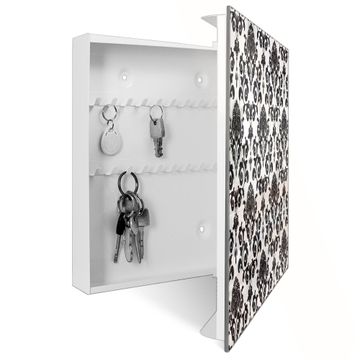 Bringe Ordnung und Eleganz in deinen Eingangsbereich mit dem banjado Schlüsselkasten Motiv Motiv Barock. Die moderne Schlüsselbox kombiniert funktionales Design mit hochwertiger Verarbeitung und wird so zu einem echten Hingucker in Flur, Büro oder Ferienwohnung. ✅ Stilvolle Schlüsselaufbewahrung mit Glasfront im Motiv Motiv Barock Der Design-Schlüsselkasten Motiv Motiv Barock bietet Platz für bis zu 50 Schlüssel, die auf 5 stabilen Reihen mit je 10 Haken übersichtlich verstaut werden. Mit seinen kompakten Maßen von 30 x 30 x 5 cm passt die Schlüsselbox perfekt auch in kleinere Räume. Der weiß lackierte Stahlkorpus mit rechts angeschlagenem Türscharnier harmoniert mit der Glasfront und fügt sich nahtlos in jedes Wohnambiente ein. Ob als Schlüsselorganizer für Zuhause oder als praktische Lösung für Büros, Praxen und Gewerbe, der banjado Schlüsselkasten sorgt für Ordnung und Übersicht. Dank der magnetischen, mit Kreidestiften beschreibbaren Glasfront kannst du Notizen anheften oder Termine direkt auf der Oberfläche festhalten. Die Schlüsselbox Motiv Motiv Barock zur Wandmontage wird inklusive Befestigungsmaterial geliefert und ist schnell angebracht. So hast du deine Schlüssel jederzeit griffbereit und zugleich stilvoll verstaut. Mit diesem banjado Schlüsselkasten Motiv Motiv Barock kombinierst du praktische Aufbewahrung mit stilvollem Wohndesign. Ob privat oder geschäftlich, die Schlüsselbox sorgt für mehr Ordnung, Übersicht und ein wohnliches Ambiente.Vorteile im Überblick