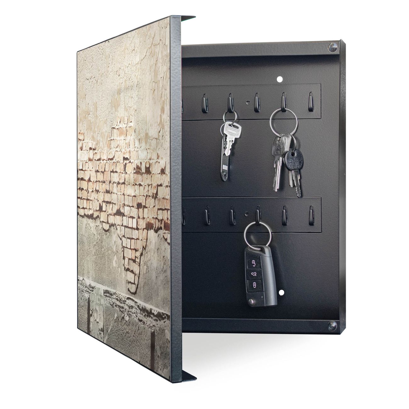 Bringe Ordnung und Eleganz in deinen Eingangsbereich mit dem banjado Schlüsselkasten Motiv Motiv Baulücke. Die moderne Schlüsselbox kombiniert funktionales Design mit hochwertiger Verarbeitung und wird so zu einem echten Hingucker in Flur, Büro oder Ferienwohnung. ✅ Stilvolle Schlüsselaufbewahrung mit Motiv Motiv Baulücke Der Design-Schlüsselkasten Motiv Motiv Baulücke bietet Platz für bis zu 32 Schlüssel, die auf 4 stabilen Reihen mit je 8 Haken übersichtlich verstaut werden. Mit seinen kompakten Maßen von 30 x 30 x 5 cm passt die Schlüsselbox perfekt auch in kleinere Räume. Der schwarz lackierte Stahlkorpus mit links angeschlagenem Türscharnier harmoniert mit gedruckten Folie auf der Front und fügt sich nahtlos in jedes Wohnambiente ein. Ob als Schlüsselorganizer für Zuhause oder als praktische Lösung für Büros, Praxen und Gewerbe, der banjado Schlüsselkasten sorgt für Ordnung und Übersicht. Dank der magnetischen, mit Kreidestiften beschreibbaren Folie auf der Front kannst du Notizen anheften oder Termine direkt auf der Oberfläche festhalten. Die Schlüsselbox Motiv Motiv Baulücke zur Wandmontage wird inklusive Befestigungsmaterial geliefert und ist schnell angebracht. So hast du deine Schlüssel jederzeit griffbereit und zugleich stilvoll verstaut. Mit diesem banjado Schlüsselkasten Motiv Motiv Baulücke kombinierst du praktische Aufbewahrung mit stilvollem Wohndesign. Ob privat oder geschäftlich, die Schlüsselbox sorgt für mehr Ordnung, Übersicht und ein wohnliches Ambiente.Vorteile im Überblick