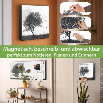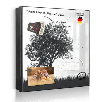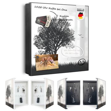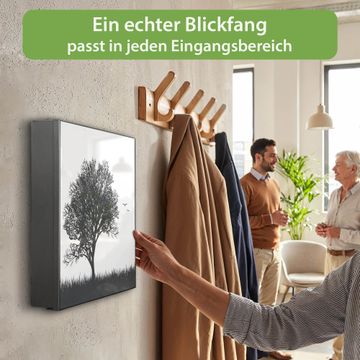 Bringe Ordnung und Eleganz in deinen Eingangsbereich mit dem banjado Schlüsselkasten Motiv Motiv Baum und Vögel Silhouette. Die moderne Schlüsselbox kombiniert funktionales Design mit hochwertiger Verarbeitung und wird so zu einem echten Hingucker in Flur, Büro oder Ferienwohnung. ✅ Stilvolle Schlüsselaufbewahrung mit Motiv Motiv Baum und Vögel Silhouette Der Design-Schlüsselkasten Motiv Motiv Baum und Vögel Silhouette bietet Platz für bis zu 32 Schlüssel, die auf 4 stabilen Reihen mit je 8 Haken übersichtlich verstaut werden. Mit seinen kompakten Maßen von 30 x 30 x 5 cm passt die Schlüsselbox perfekt auch in kleinere Räume. Der schwarz lackierte Stahlkorpus mit links angeschlagenem Türscharnier harmoniert mit gedruckten Folie auf der Front und fügt sich nahtlos in jedes Wohnambiente ein. Ob als Schlüsselorganizer für Zuhause oder als praktische Lösung für Büros, Praxen und Gewerbe, der banjado Schlüsselkasten sorgt für Ordnung und Übersicht. Dank der magnetischen, mit Kreidestiften beschreibbaren Folie auf der Front kannst du Notizen anheften oder Termine direkt auf der Oberfläche festhalten. Die Schlüsselbox Motiv Motiv Baum und Vögel Silhouette zur Wandmontage wird inklusive Befestigungsmaterial geliefert und ist schnell angebracht. So hast du deine Schlüssel jederzeit griffbereit und zugleich stilvoll verstaut. Mit diesem banjado Schlüsselkasten Motiv Motiv Baum und Vögel Silhouette kombinierst du praktische Aufbewahrung mit stilvollem Wohndesign. Ob privat oder geschäftlich, die Schlüsselbox sorgt für mehr Ordnung, Übersicht und ein wohnliches Ambiente.Vorteile im Überblick